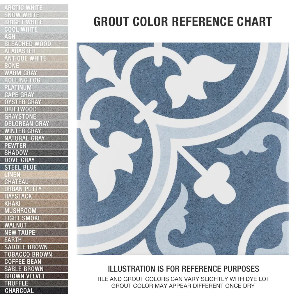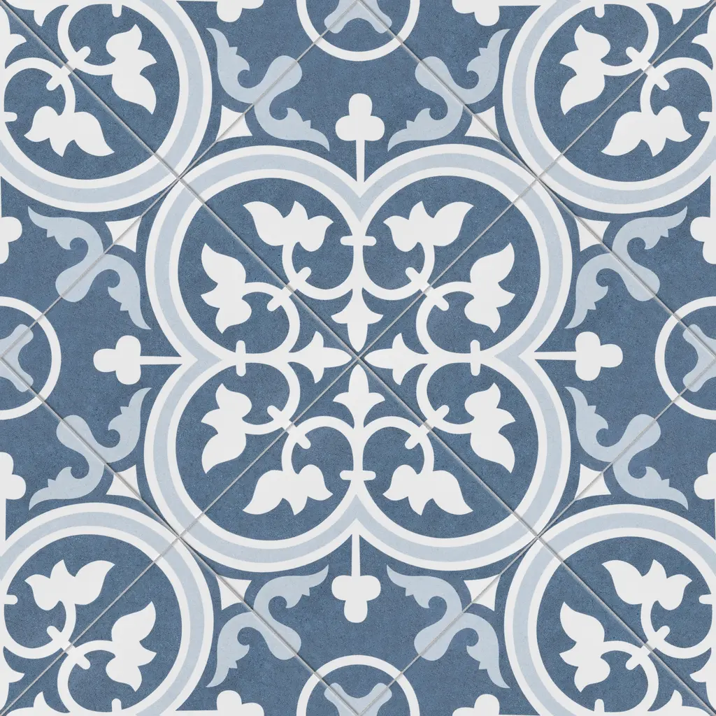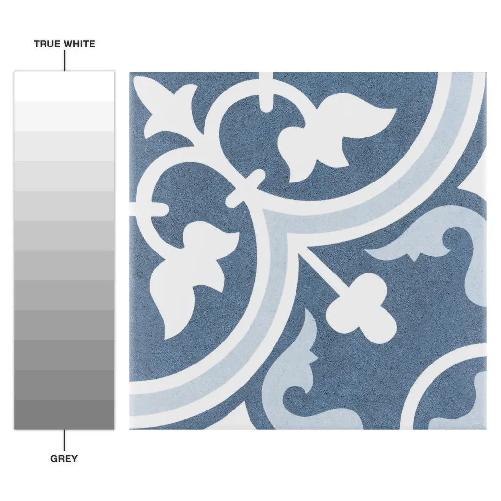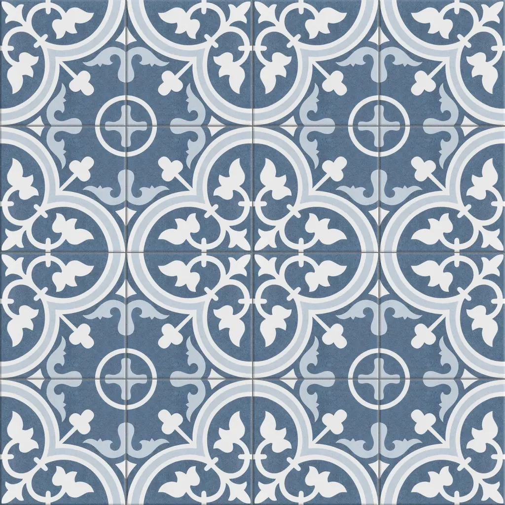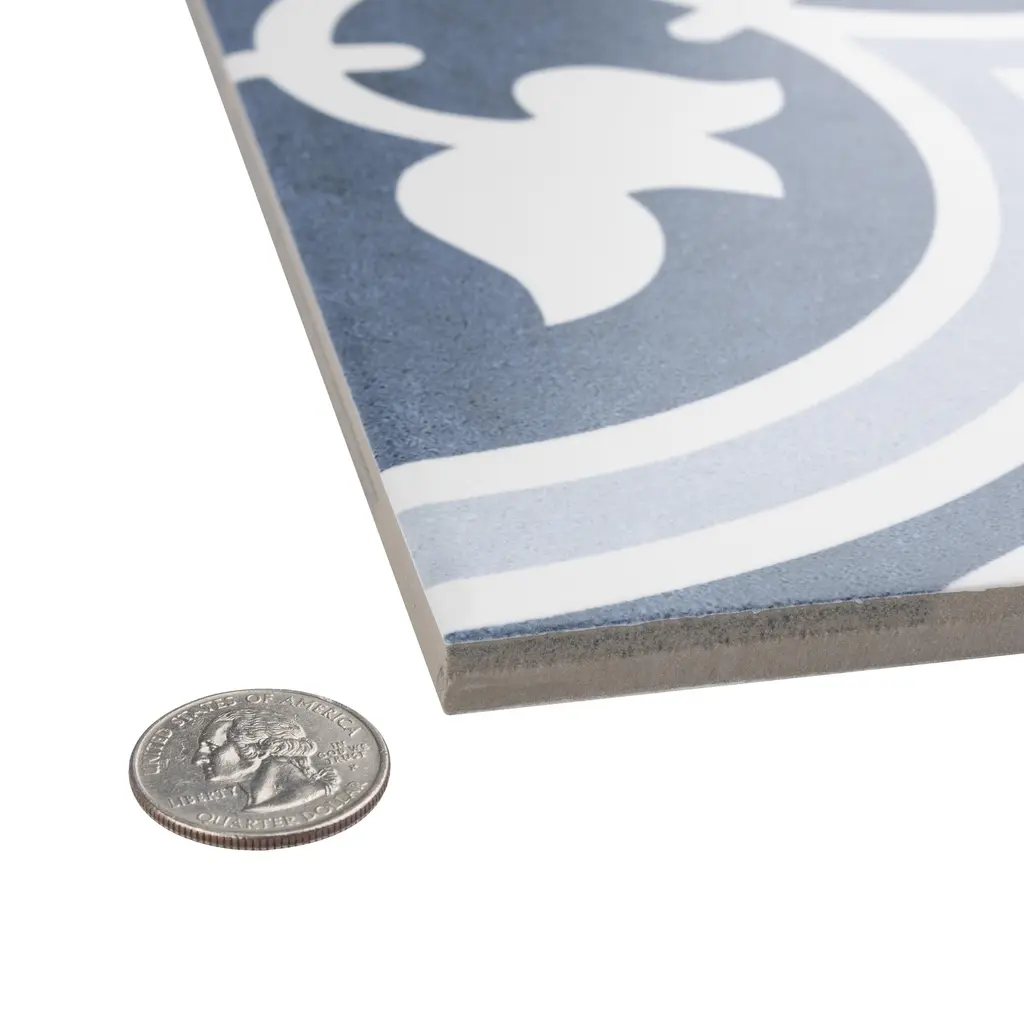 Capturing the appearance of an encaustic look, our Arte Artic Porcelain Floor and Wall Tile features a smooth, satin finish, providing decorative appeal that adapts to a variety of stylistic contexts. With its impervious, frost-resistant features, this blue square tile is an ideal selection for a variety of spaces including indoor and outdoor residential installations, kitchens, bathrooms, backsplashes, showers, hallways, pools and fireplace facades. Discover more products from the Merola Tile Arte Collection to complete your design. To ensure optimal results, please consult with your installer and review the product specifications to confirm that this tile meets the specific needs of your project. 10.88 square feet, 16 pieces per case. Case weight is 43.68 lbs. Grade 1, first-quality porcelain tile for floor and wall use 9.75 in. width x 9.75 in. length x 0.4 in. thick Glazed, smooth finish with a medium sheen and uniform appearance in tone PEI Rating III is suitable for medium-duty residential floors including kitchens, halls, corridors, balconies, terraces and areas used more often with normal footwear and small amounts of dirt Impervious tiles have a water absorption of less than 0.5% for indoor and outdoor use and are frost resistant This tile is ADA approved for slip resistance with a DCOF value of 0.42 or higher. Completely frost resistant for indoor or outdoor applications; use a latex-modified thinset for acceptable bond strength Please note: A sample of this product may be a partial piece cut from the full size tile in order to provide an affordable and convenient way for customers to judge the quality and finish of this item. Samples are not returnable.