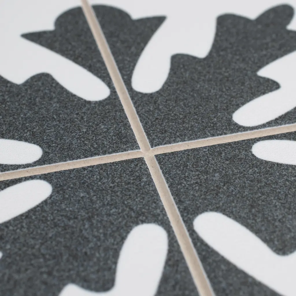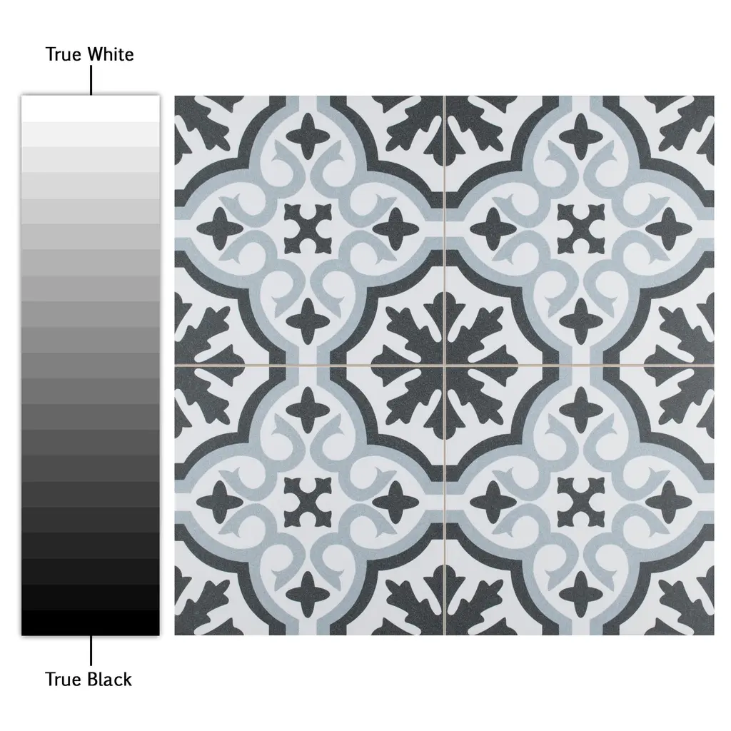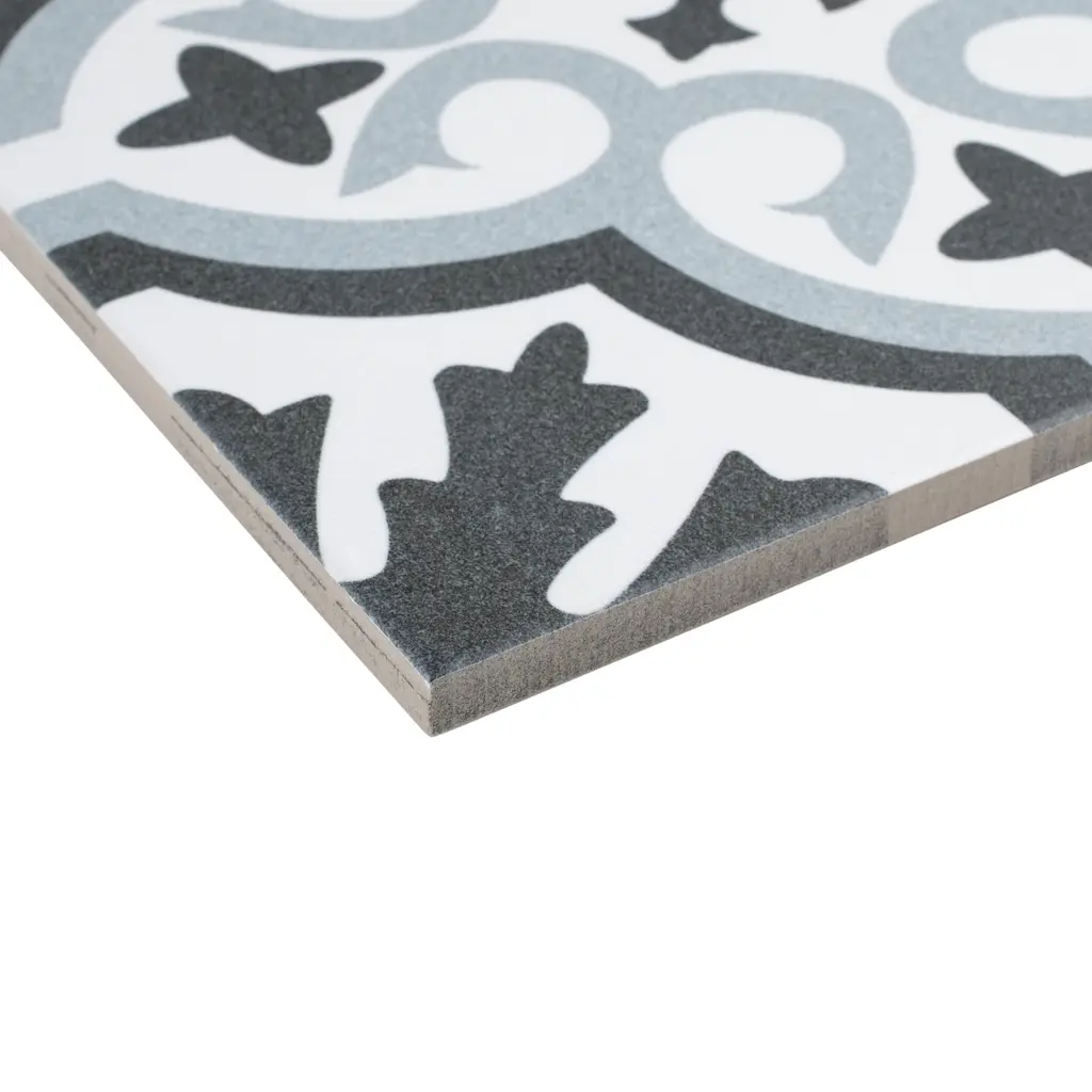 Capturing the artisanal look of cement tile, our Berkeley Essence Sky Porcelain Floor and Wall Tile offers an encaustic, old-world design that can blend into any décor. With a recognizable European-inspired design, the simplistic arcs frame the snowflake inspired patterns that create continuity throughout the installation. Set on an eggshell base glaze, the light and dark blue designs offer the ability to be used in modern and rustic settings. Save time and labor spent arranging smaller square tiles and instead install these durable porcelain slabs, which have four approximately squares with scored grout lines. The scored grout lines can be grouted with the color of your choice to further customize your installation. Its impervious and frost resistant features make this product an ideal choice for indoor and outdoor installations including, kitchens, bathrooms, entryways and patios. Tile is the better choice for your space. This tile is made from natural ingredients, making it a healthy choice as it is free from allergens, VOCs, formaldehyde and PVC. 13.32 square feet, 6 pieces per case. Case weight is 54.28 lbs. Grade 1, first-quality porcelain tile for floor and wall use 17.75 in. width x 17.75 in. length x 0.34 in. thick Glazed, smooth finish with a low sheen and uniform appearance in tone PEI Rating IV has high resistance to abrasion and is suitable for heavy-duty residential and commercial kitchens, hotels, exhibition and sales rooms with some dirt conditions Impervious tiles have a water absorption of less than 0.5% for indoor and outdoor use and are frost resistant This tile has a COF wet rating greater than 0.60 to 0.79 which is considered skid resistant for indoor and outdoor use. This tile is not ADA approved for slip resistance. Completely frost resistant for indoor or outdoor applications; use a latex-modified thinset for acceptable bond strength Please note: Samples are not returnable