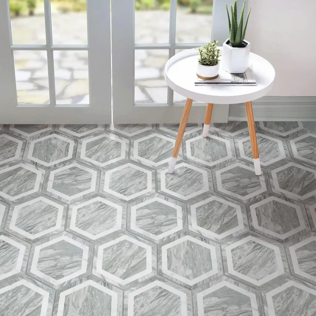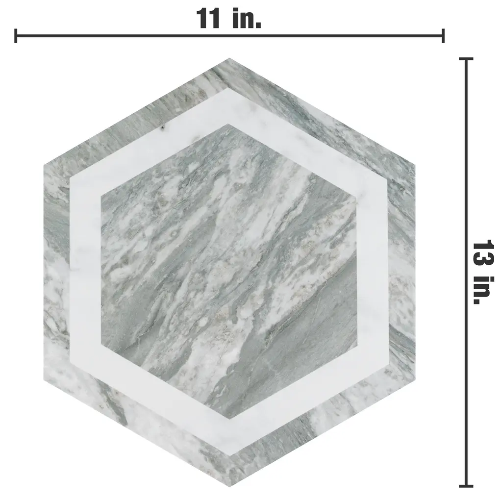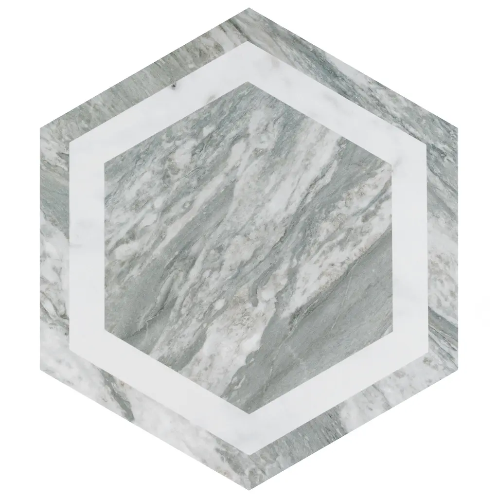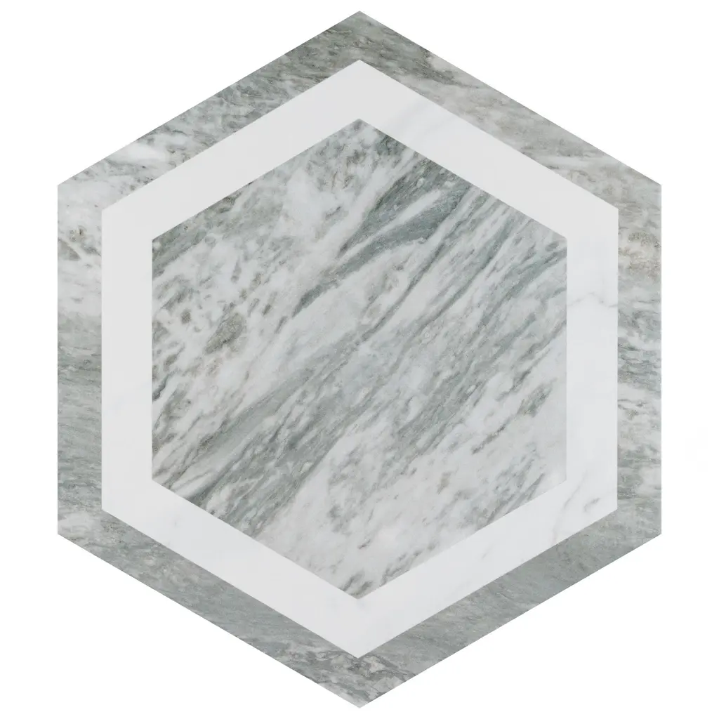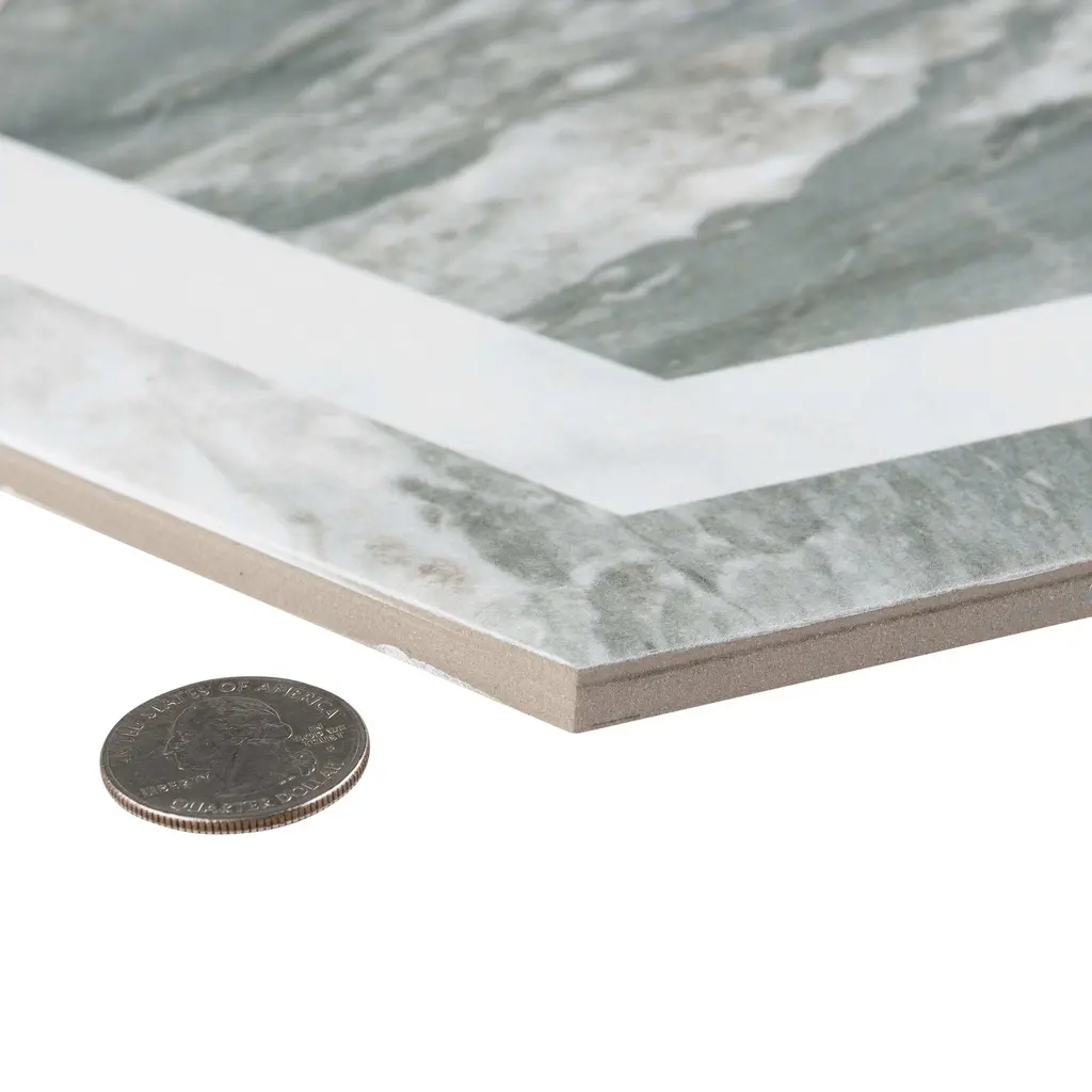 Capturing the appearance of a marble look, our BioTech Hex Bardiglio Deco Porcelain Floor and Wall Tile features a smooth, matte finish, providing decorative appeal that adapts to a variety of stylistic contexts. Containing 10 different print variations that are randomly distributed throughout each case, this gray hexagon tile offers a one-of-a-kind look. With its impervious, frost-resistant features, this tile is an ideal selection for both indoor and outdoor residential installations, including kitchens, bathrooms, backsplashes, showers, hallways and fireplace facades. This tile is a perfect choice on its own or paired with other products in the BioTech Collection. Tile is the better choice for your space! 10.64 square feet, 14 pieces per case. Case weight is 35.4 lbs. Grade 1, first-quality porcelain tile for floor and wall use 11 in. width x 13 in. length x 0.3 in. thick Glazed, smooth finish with a low sheen and slight variation in tone PEI Rating III is suitable for medium-duty residential floors including kitchens, halls, corridors, balconies, terraces and areas used more often with normal footwear and small amounts of dirt Impervious tiles have a water absorption of less than 0.5% for indoor and outdoor use and are frost resistant This tile is ADA approved for slip resistance with a DCOF value of 0.42 or higher. Completely frost resistant for indoor or outdoor applications; use a latex-modified thinset for acceptable bond strength Please note: Samples are not returnable