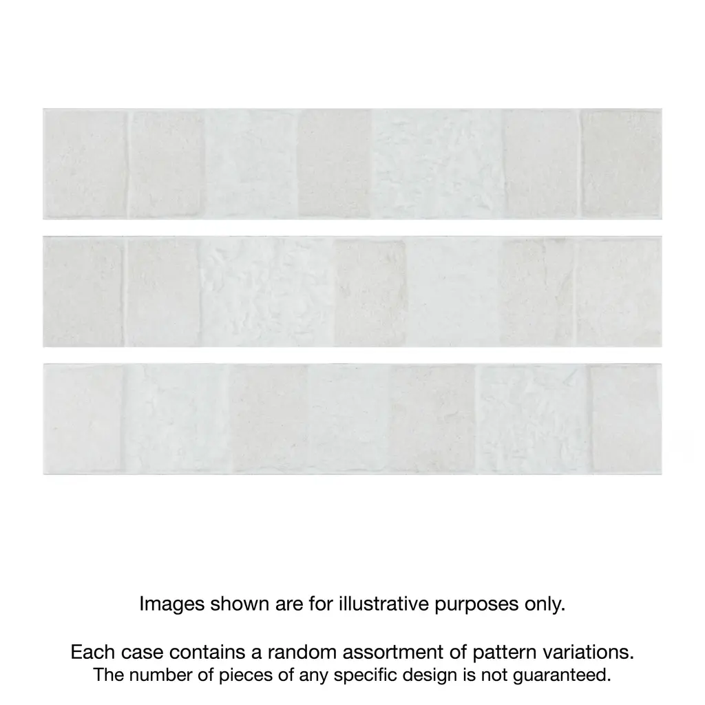 Through the realistic replication of natural stone, our Blend White Porcelain Subway Wall Tile transforms any space into a functional and stylish extension of nature. This enlarged rectangular wall tile features alternating raised and smooth square stone patterns in varying shades of soft white. With a textured three dimensional surface, this unique porcelain panel offers organic, rustic beauty. Available in twenty print variations that are randomly scattered throughout each case, the variation throughout each tile mimics an authentic stone appearance. Its impervious and frost-proof features make it an ideal choice for indoor and outdoor wall installations including kitchen backsplashes, shower walls, and fireplace facades. Tile is the better choice for your space. This tile is made from natural ingredients, making it a healthy choice as it is free from allergens, VOCs, formaldehyde and PVC. 9.6 square feet, 24 pieces per case. Case weight is 36.16 lbs. Grade 1, first-quality porcelain tile for wall use 3.25 in. width x 17.5 in. length x 0.34 in. thick Glazed, medium textured finish with a low sheen and uniform appearance in tone PEI Rating 0 is suitable for wall use only Impervious tiles have a water absorption of less than 0.5% for indoor and outdoor use and are frost resistant No COF value available for this product - please refer to the PEI and DCOF ratings for product durability and resistance Completely frost resistant for indoor or outdoor applications; use a latex-modified thinset for acceptable bond strength Commercial and residential usePlease note: A sample of this product may be a partial piece cut from the full size tile in order to provide an affordable and convenient way for customers to judge the quality and finish of this item. Samples are not returnable.