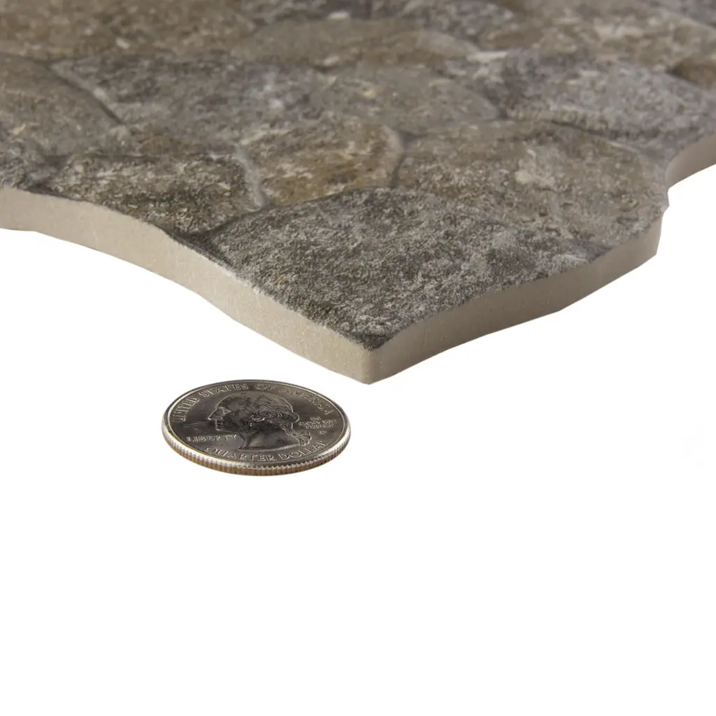 Modeling a stone look, our Caldera Castle Antic Canto Porcelain Floor and Wall Tile features a rough textured, matte finish, providing decorative appeal that adapts to a variety of stylistic contexts. Containing 9 different print variations that are randomly distributed throughout each case, this beige specialty tile offers a one-of-a-kind look. With its impervious, frost-resistant features, this tile is an ideal selection for both indoor and outdoor residential installations, including kitchens, bathrooms, backsplashes, showers, hallways and fireplace facades. This tile is a perfect choice on its own or paired with other products in the Caldera Collection. Tile is the better choice for your space! 11.2 square feet, 5 pieces per case. Case weight is 44.5 lbs. Grade 1, first-quality porcelain tile for floor and wall use 12.63 in. width x 25.13 in. length x 0.38 in. thick Glazed, rough textured finish with a low sheen and substantial variation in tone PEI Rating III is suitable for medium-duty residential floors including kitchens, halls, corridors, balconies, terraces and areas used more often with normal footwear and small amounts of dirt Impervious tiles have a water absorption of less than 0.5% for indoor and outdoor use and are frost resistant This tile is ADA approved for slip resistance with a DCOF value of 0.42 or higher. Completely frost resistant for indoor or outdoor applications; use a latex-modified thinset for acceptable bond strength Please note: A sample of this product may be a partial piece cut from the full size tile in order to provide an affordable and convenient way for customers to judge the quality and finish of this item. Samples are not returnable.