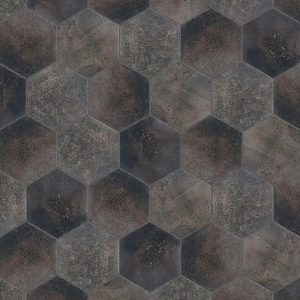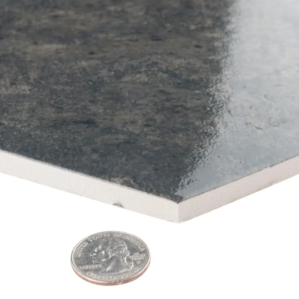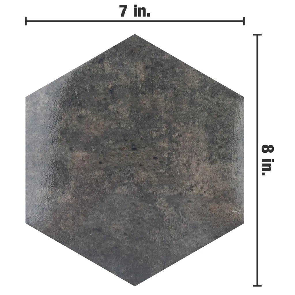 Modeling a stone look, our Capri Hex Nero Porcelain Floor and Wall Tile features a smooth, glossy finish, providing decorative appeal that adapts to a variety of stylistic contexts. Containing 12 different print variations that are randomly distributed throughout each case, this black hexagon tile offers a one-of-a-kind look. With its impervious, frost-resistant features, this tile is an ideal selection for both indoor and outdoor residential installations, including bathrooms, backsplashes, showers, hallways and fireplace facades. This tile is a perfect choice on its own or paired with other products in the Capri Collection. Tile is the better choice for your space! 10.8 square feet, 36 pieces per case. Case weight is 49.6 lbs. Grade 1, first-quality porcelain tile for floor and wall use 7 in. width x 8 in. length x 0.39 in. thick Glazed, smooth finish with a high sheen and moderate variation in tone PEI Rating I is suitable for light-duty residential floors, bathrooms and bedrooms without direct access from outside; no scratching dirt can be present Impervious tiles have a water absorption of less than 0.5% for indoor and outdoor use and are frost resistant This tile is not ADA approved for slip resistance with a DCOF value less than 0.42. Completely frost resistant for indoor or outdoor applications; use a latex-modified thinset for acceptable bond strength Please note: A sample of this product may be a partial piece cut from the full size tile in order to provide an affordable and convenient way for customers to judge the quality and finish of this item. Samples are not returnable.