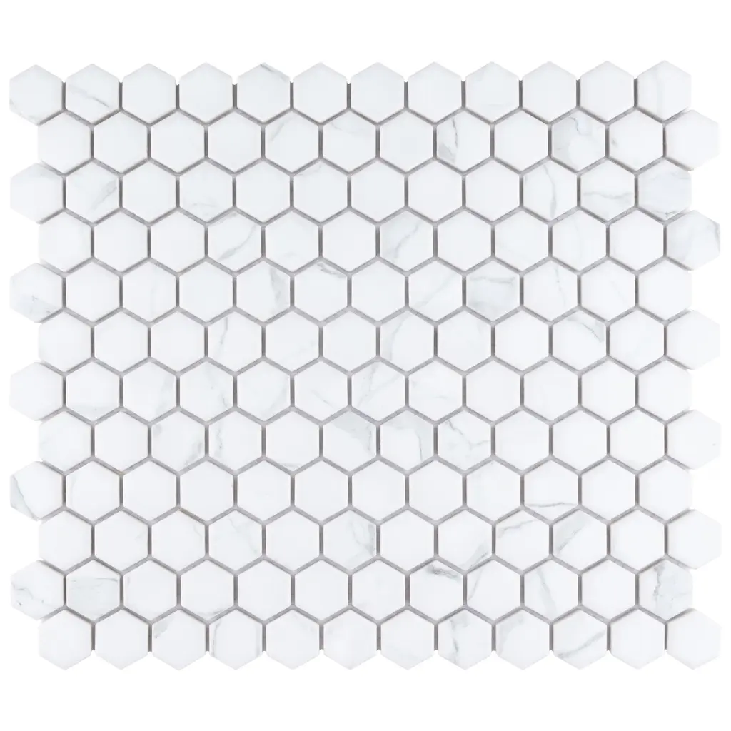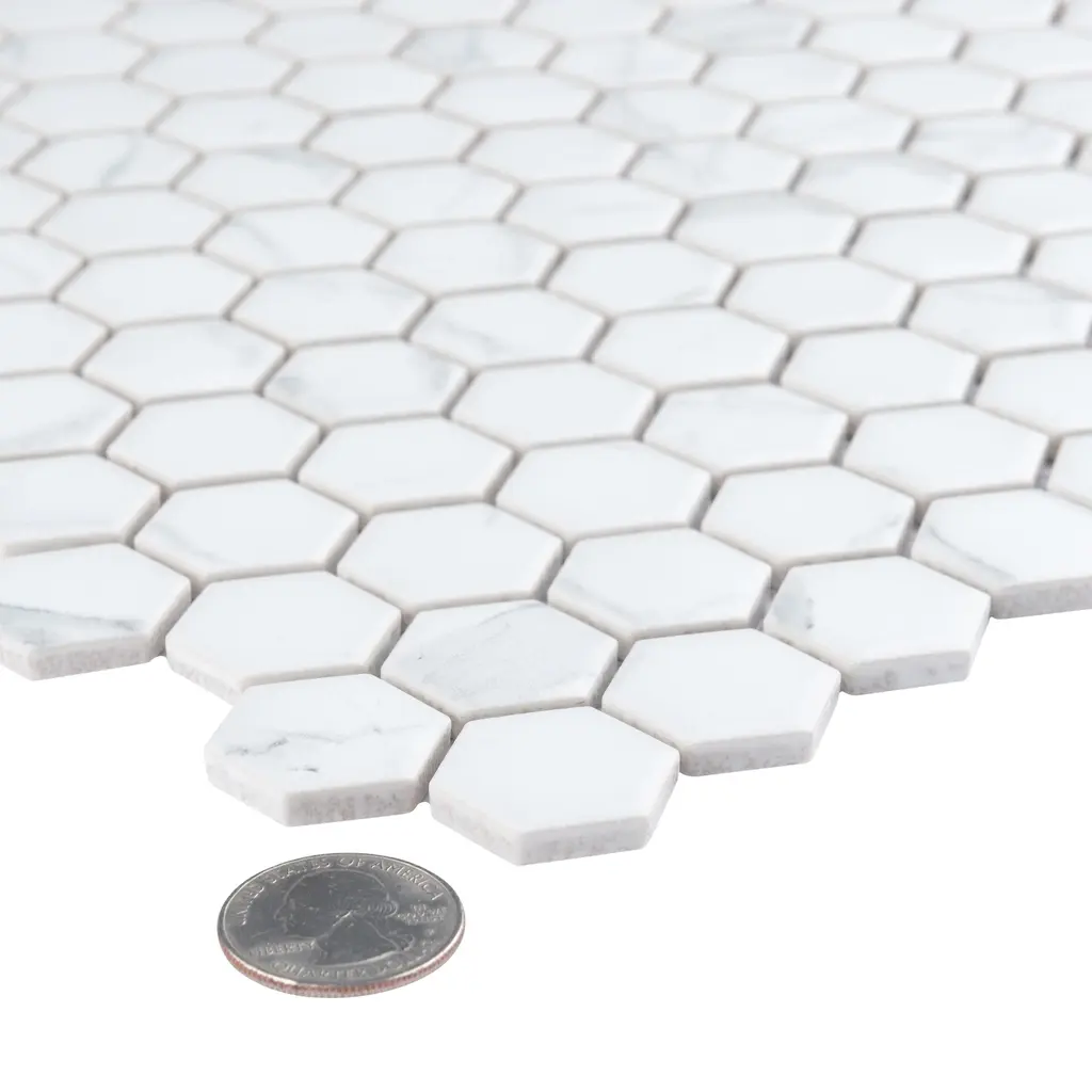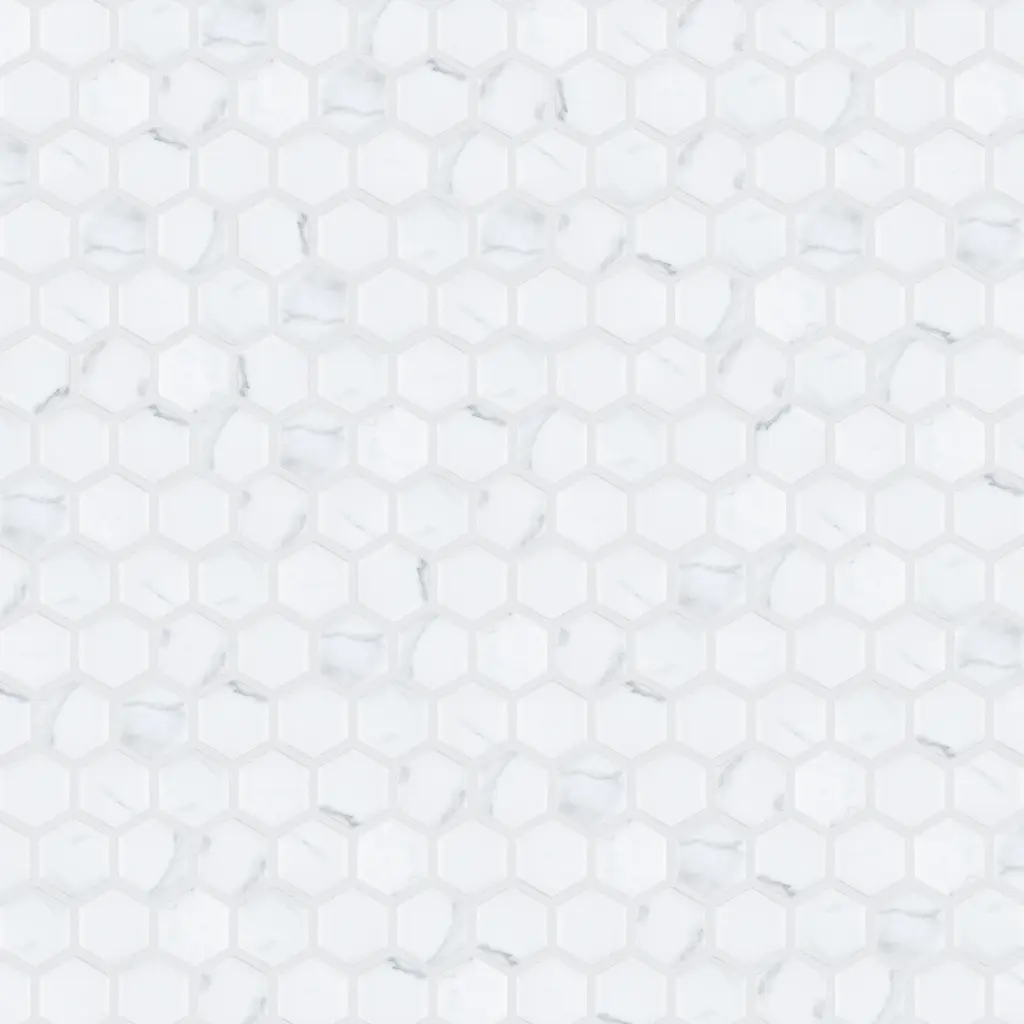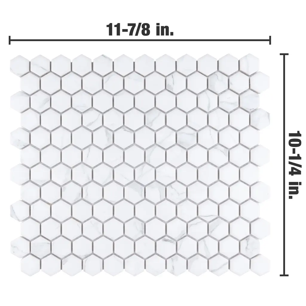 Capturing the appearance of a marble look, our Carrione 1 in. Hex Matte Carrara Porcelain Floor and Wall Tile features a smooth, matte finish, providing decorative appeal that adapts to a variety of stylistic contexts. Containing 100 different print variations that are randomly distributed throughout each case, this white hexagon tile offers a one-of-a-kind look. With its impervious, frost-resistant features, this mosaic is an ideal selection for both indoor and outdoor residential installations, including bathrooms, backsplashes, showers, hallways and fireplace facades. This tile is a perfect choice on its own or paired with other products in the Carrione Collection. Tile is the better choice for your space! 8.6 square feet, 10 pieces per case. Case weight is 17.6 lbs. Grade 1, first-quality porcelain tile for floor and wall use 10.25 in. width x 11.88 in. length x 0.23 in. thick mesh-mounted mosaic Glazed, smooth finish with a low sheen and uniform appearance in tone PEI Rating II is suitable for all interior walls and light foot traffic such as powder rooms Impervious tiles have a water absorption of less than 0.5% for indoor and outdoor use and are frost resistant This tile is not ADA approved for slip resistance with a DCOF value less than 0.42. Completely frost resistant for indoor or outdoor applications; use a latex-modified thinset for acceptable bond strength Please note: A sample of this product may be a partial piece cut from the full size tile in order to provide an affordable and convenient way for customers to judge the quality and finish of this item. Samples are not returnable.