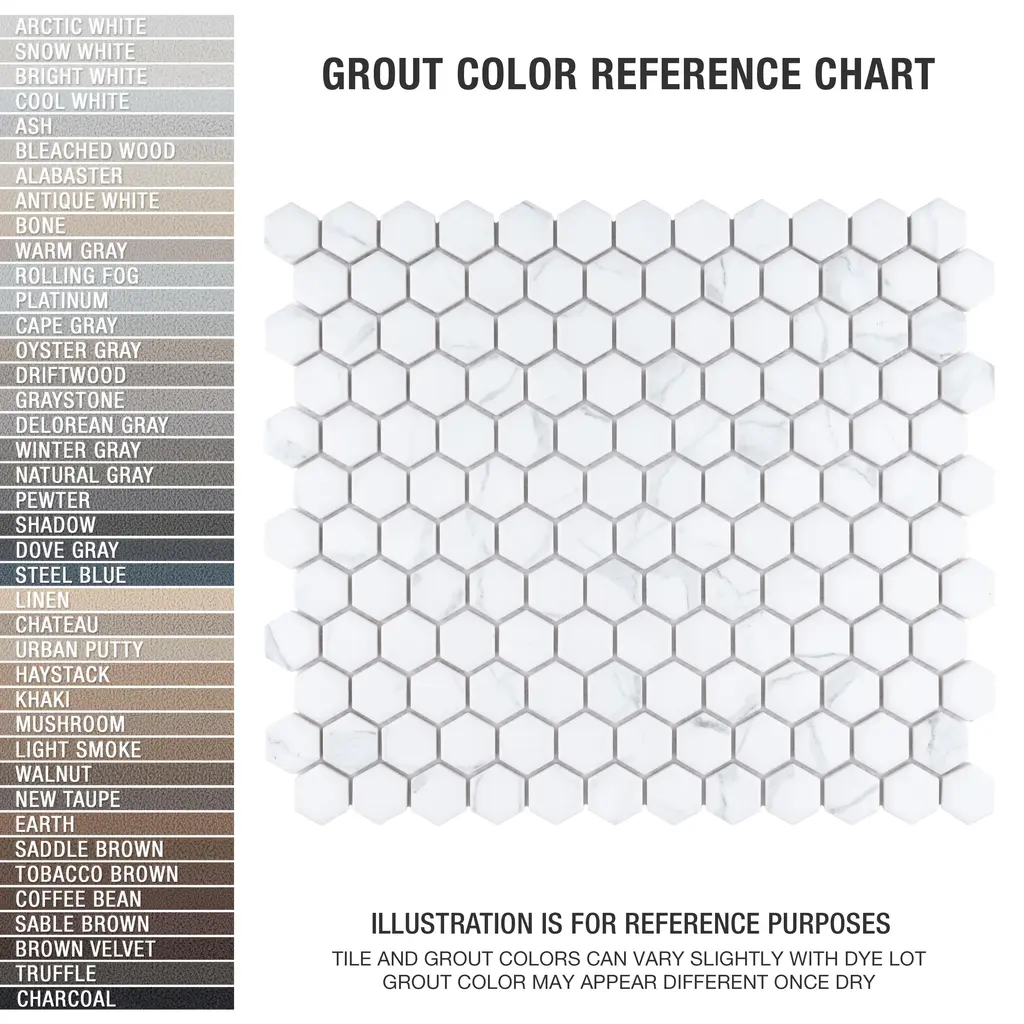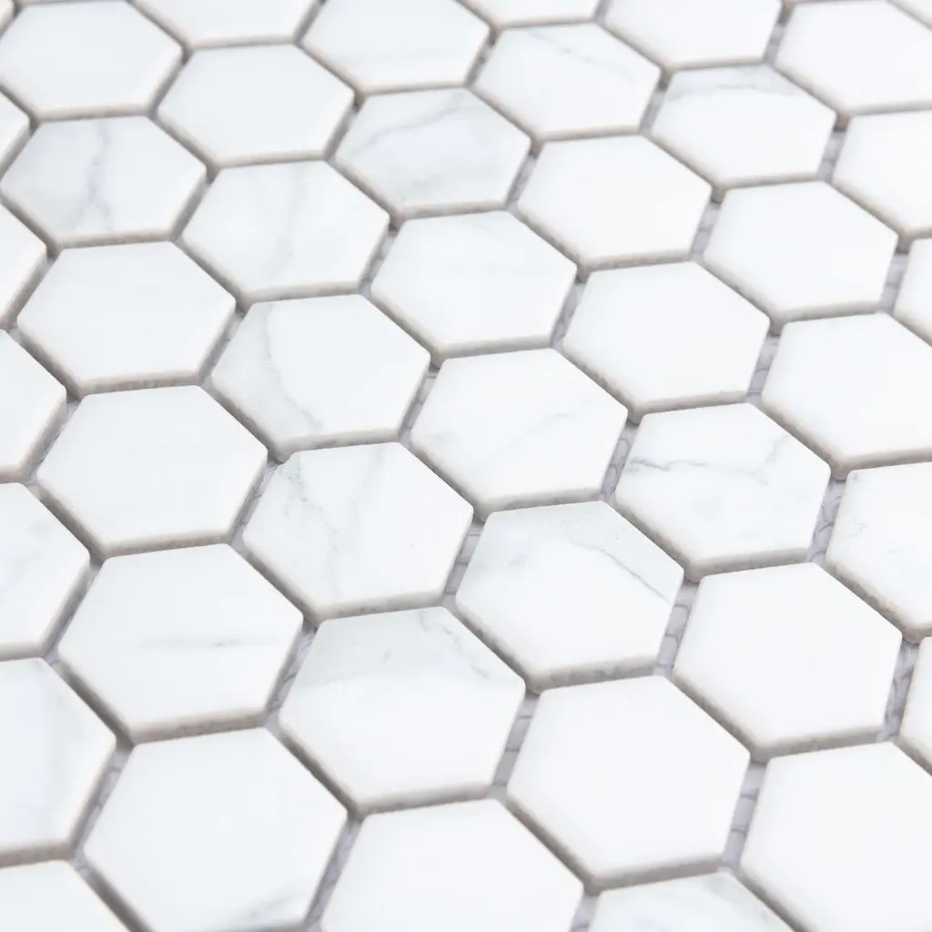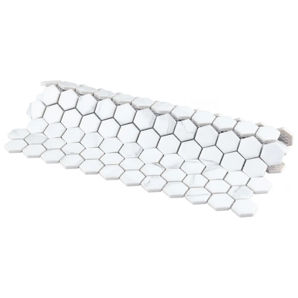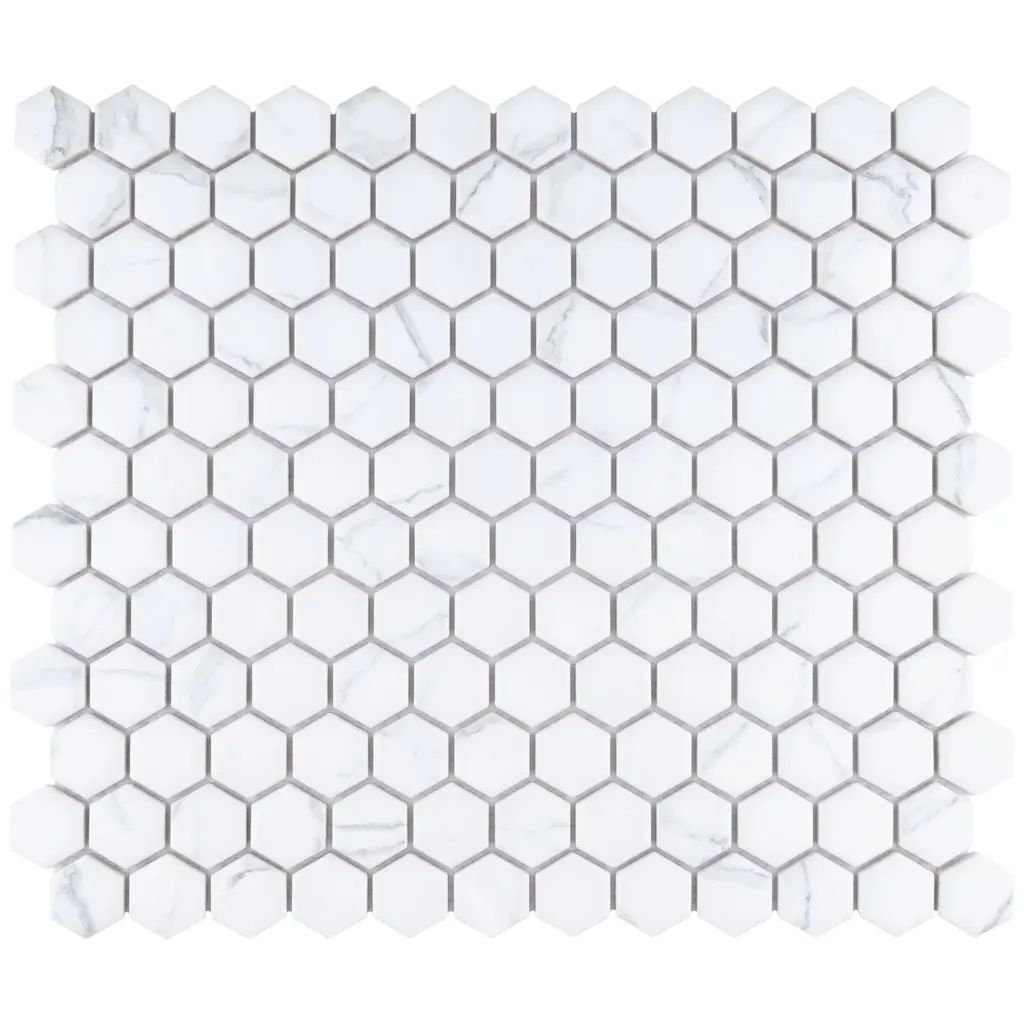 Capturing the appearance of a marble look, our Carrione 1 in. Hex Matte Carrara Porcelain Floor and Wall Tile features a smooth, matte finish, providing decorative appeal that adapts to a variety of stylistic contexts. Containing 100 different print variations that are randomly distributed throughout each case, this white hexagon tile offers a one-of-a-kind look. With its impervious, frost-resistant features, this mosaic is an ideal selection for both indoor and outdoor residential installations, including bathrooms, backsplashes, showers, hallways and fireplace facades. This tile is a perfect choice on its own or paired with other products in the Carrione Collection. Tile is the better choice for your space! 8.6 square feet, 10 pieces per case. Case weight is 17.6 lbs. Grade 1, first-quality porcelain tile for floor and wall use 10.25 in. width x 11.88 in. length x 0.23 in. thick mesh-mounted mosaic Glazed, smooth finish with a low sheen and uniform appearance in tone PEI Rating II is suitable for all interior walls and light foot traffic such as powder rooms Impervious tiles have a water absorption of less than 0.5% for indoor and outdoor use and are frost resistant This tile is not ADA approved for slip resistance with a DCOF value less than 0.42. Completely frost resistant for indoor or outdoor applications; use a latex-modified thinset for acceptable bond strength Please note: A sample of this product may be a partial piece cut from the full size tile in order to provide an affordable and convenient way for customers to judge the quality and finish of this item. Samples are not returnable.