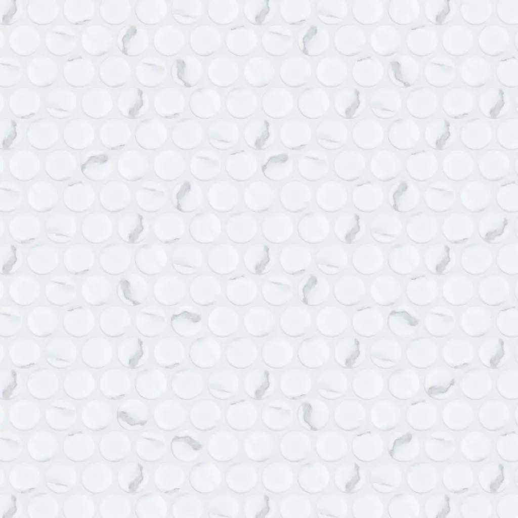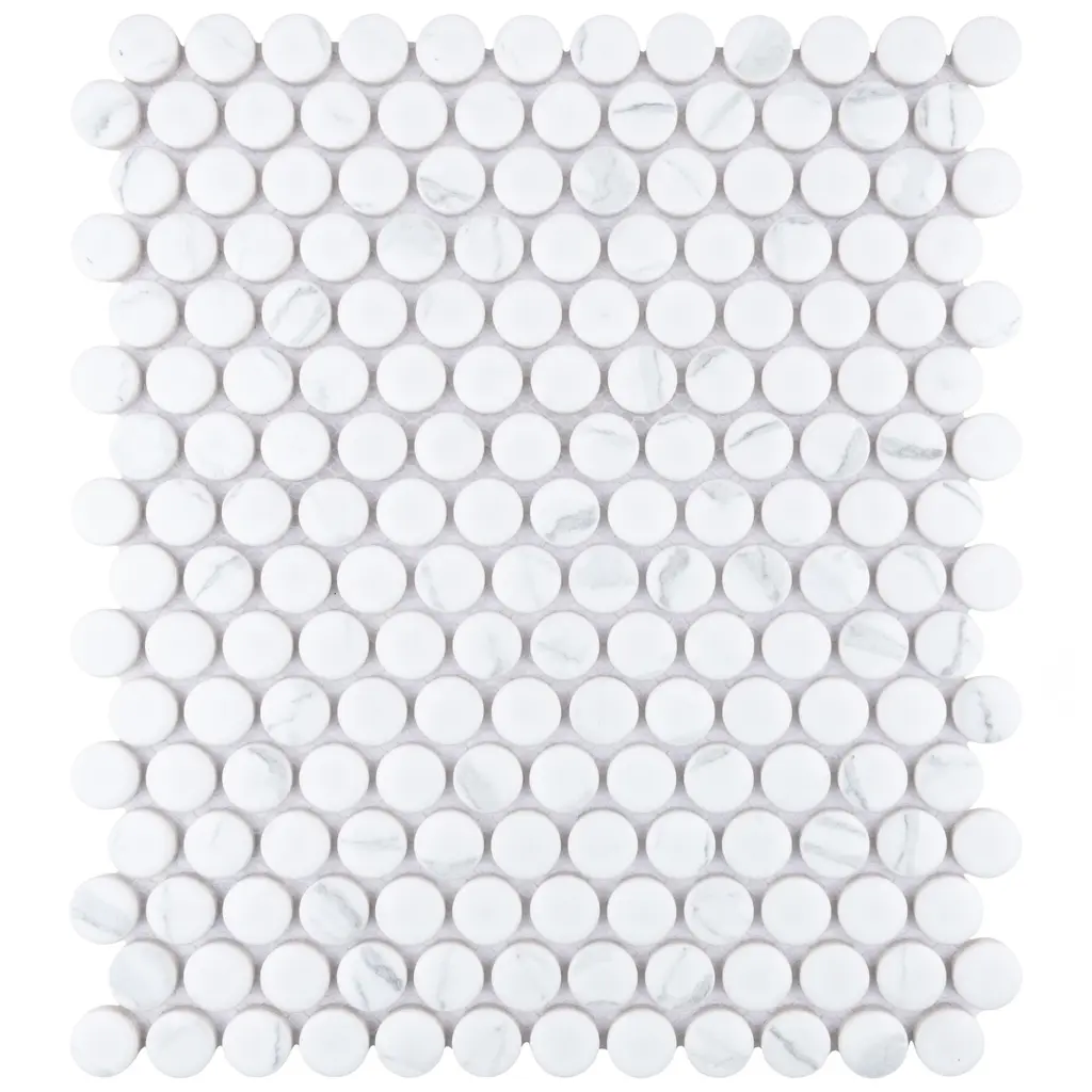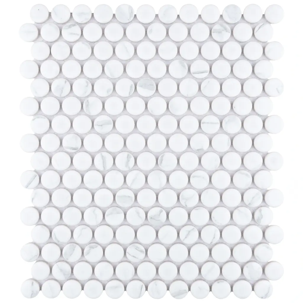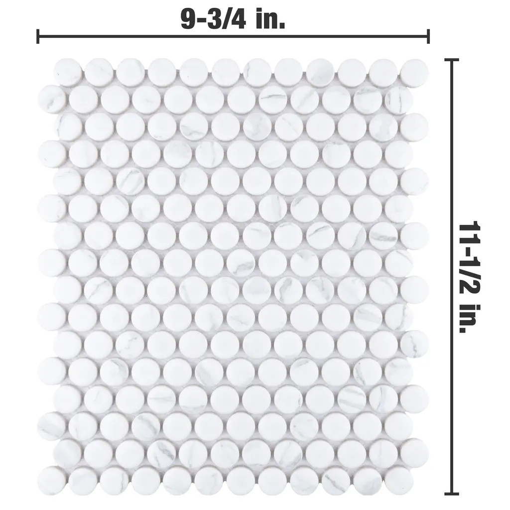 Capturing the appearance of a marble look, our Carrione Penny Matte Carrara Porcelain Floor and Wall Tile features a smooth, matte finish, providing decorative appeal that adapts to a variety of stylistic contexts. Containing 100 different print variations that are randomly distributed throughout each case, this white round tile offers a one-of-a-kind look. With its impervious, frost-resistant features, this mosaic is an ideal selection for both indoor and outdoor residential installations, including bathrooms, backsplashes, showers, hallways and fireplace facades. This tile is a perfect choice on its own or paired with other products in the Carrione Collection. Tile is the better choice for your space! 8.0 square feet, 10 pieces per case. Case weight is 14.5 lbs. Grade 1, first-quality porcelain tile for floor and wall use 9.75 in. width x 11.5 in. length x 0.22 in. thick mesh-mounted mosaic Glazed, smooth finish with a low sheen and uniform appearance in tone PEI Rating II is suitable for all interior walls and light foot traffic such as powder rooms Impervious tiles have a water absorption of less than 0.5% for indoor and outdoor use and are frost resistant This tile is not ADA approved for slip resistance with a DCOF value less than 0.42. Completely frost resistant for indoor or outdoor applications; use a latex-modified thinset for acceptable bond strength Please note: A sample of this product may be a partial piece cut from the full size tile in order to provide an affordable and convenient way for customers to judge the quality and finish of this item. Samples are not returnable.