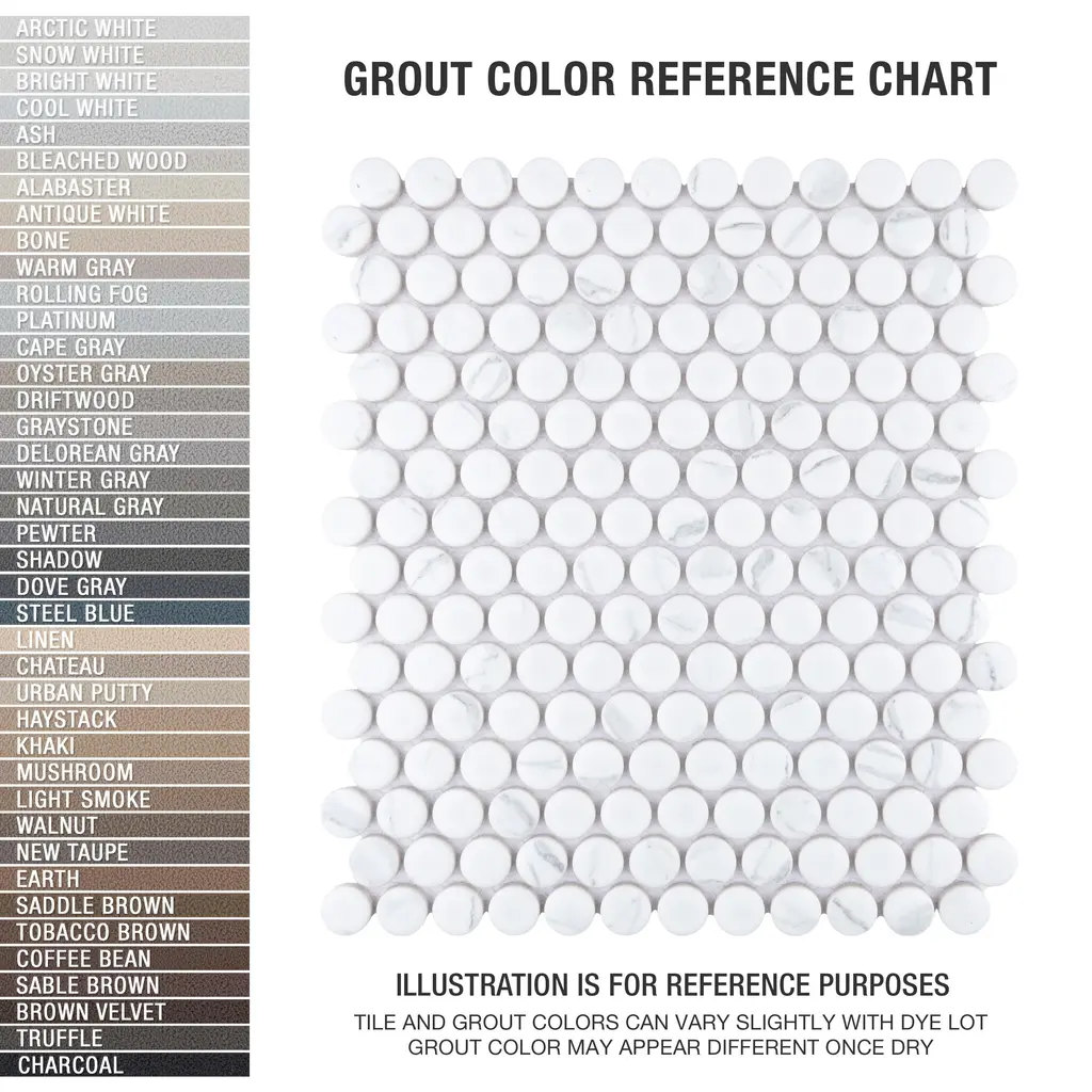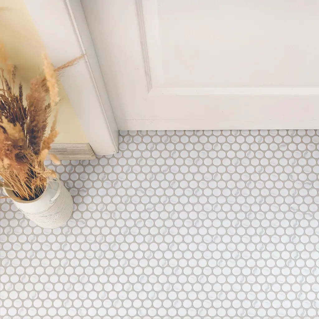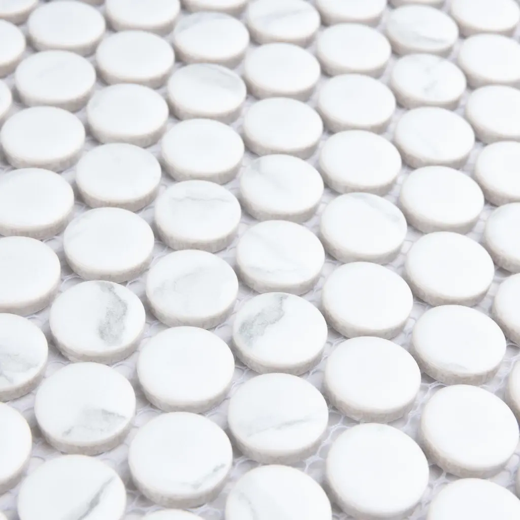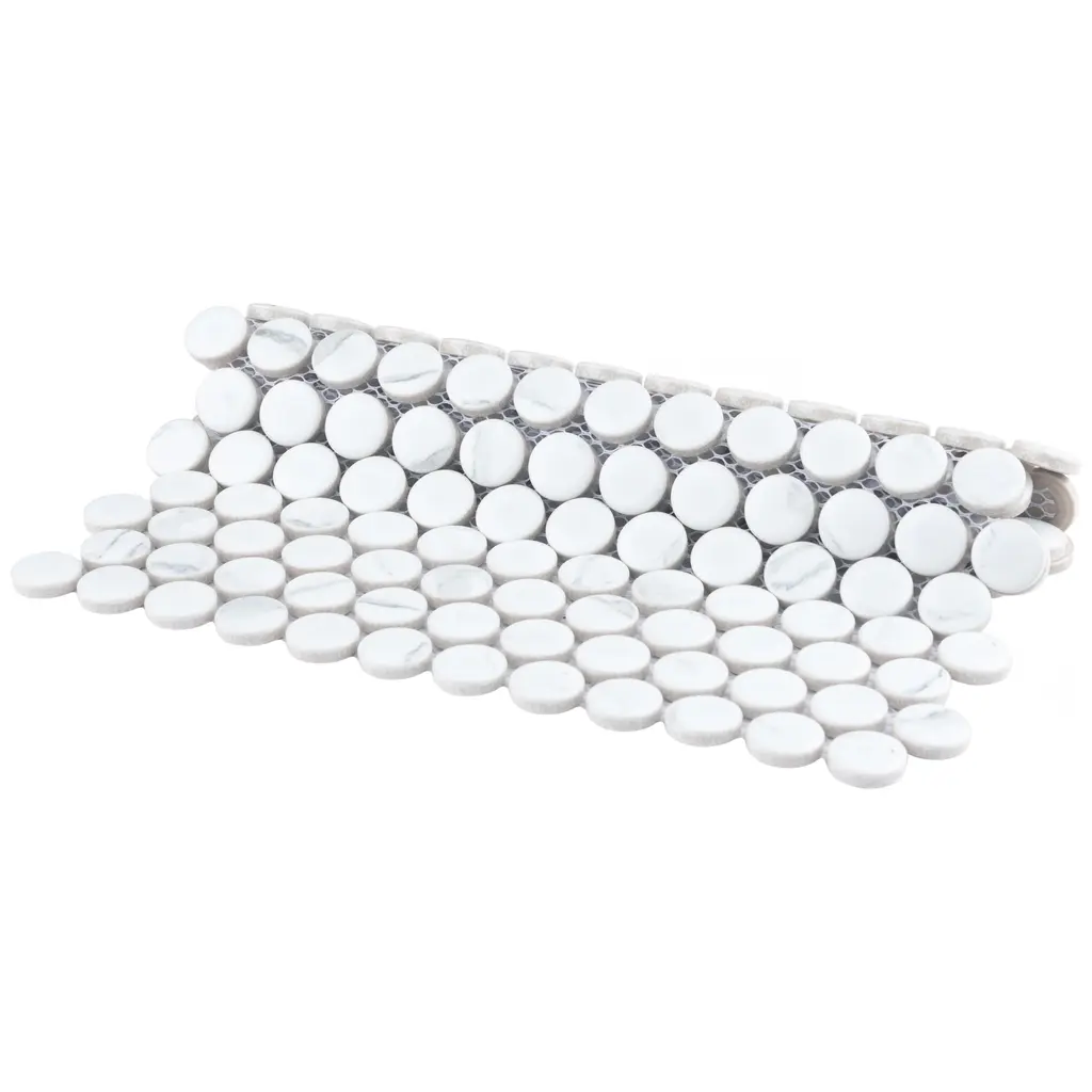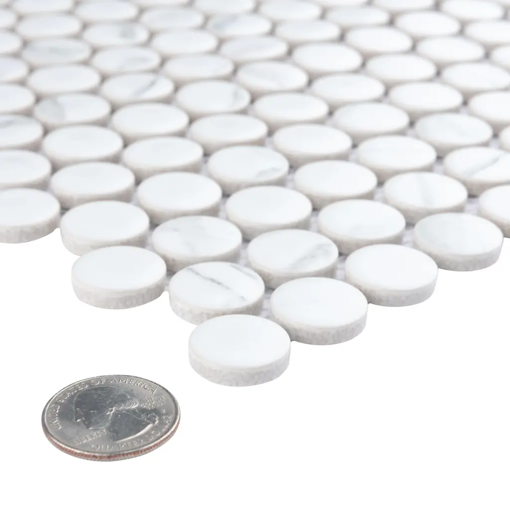 Capturing the appearance of a marble look, our Carrione Penny Matte Carrara Porcelain Floor and Wall Tile features a smooth, matte finish, providing decorative appeal that adapts to a variety of stylistic contexts. Containing 100 different print variations that are randomly distributed throughout each case, this white round tile offers a one-of-a-kind look. With its impervious, frost-resistant features, this mosaic is an ideal selection for both indoor and outdoor residential installations, including bathrooms, backsplashes, showers, hallways and fireplace facades. This tile is a perfect choice on its own or paired with other products in the Carrione Collection. Tile is the better choice for your space! 8.0 square feet, 10 pieces per case. Case weight is 14.5 lbs. Grade 1, first-quality porcelain tile for floor and wall use 9.75 in. width x 11.5 in. length x 0.22 in. thick mesh-mounted mosaic Glazed, smooth finish with a low sheen and uniform appearance in tone PEI Rating II is suitable for all interior walls and light foot traffic such as powder rooms Impervious tiles have a water absorption of less than 0.5% for indoor and outdoor use and are frost resistant This tile is not ADA approved for slip resistance with a DCOF value less than 0.42. Completely frost resistant for indoor or outdoor applications; use a latex-modified thinset for acceptable bond strength Please note: A sample of this product may be a partial piece cut from the full size tile in order to provide an affordable and convenient way for customers to judge the quality and finish of this item. Samples are not returnable.