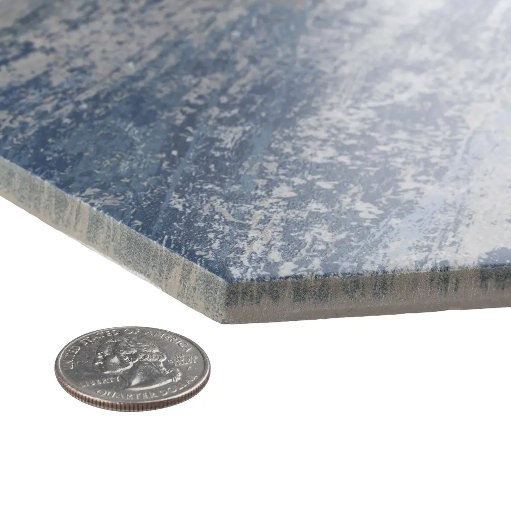 Replicating a wood look, our Cassis Hex Blue Porcelain Floor and Wall Tile features a mixed textured finish, providing decorative appeal that adapts to a variety of stylistic contexts. Containing 55 different print variations that are randomly distributed throughout each case, this blue hexagon tile offers a one-of-a-kind look. With its impervious, frost-resistant features, this tile is an ideal selection for a variety of spaces including indoor and outdoor residential installations, kitchens, bathrooms, backsplashes, showers, hallways, pools and fireplace facades. Discover more products from the Merola Tile Cassis Collection to complete your design. To ensure optimal results, please consult with your installer and review the product specifications to confirm that this tile meets the specific needs of your project. 11.5 square feet, 25 pieces per case. Case weight is 50.64 lbs. Grade 1, first-quality porcelain tile for floor and wall use 8.63 in. width x 9.88 in. length x 0.39 in. thick Glazed, mixed texture with a mixed finish and slight variation in tone PEI Rating III is suitable for medium-duty residential floors including kitchens, halls, corridors, balconies, terraces and areas used more often with normal footwear and small amounts of dirt Impervious tiles have a water absorption of less than 0.5% for indoor and outdoor use and are frost resistant This tile is ADA approved for slip resistance with a DCOF value of 0.42 or higher. Completely frost resistant for indoor or outdoor applications; use a latex-modified thinset for acceptable bond strength Please note: A sample of this product may be a partial piece cut from the full size tile in order to provide an affordable and convenient way for customers to judge the quality and finish of this item. Samples are not returnable.