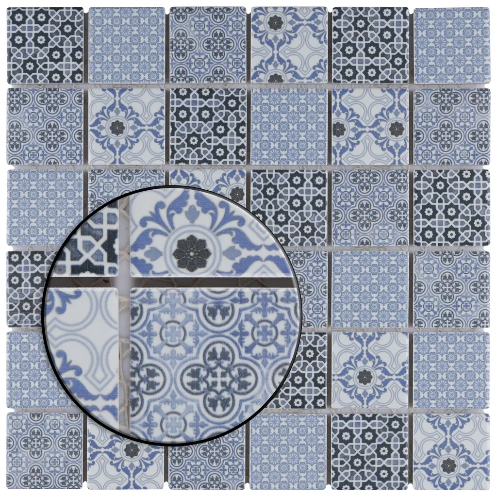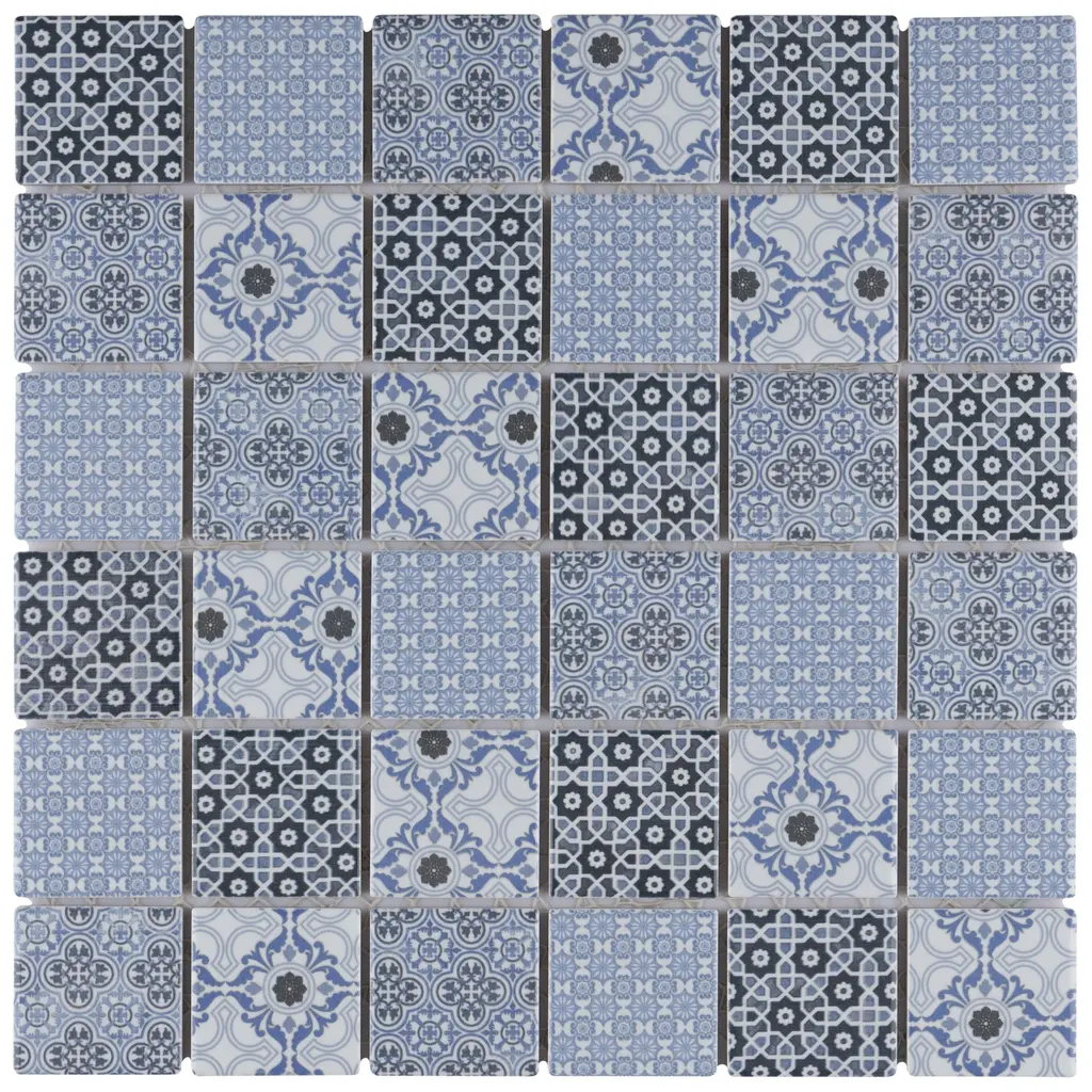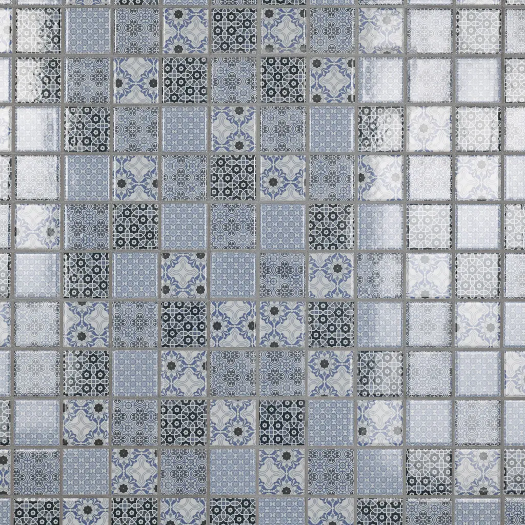 Our Classico Blue Porcelain Floor and Wall Tile ties together the intricate look of individual tiles with the easy installation of a mosaic. This geometric patchwork mosaic features four varying old-world designs in light and dark blue tones with a smooth surface. This multi-patterned tile puts a contemporary twist on the traditional simplistic nature of mosaic tile. Glossy squares are arranged on an interlocking mesh to create a seamless installation. Its impervious and frost-resistant features make this an ideal tile for both indoor and outdoor residential use, including backsplashes, bathrooms, showers and kitchens. Tile is the better choice for your space. This tile is made from natural ingredients, making it a healthy choice as it is free from allergens, VOCs, formaldehyde and PVC. 9.8 square feet, 10 pieces per case. Case weight is 24.3 lbs. Grade 1, first-quality porcelain tile for floor and wall use 11.75 in. width x 11.75 in. length x 0.28 in. thick mesh-mounted mosaic Glazed, smooth finish with a high sheen and slight variation in tone PEI Rating II is suitable for all interior walls and light foot traffic such as powder rooms Impervious tiles have a water absorption of less than 0.5% for indoor and outdoor use and are frost resistant This tile has a COF wet rating less than or equal to 0.50 and is considered to have a marginally low skid resistance. This tile is not ADA approved for slip resistance. Completely frost resistant for indoor or outdoor applications; use a latex-modified thinset for acceptable bond strength Please note: A sample of this product may be a partial piece cut from the full size tile in order to provide an affordable and convenient way for customers to judge the quality and finish of this item. Samples are not returnable.