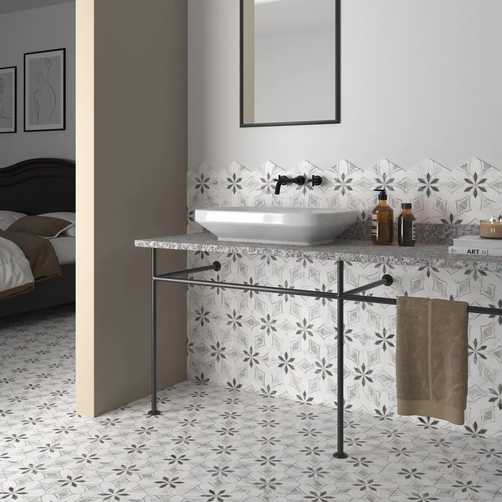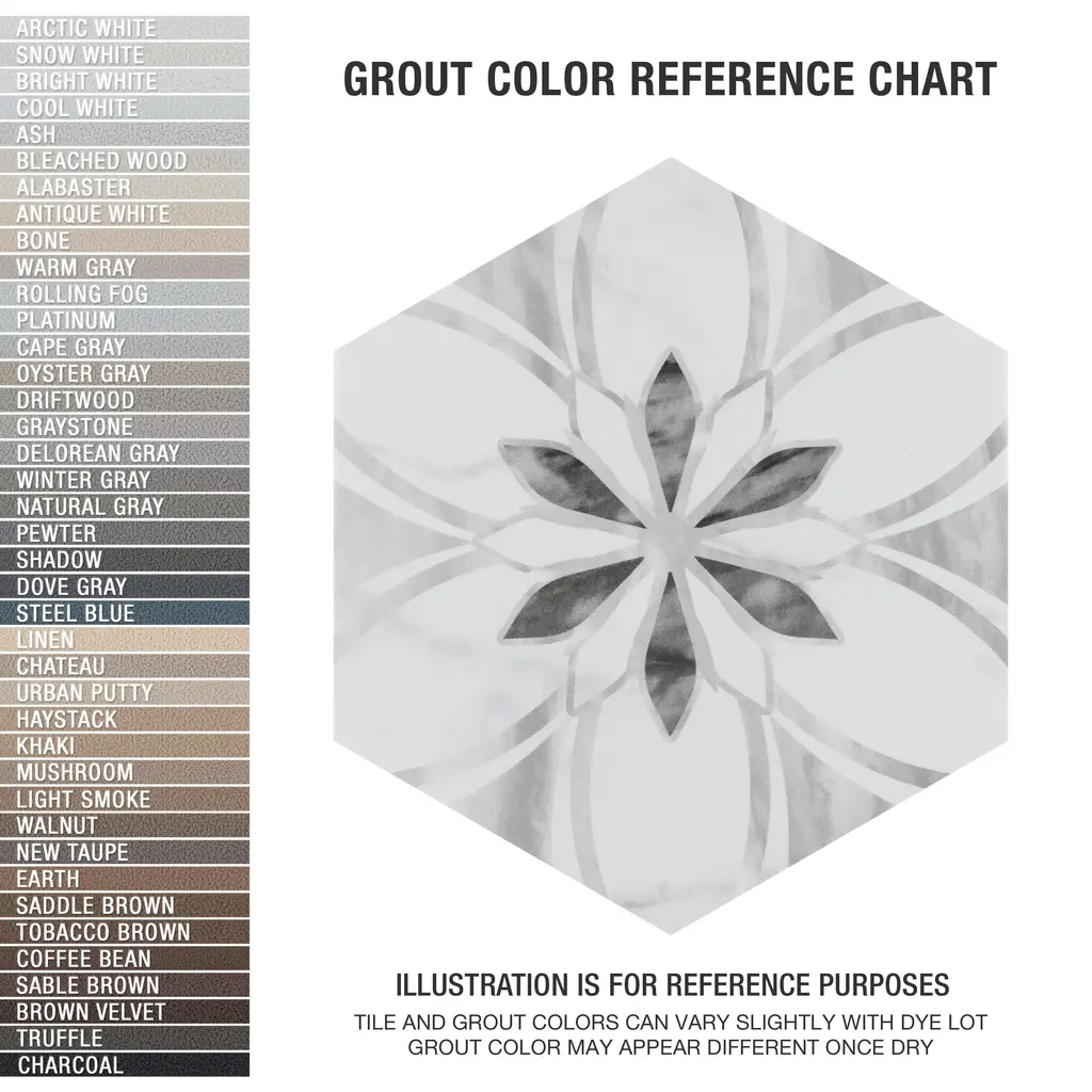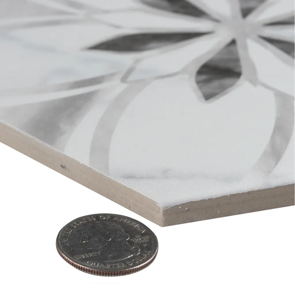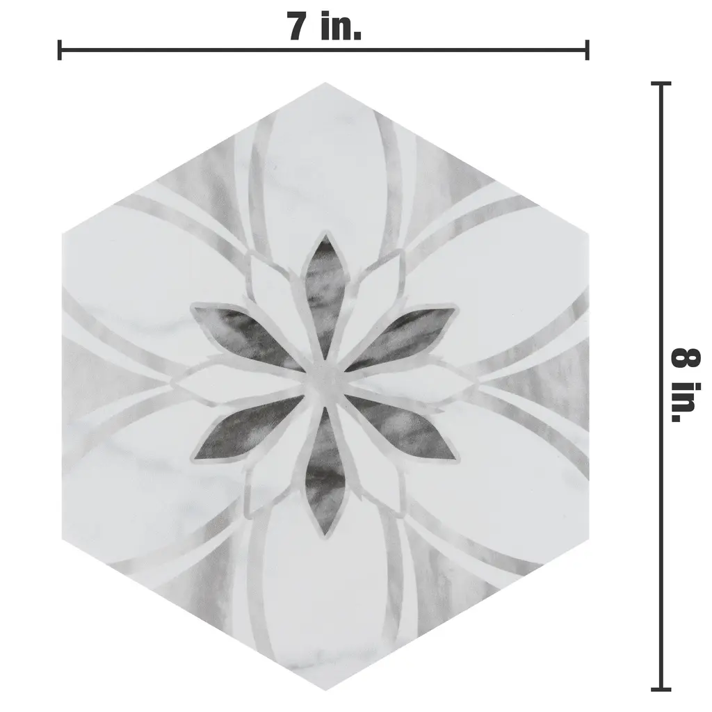 Emulating the timeless beauty of marble stone in an easy to maintain porcelain material, our Classico Bardiglio Hex Dahlia Light Porcelain Floor and Wall Tile, brings functional sophistication into any space. This matte hexagon tile features black and light grey floral patterns with grey veining and striations set on a white base glaze. This innovative and sophisticated display of geometric design is visually appealing and versatile and adapts to any stylistic context. Its impervious and frost-resistant features make it an ideal choice for indoor and outdoor installations including kitchens, bathrooms, backsplashes, showers, entryways, and patios. This tile is a perfect choice on its own or coordinated with other products in the Classico Bardiglio series. Tile is the better choice for your space. This tile is made from natural ingredients, making it a healthy choice as it is free from allergens, VOCs, formaldehyde, and PVC. 7.5 square feet, 25 pieces per case. Case weight is 28.99 lbs. Grade 1, first-quality porcelain tile for floor and wall use 7 in. width x 8 in. length x 0.34 in. thick Glazed, slightly textured finish with a medium sheen and slight variation in tone PEI Rating III is suitable for medium-duty residential floors including kitchens, halls, corridors, balconies, terraces and areas used more often with normal footwear and small amounts of dirt Impervious tiles have a water absorption of less than 0.5% for indoor and outdoor use and are frost resistant This tile is ADA approved for slip resistance with a DCOF value of 0.42 or higher. Completely frost resistant for indoor or outdoor applications; use a latex-modified thinset for acceptable bond strength Please note: A sample of this product may be a partial piece cut from the full size tile in order to provide an affordable and convenient way for customers to judge the quality and finish of this item. Samples are not returnable.