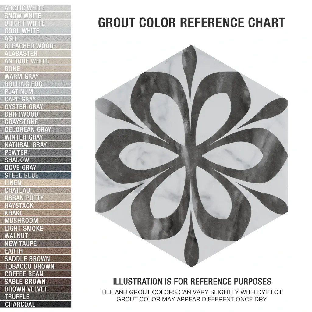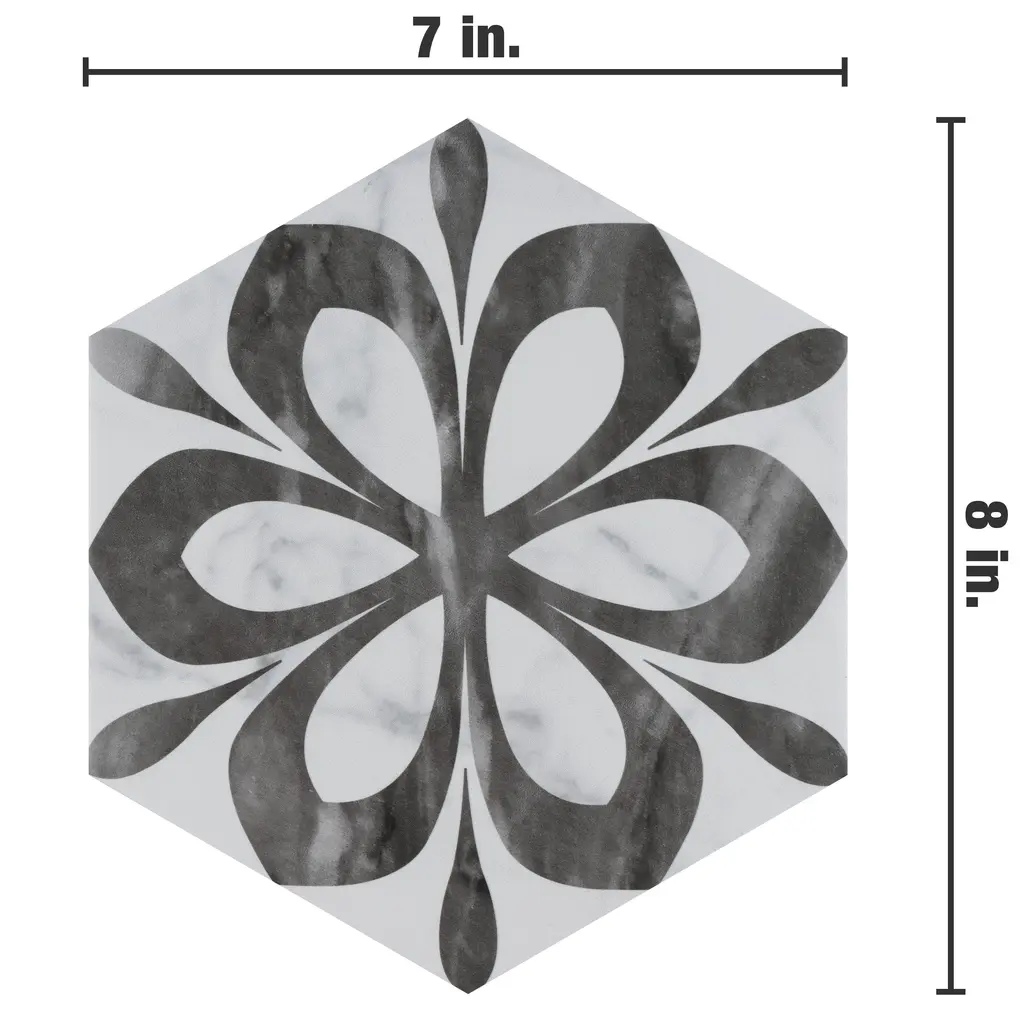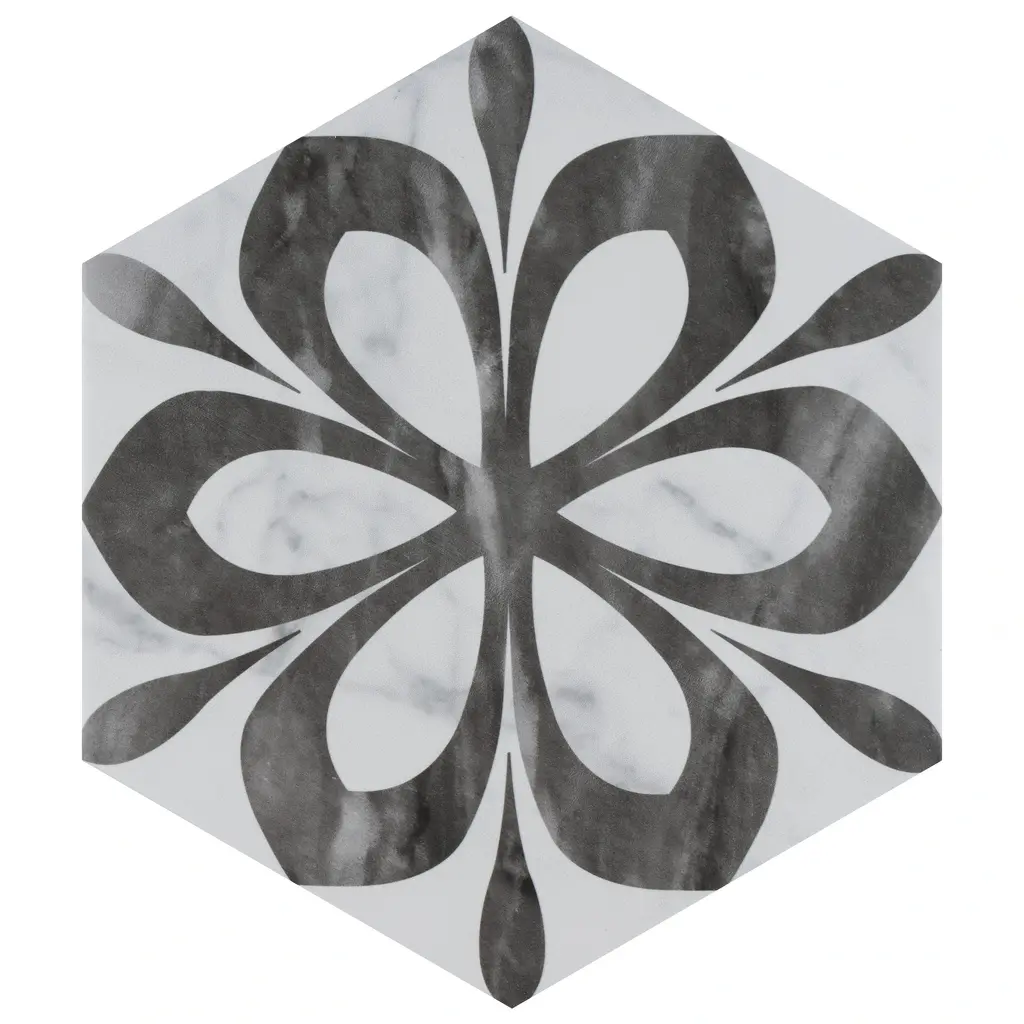 Emulating the timeless beauty of marble stone in an easy to maintain porcelain material, our Classico Bardiglio Hex Daisy 7" x 8" Porcelain Floor and Wall Tile, brings functional sophistication into any space. This matte hexagon tile features black and light grey floral patterns with grey veining and striations set on a white base glaze. This innovative and sophisticated display of geometric design is visually appealing and versatile and adapts to any stylistic context. Its impervious and frost-resistant features make it an ideal choice for indoor and outdoor installations including kitchens, bathrooms, backsplashes, showers, entryways, and patios. This tile is a perfect choice on its own or coordinated with other products in the Classico Bardiglio series. Tile is the better choice for your space. This tile is made from natural ingredients, making it a healthy choice as it is free from allergens, VOCs, formaldehyde, and PVC.br>