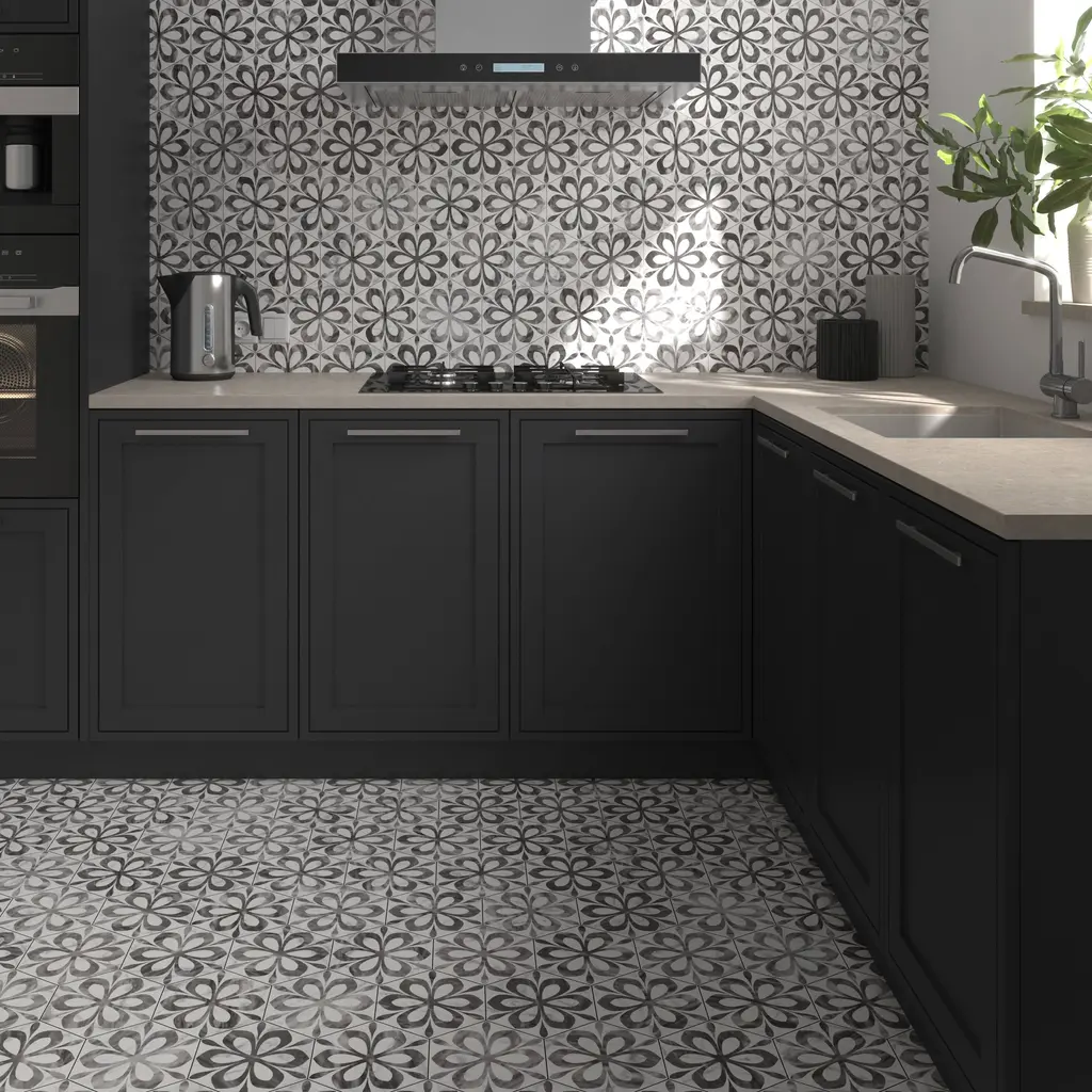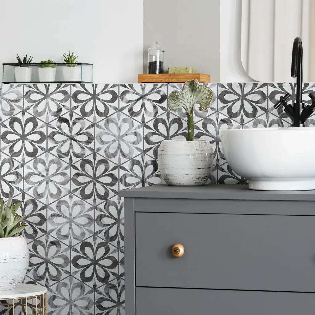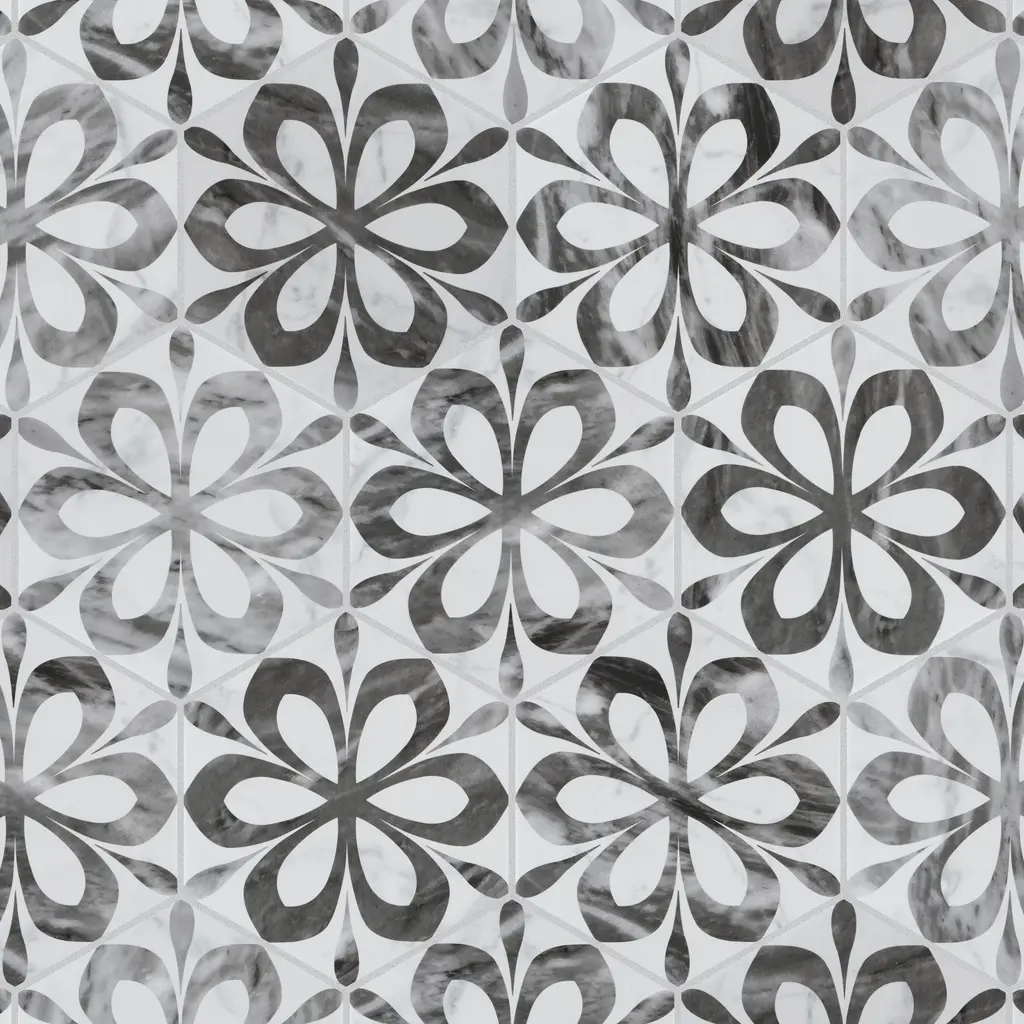 Emulating the timeless beauty of marble stone in an easy to maintain porcelain material, our Classico Bardiglio Hex Daisy 7" x 8" Porcelain Floor and Wall Tile, brings functional sophistication into any space. This matte hexagon tile features black and light grey floral patterns with grey veining and striations set on a white base glaze. This innovative and sophisticated display of geometric design is visually appealing and versatile and adapts to any stylistic context. Its impervious and frost-resistant features make it an ideal choice for indoor and outdoor installations including kitchens, bathrooms, backsplashes, showers, entryways, and patios. This tile is a perfect choice on its own or coordinated with other products in the Classico Bardiglio series. Tile is the better choice for your space. This tile is made from natural ingredients, making it a healthy choice as it is free from allergens, VOCs, formaldehyde, and PVC.br>