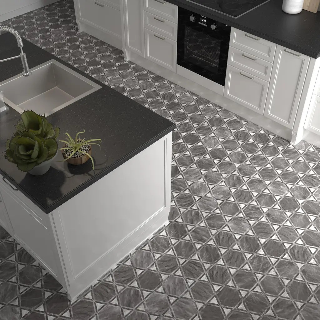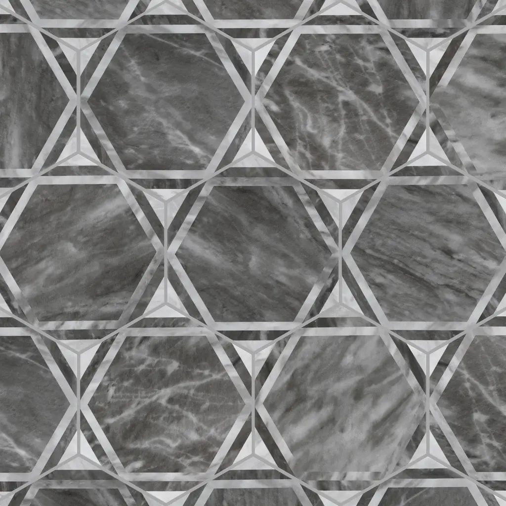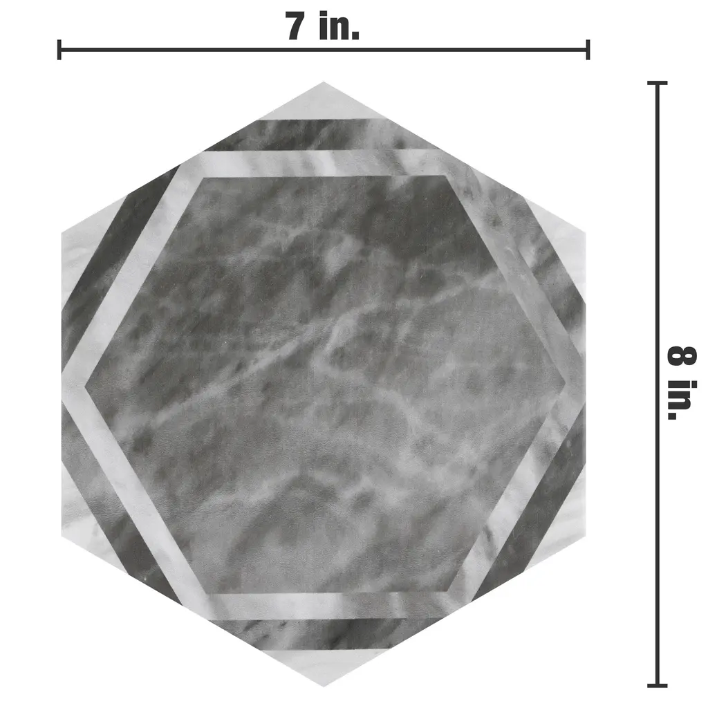 Emulating the timeless beauty of marble stone in an easy to maintain porcelain material, our Classico Bardiglio Hex Dimension Dark Porcelain Floor and Wall Tile, brings functional sophistication into any space. This matte hexagon tile features alternating grey and black framing patterns with light grey veining and striations set on a dark grey base glaze. This innovative and sophisticated display of geometric design is visually appealing and versatile and adapts to any stylistic context. Its impervious and frost-resistant features make it an ideal choice for indoor and outdoor installations including kitchens, bathrooms, backsplashes, showers, entryways, and patios. This tile is a perfect choice on its own or coordinated with other products in the Classico Bardiglio series. Tile is the better choice for your space. This tile is made from natural ingredients, making it a healthy choice as it is free from allergens, VOCs, formaldehyde, and PVC. 7.5 square feet, 25 pieces per case. Case weight is 28.99 lbs. Grade 1, first-quality porcelain tile for floor and wall use 7 in. width x 8 in. length x 0.34 in. thick Glazed, slightly textured finish with a medium sheen and slight variation in tone PEI Rating III is suitable for medium-duty residential floors including kitchens, halls, corridors, balconies, terraces and areas used more often with normal footwear and small amounts of dirt Impervious tiles have a water absorption of less than 0.5% for indoor and outdoor use and are frost resistant This tile is ADA approved for slip resistance with a DCOF value of 0.42 or higher. Completely frost resistant for indoor or outdoor applications; use a latex-modified thinset for acceptable bond strength Please note: A sample of this product may be a partial piece cut from the full size tile in order to provide an affordable and convenient way for customers to judge the quality and finish of this item. Samples are not returnable.