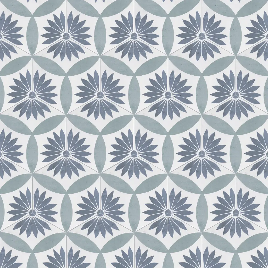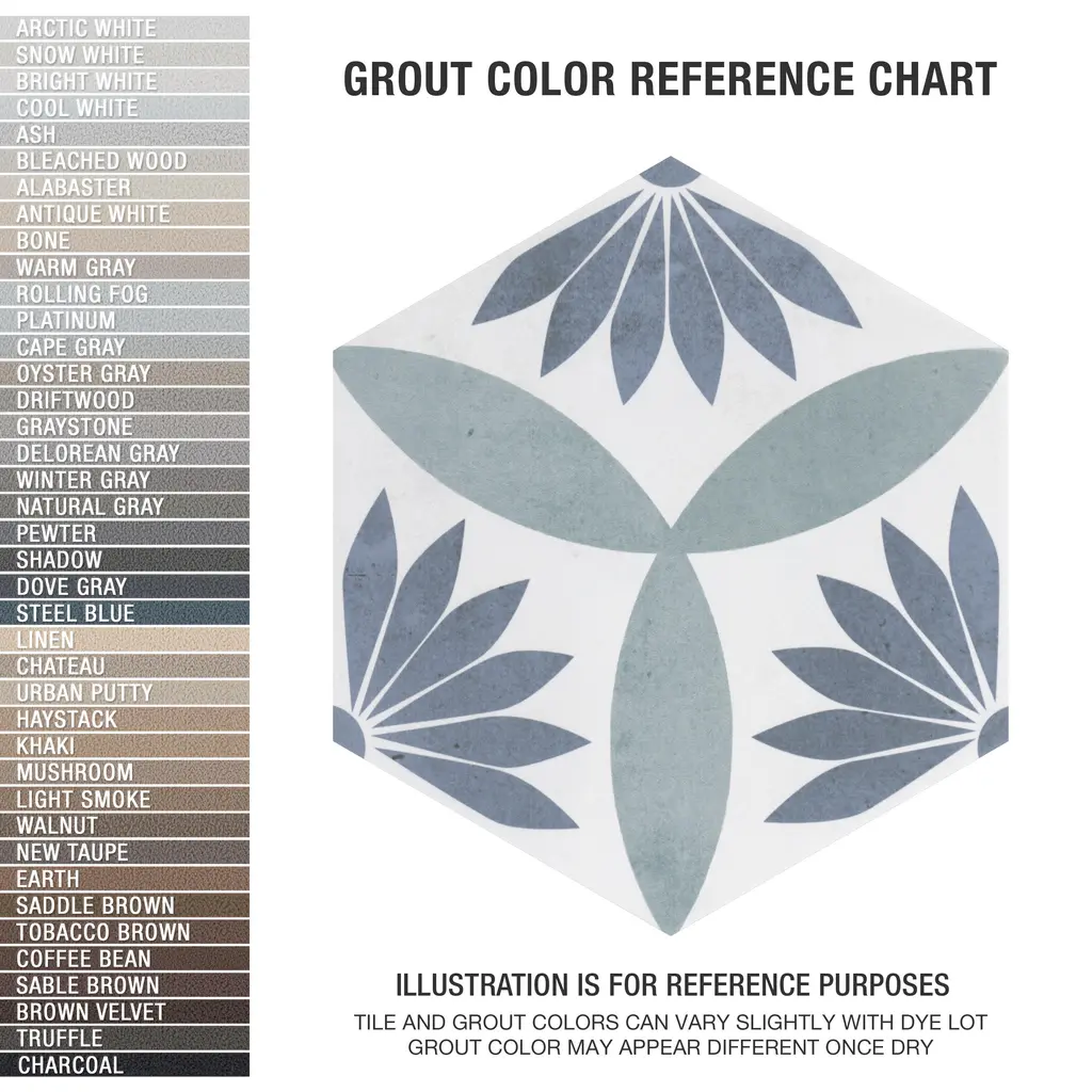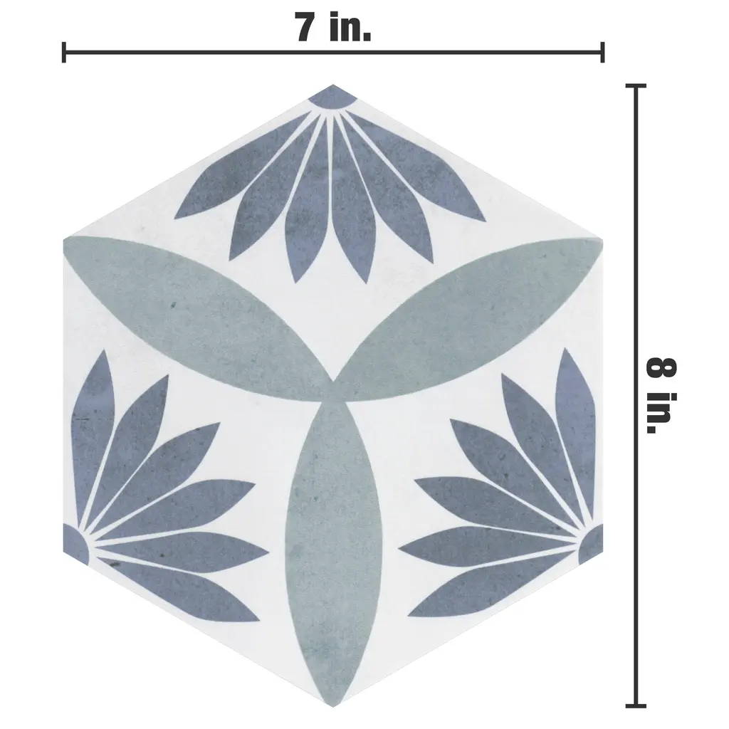 Inspired by a floral look, our Coco Hex Camellia Blue Porcelain Floor and Wall Tile features a smooth, matte finish, providing decorative appeal that adapts to a variety of stylistic contexts. With its impervious, frost-resistant features, this white hexagon tile is an ideal selection for both indoor and outdoor commercial and residential installations, including kitchens, bathrooms, backsplashes, showers, hallways, entryways, patios and fireplace facades. This tile is a perfect choice on its own or paired with other products in the Coco Collection. Tile is the better choice for your space! 7.5 square feet, 25 pieces per case. Case weight is 28.99 lbs. Grade 1, first-quality porcelain tile for floor and wall use 7 in. width x 8 in. length x 0.35 in. thick Glazed, smooth finish with a low sheen and uniform appearance in tone PEI Rating IV has high resistance to abrasion and is suitable for heavy-duty residential and commercial kitchens, hotels, exhibition and sales rooms with some dirt conditions Impervious tiles have a water absorption of less than 0.5% for indoor and outdoor use and are frost resistant This tile is ADA approved for slip resistance with a DCOF value of 0.42 or higher. Completely frost resistant for indoor or outdoor applications; use a latex-modified thinset for acceptable bond strength Please note: A sample of this product may be a partial piece cut from the full size tile in order to provide an affordable and convenient way for customers to judge the quality and finish of this item. Samples are not returnable.