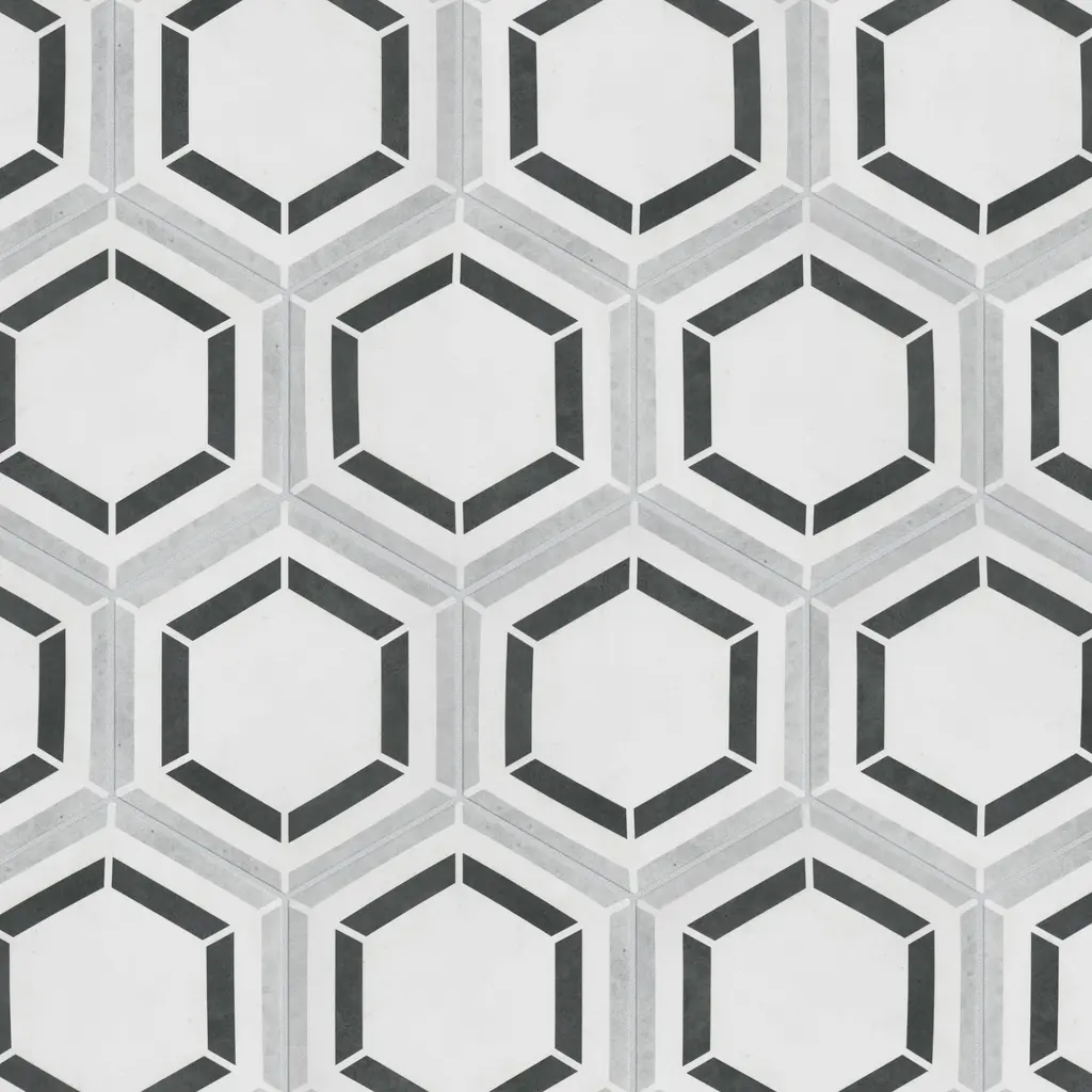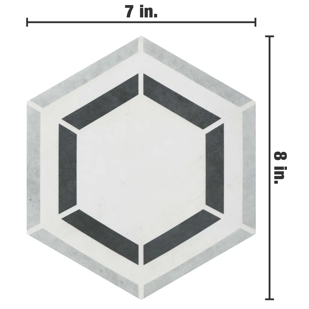 Modeling a geometric look, our Coco Hex Geo Classic Porcelain Floor and Wall Tile features a smooth, matte finish, providing decorative appeal that adapts to a variety of stylistic contexts. With its impervious, frost-resistant features, this gray hexagon tile is an ideal selection for both indoor and outdoor commercial and residential installations, including kitchens, bathrooms, backsplashes, showers, hallways, entryways, patios and fireplace facades. This tile is a perfect choice on its own or paired with other products in the Coco Collection. Tile is the better choice for your space! 7.5 square feet, 25 pieces per case. Case weight is 28.99 lbs. Grade 1, first-quality porcelain tile for floor and wall use 7 in. width x 8 in. length x 0.35 in. thick Glazed, smooth finish with a low sheen and uniform appearance in tone PEI Rating IV has high resistance to abrasion and is suitable for heavy-duty residential and commercial kitchens, hotels, exhibition and sales rooms with some dirt conditions Impervious tiles have a water absorption of less than 0.5% for indoor and outdoor use and are frost resistant This tile is ADA approved for slip resistance with a DCOF value of 0.42 or higher. Completely frost resistant for indoor or outdoor applications; use a latex-modified thinset for acceptable bond strength Please note: A sample of this product may be a partial piece cut from the full size tile in order to provide an affordable and convenient way for customers to judge the quality and finish of this item. Samples are not returnable.