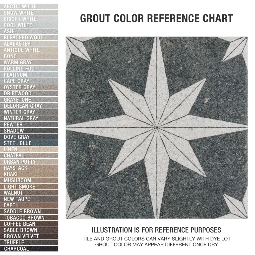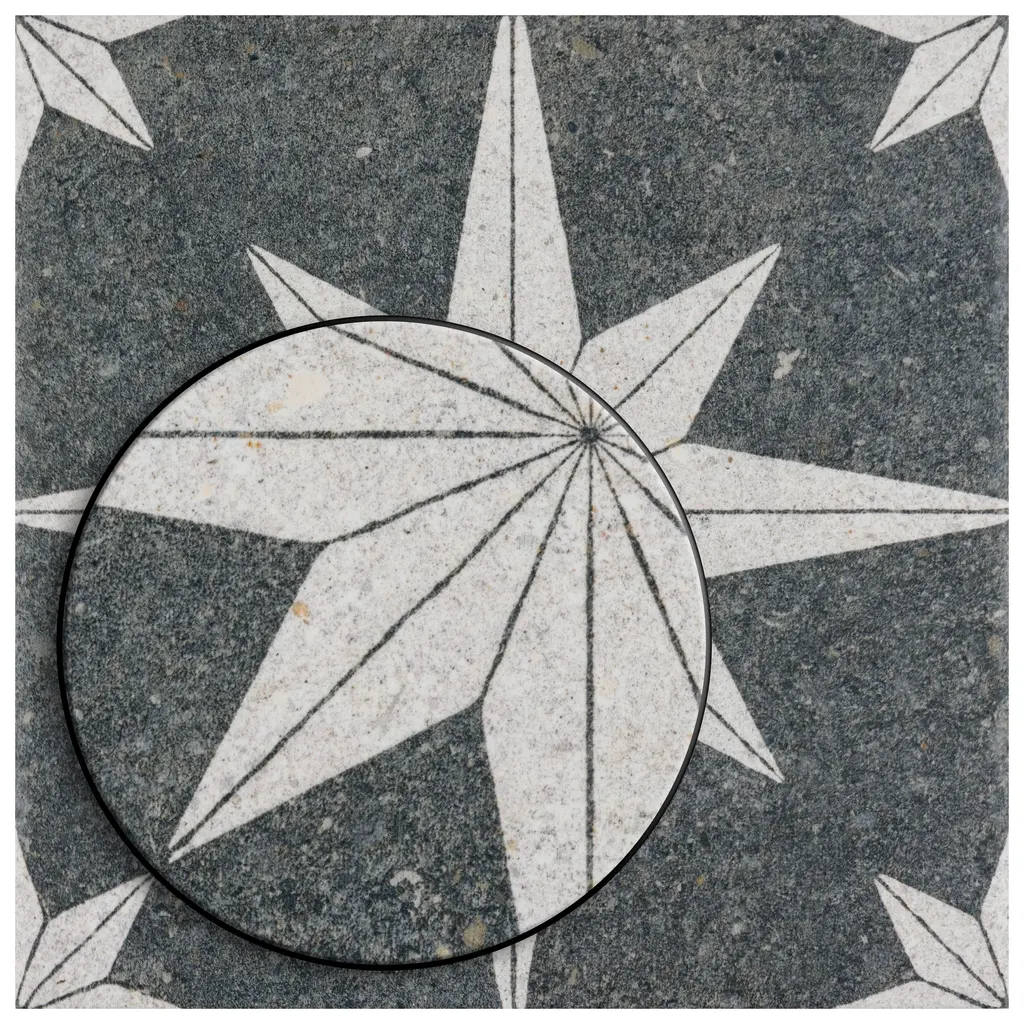 Offering the appearance of patterned natural stone, our Compass Star Lava Stone Porcelain Floor and Wall Tile transforms any space into a functional and stylish extension of nature. This square tile features a large off-white geometric star atop a charcoal black base. Richly detailed with a slightly textured surface, this on-trend porcelain tile offers decorative, rustic beauty through natural mineral-like pattern variations and imitation scuffs and spots, replicating the appearance of natural stone. This stylish stone-look design is visually appealing and versatile, blending beautifully with a range of looks from vintage industrial to modern day. Its impervious and frost-resistant features make this an ideal choice for indoor and outdoor installations including kitchens, bathrooms, backsplashes, showers, entryways, patios and pools. This tile is a perfect choice on its own or paired with other products in the Compass Star collection. Tile is the better choice for your space. This tile is made from natural ingredients, making it a healthy choice as it is free from allergens, VOCs, formaldehyde and PVC. 11.5 square feet, 25 pieces per case. Case weight is 41.69 lbs. Grade 1, first-quality porcelain tile for floor and wall use 8 in. width x 8 in. length x 0.31 in. thick Glazed, slightly textured finish with a low sheen and uniform appearance in tone PEI Rating III is suitable for medium-duty residential floors including kitchens, halls, corridors, balconies, terraces and areas used more often with normal footwear and small amounts of dirt Impervious tiles have a water absorption of less than 0.5% for indoor and outdoor use and are frost resistant This tile is ADA approved for slip resistance with a DCOF value of 0.42 or higher. Completely frost resistant for indoor or outdoor applications; use a latex-modified thinset for acceptable bond strength Please note: A sample of this product may be a partial piece cut from the full size tile in order to provide an affordable and convenient way for customers to judge the quality and finish of this item. Samples are not returnable.