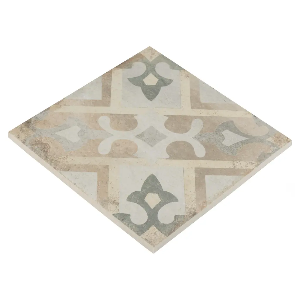 Our D’Anticatto Decor Laterza Porcelain Floor and Wall Tile radiates rustic charm. Mimicking a worn cement appearance, this porcelain tile is a subtle statement piece created by geometric motifs in faded pastel shades of moss green, copper, fog grey and light yellow set on a textured light beige base glaze. With rust colored accents and realistic imitations of scuffs and spots, this encaustic inspired tile evokes a loved, worn and century-old appearance. Available in twenty-five print variations that are randomly scattered throughout each case, the variation throughout each tile mimics an authentic aged appearance. Its impervious, frost-resistant and durable features make this tile and ideal choice for both indoor and outdoor residential installations including, backsplashes, kitchens, bathrooms, showers, entryways and patios. This tile is a perfect choice on its own or paired with other products in the D’Anticatto Collection. Tile is the better choice for your space. This tile is made from natural ingredients, making it a healthy choice as it is free from allergens, VOCs, formaldehyde and PVC. 11.0 square feet, 20 pieces per case. Case weight is 45.88 lbs. Grade 1, first-quality porcelain tile for floor and wall use 8.75 in. width x 8.75 in. length x 0.38 in. thick Glazed, medium textured finish with a low sheen and moderate variation in tone PEI Rating III is suitable for medium-duty residential floors including kitchens, halls, corridors, balconies, terraces and areas used more often with normal footwear and small amounts of dirt Impervious tiles have a water absorption of less than 0.5% for indoor and outdoor use and are frost resistant This tile is ADA approved for slip resistance with a DCOF value of 0.42 or higher. Completely frost resistant for indoor or outdoor applications; use a latex-modified thinset for acceptable bond strength Please note: A sample of this product may be a partial piece cut from the full size tile in order to provide an affordable and convenient way for customers to judge the quality and finish of this item. Samples are not returnable.