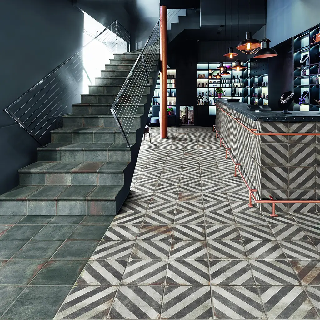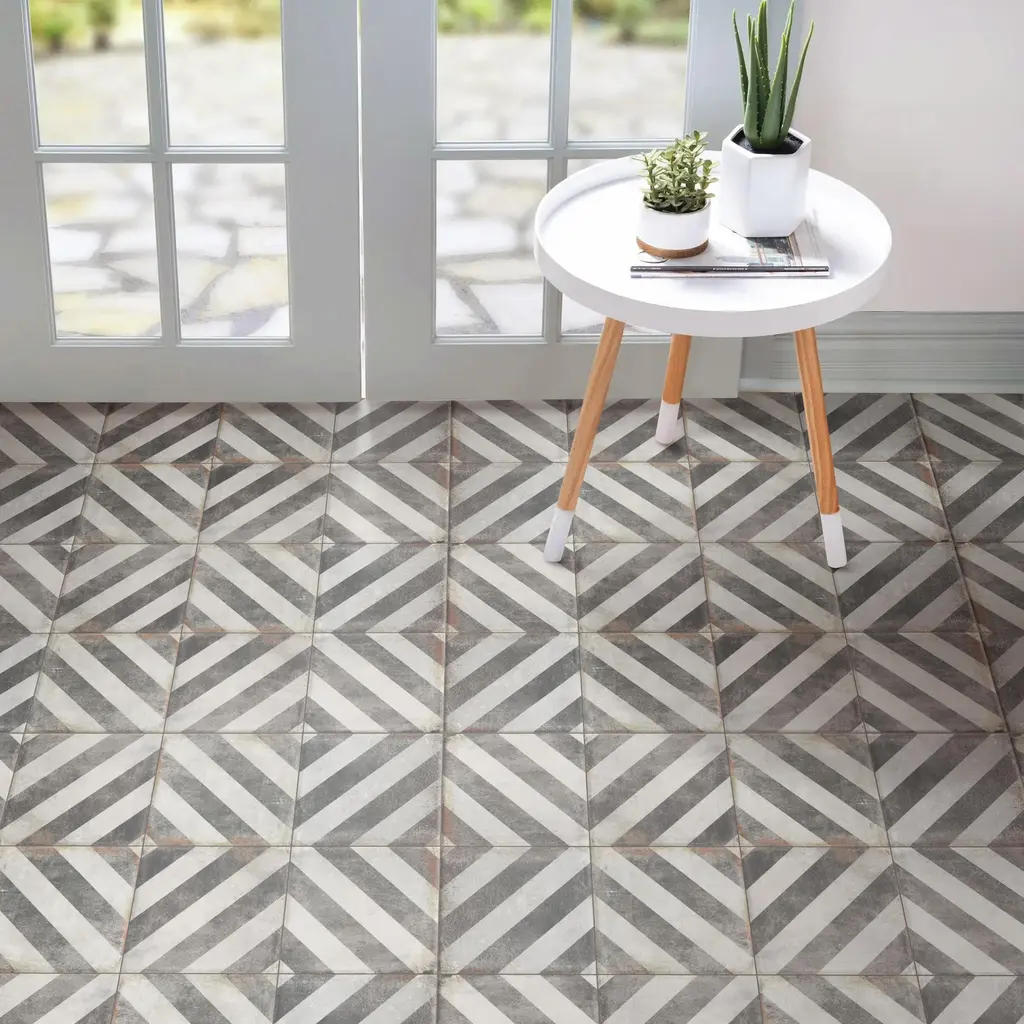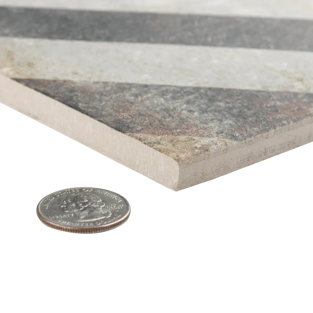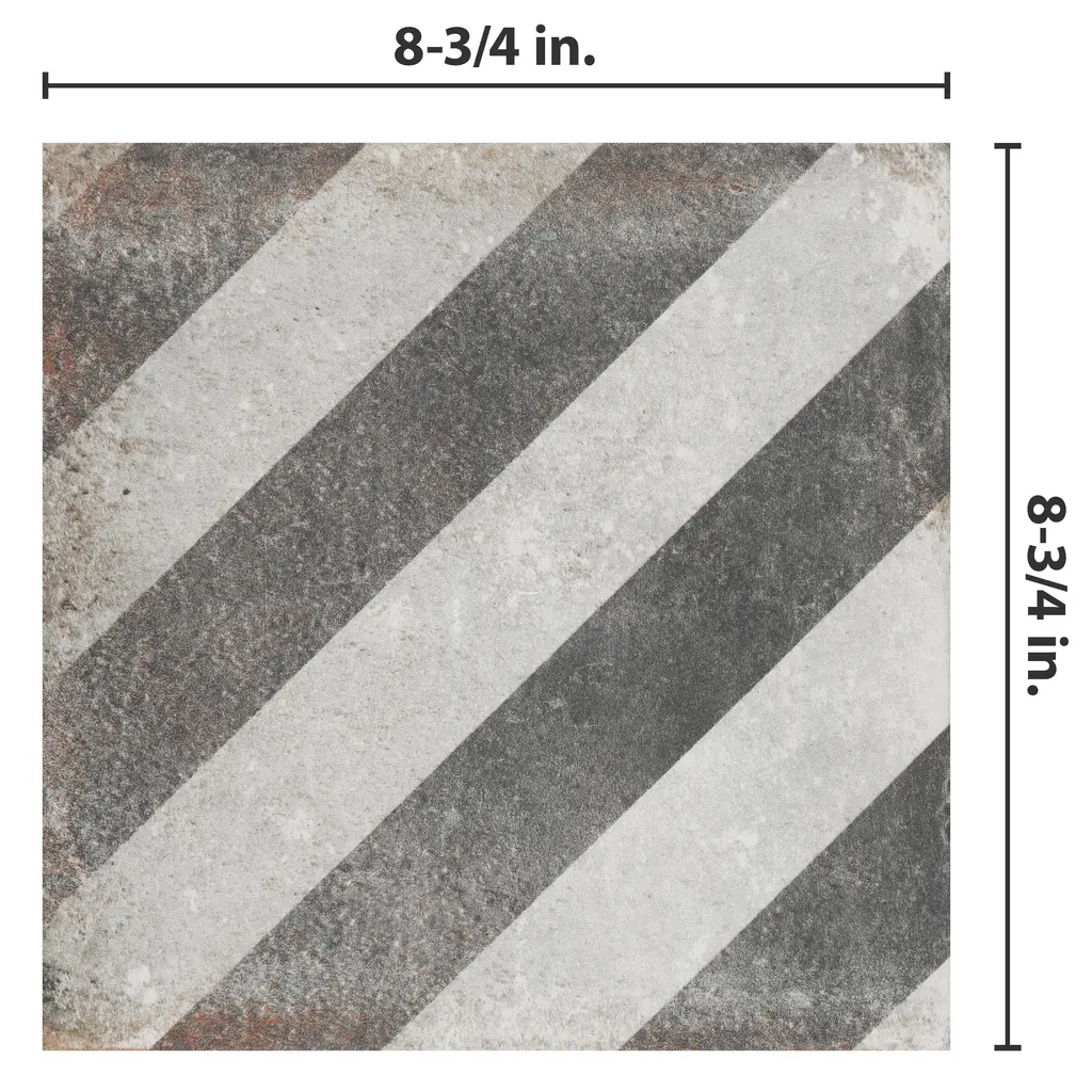 Our D’Anticatto Decor Obliqua Porcelain Floor and Wall Tile radiates rustic charm. Mimicking a worn cement appearance, this porcelain tile is a subtle statement piece created by linear patterns in faded charcoal grey set on a textured light beige base glaze. This tile can be installed in several different geometric patterns. With rust colored accents and realistic imitations of scuffs and spots, this encaustic inspired tile evokes a loved, worn and century-old appearance. Available in twenty-five print variations that are randomly scattered throughout each case, the variation throughout each tile mimics an authentic aged appearance. Its impervious, frost-resistant and durable features make this tile and ideal choice for both indoor and outdoor residential installations including, backsplashes, kitchens, bathrooms, showers, entryways and patios. This tile is a perfect choice on its own or paired with other products in the D’Anticatto Collection. Tile is the better choice for your space. This tile is made from natural ingredients, making it a healthy choice as it is free from allergens, VOCs, formaldehyde and PVC. 11.0 square feet, 20 pieces per case. Case weight is 45.88 lbs. Grade 1, first-quality porcelain tile for floor and wall use 8.75 in. width x 8.75 in. length x 0.38 in. thick Glazed, medium textured finish with a low sheen and moderate variation in tone PEI Rating III is suitable for medium-duty residential floors including kitchens, halls, corridors, balconies, terraces and areas used more often with normal footwear and small amounts of dirt Impervious tiles have a water absorption of less than 0.5% for indoor and outdoor use and are frost resistant This tile is ADA approved for slip resistance with a DCOF value of 0.42 or higher. Completely frost resistant for indoor or outdoor applications; use a latex-modified thinset for acceptable bond strength Please note: A sample of this product may be a partial piece cut from the full size tile in order to provide an affordable and convenient way for customers to judge the quality and finish of this item. Samples are not returnable.