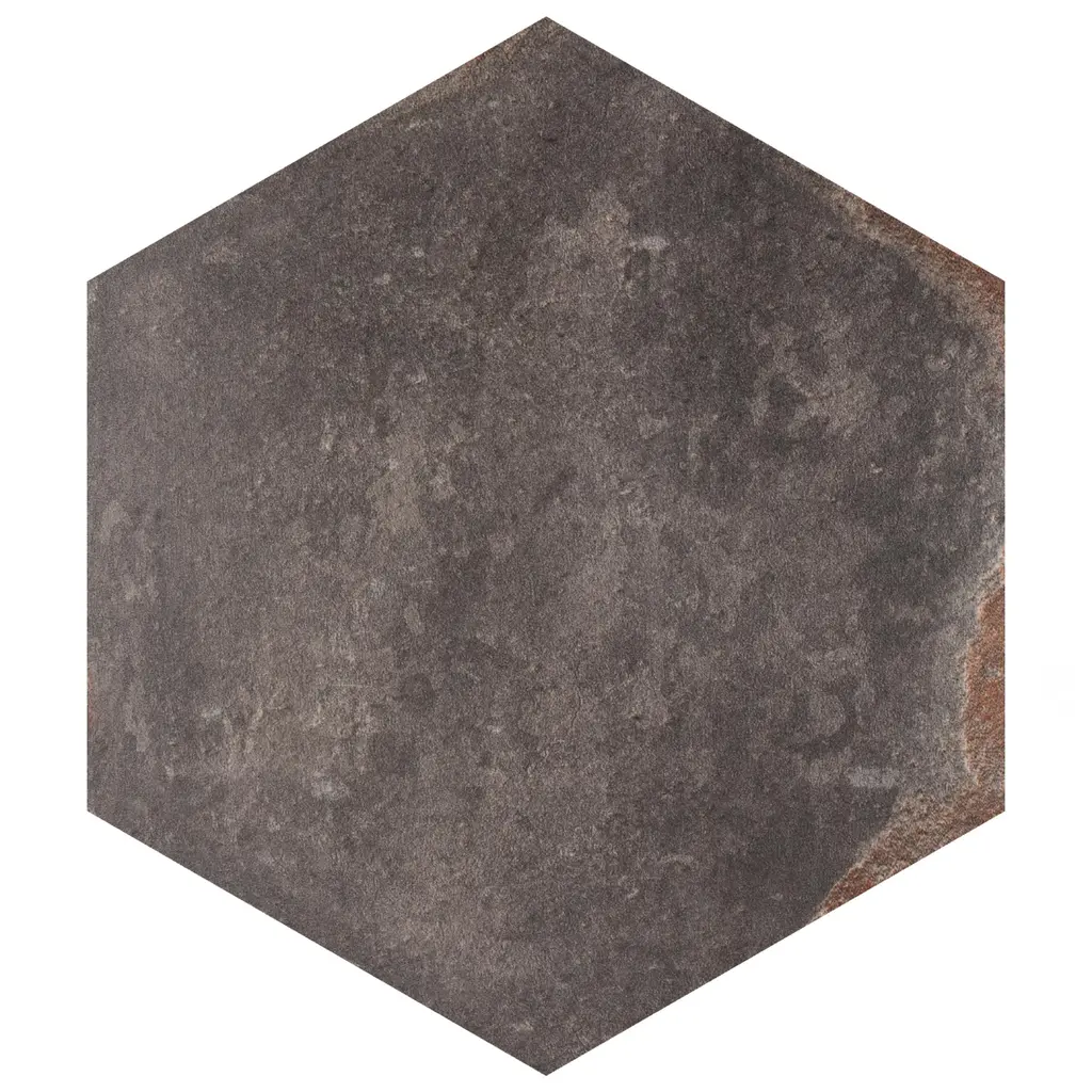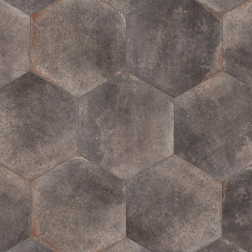 Our D'Anticatto Hex Notte Porcelain Floor and Wall Tile radiates rustic charm. Mimicking a worn cement appearance, this porcelain hexagon tile is a subtle statement piece created by faded shades of charcoal grey and white. With rust colored accents and realistic imitations of scuffs and spots, this encaustic inspired tile evokes a loved, worn and century-old appearance. Available in twenty-six print variations that are randomly scattered throughout each case, the variation throughout each tile mimics an authentic aged appearance. Its impervious, frost-resistant and durable features make this tile and ideal choice for both indoor and outdoor residential installations including, backsplashes, kitchens, bathrooms, showers, entryways and patios. This tile is a perfect choice on its own or paired with other products in the D'Anticatto Collection. Tile is the better choice for your space. This tile is made from natural ingredients, making it a healthy choice as it is free from allergens, VOCs, formaldehyde and PVC. 11.25 square feet, 15 pieces per case. Case weight is 48.57 lbs. Grade 1, first-quality porcelain tile for floor and wall use 11 in. width x 12.75 in. length x 0.38 in. thick Glazed, slightly textured finish with a medium sheen and moderate variation in tone PEI Rating II is suitable for all interior walls and light foot traffic such as powder rooms Impervious tiles have a water absorption of less than 0.5% for indoor and outdoor use and are frost resistant This tile is ADA approved for slip resistance with a DCOF value of 0.42 or higher. Completely frost resistant for indoor or outdoor applications; use a latex-modified thinset for acceptable bond strength Please note: A sample of this product may be a partial piece cut from the full size tile in order to provide an affordable and convenient way for customers to judge the quality and finish of this item. Samples are not returnable.
