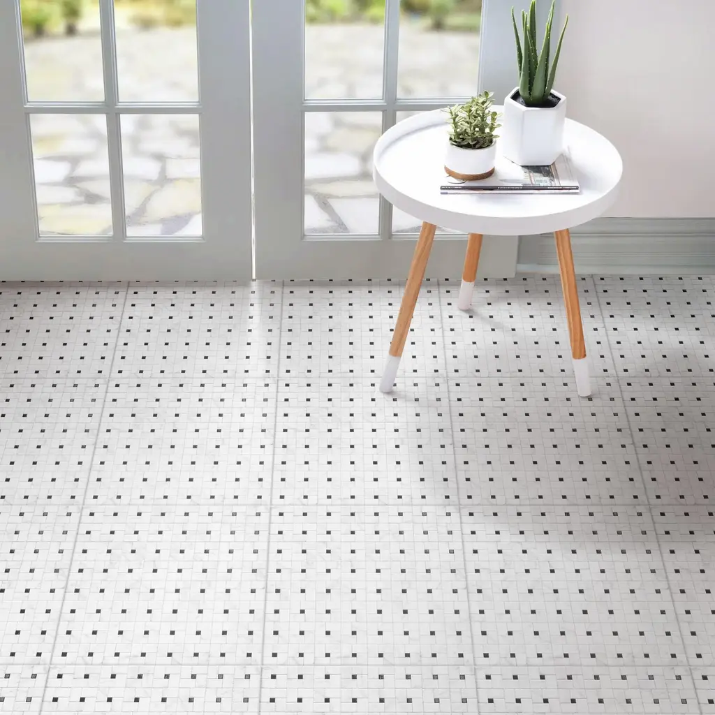 Capturing the appearance of a marble look, our Domitia Cordoba Porcelain Floor and Wall Tile features a smooth, mixed finish, providing decorative appeal that adapts to a variety of stylistic contexts. With its impervious, frost-resistant features, this white square tile is an ideal selection for both indoor and outdoor commercial and residential installations, including kitchens, bathrooms, backsplashes, showers, hallways, entryways, patios and fireplace facades. This tile is a perfect choice on its own or paired with other products in the Domitia Collection. Tile is the better choice for your space! 14.91 square feet, 7 pieces per case. Case weight is 63.27 lbs. Grade 1, first-quality porcelain tile for floor and wall use 17.38 in. width x 17.38 in. length x 0.39 in. thick Glazed, smooth finish with a mixed finish and uniform appearance in tone PEI Rating IV has high resistance to abrasion and is suitable for heavy-duty residential and commercial kitchens, hotels, exhibition and sales rooms with some dirt conditions Impervious tiles have a water absorption of less than 0.5% for indoor and outdoor use and are frost resistant This tile is ADA approved for slip resistance with a DCOF value of 0.42 or higher. Completely frost resistant for indoor or outdoor applications; use a latex-modified thinset for acceptable bond strength Please note: A sample of this product may be a partial piece cut from the full size tile in order to provide an affordable and convenient way for customers to judge the quality and finish of this item. Samples are not returnable.