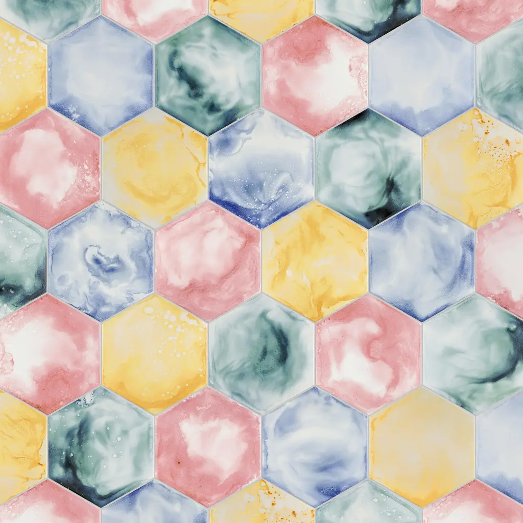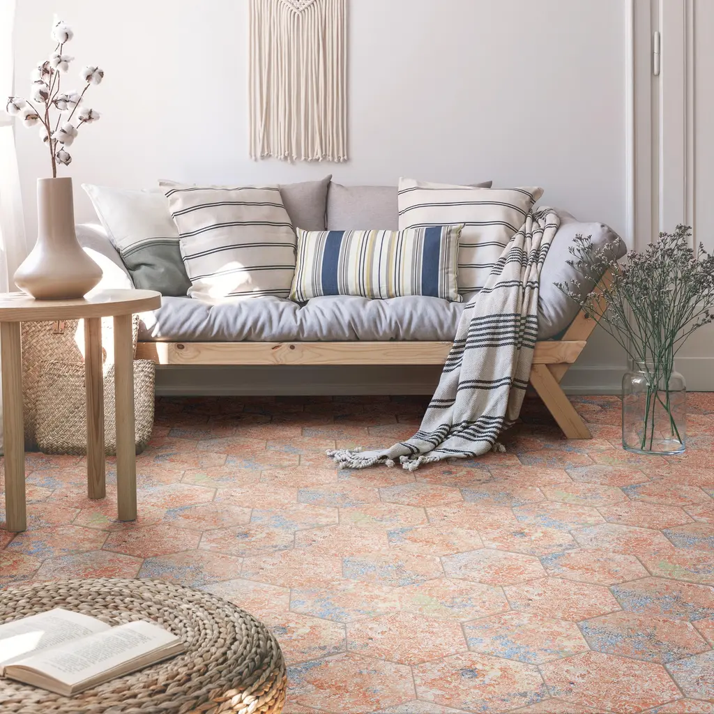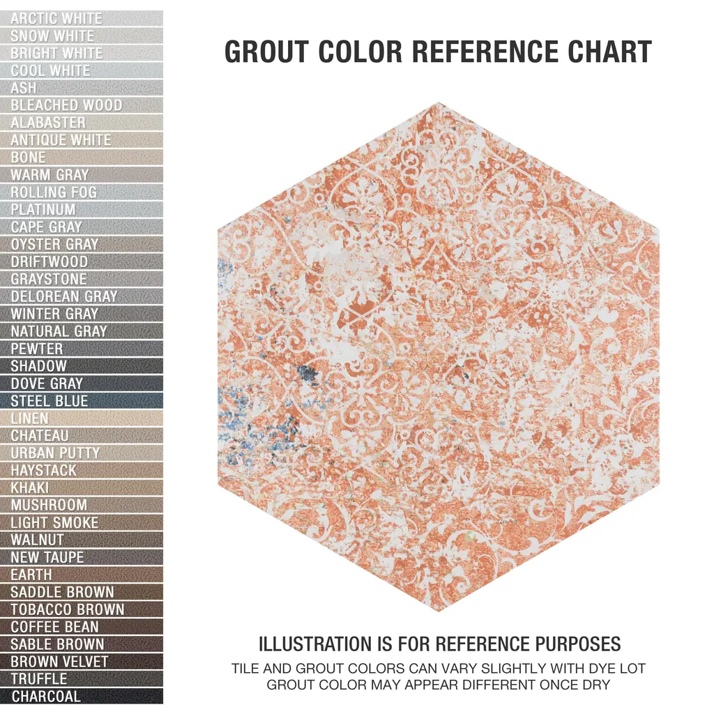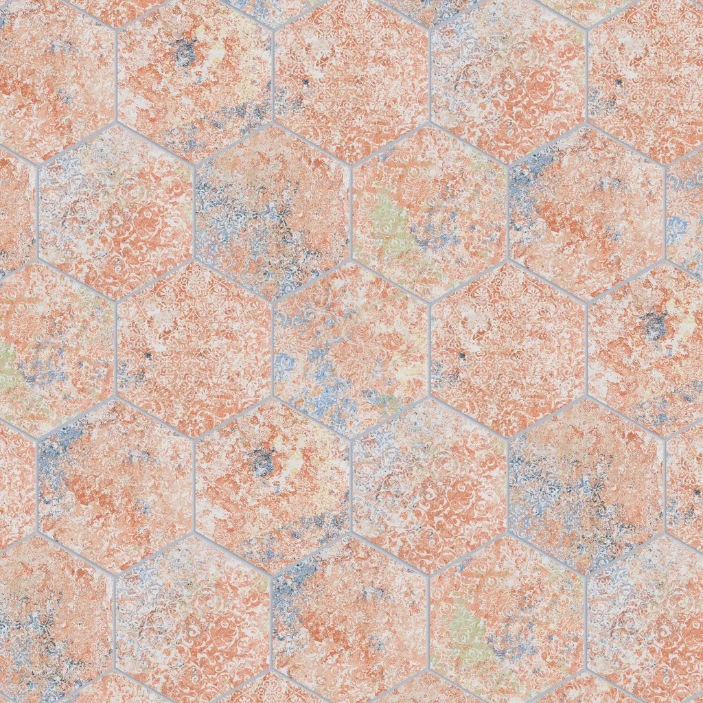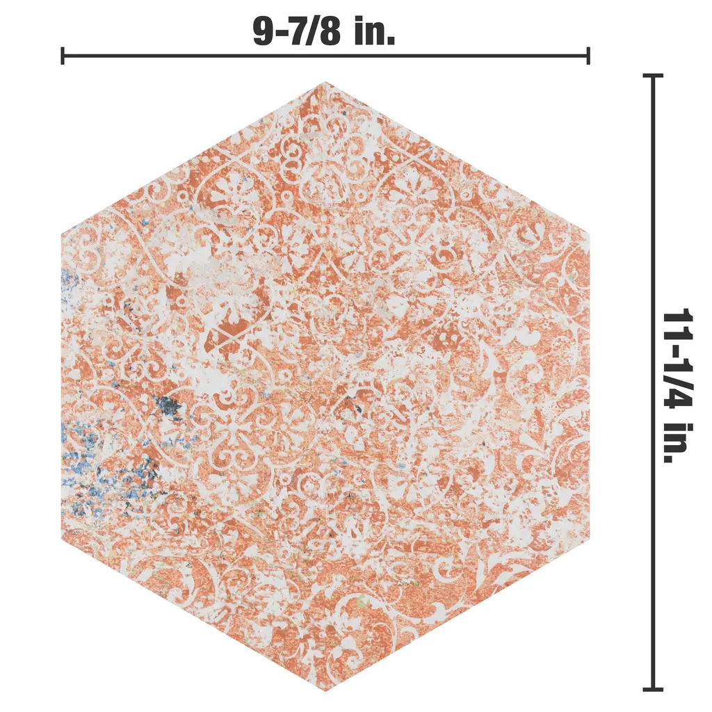 Mimicking a worn cement appearance with subtle textile designs, our Emotion Hex Red Porcelain floor and Wall Tile offers decorative vintage charm. This hexagon tile features delicate floral motifs that are complemented by weathered pattern variations in vibrant red, yellow, blue, and green tones. With a slightly textured, satin finish, this cement-look porcelain tile blends into virtually any design theme, ranging from contemporary projects to traditional installations. Available in thirty print variations that are randomly scattered throughout each case, the variation throughout each tile mimics an authentic aged appearance. Its impervious, frost-resistant, and durable features make this an ideal choice for indoor and outdoor commercial and residential installations including kitchens, bathrooms, backsplashes, showers, hallways, entryways, and patios. Tile is the better choice for your space. This tile is made from natural ingredients, making it a healthy choice as it is free from allergens, VOCs, formaldehyde, and PVC. 10.03 square feet, 17 pieces per case. Case weight is 48 lbs. Grade 1, first-quality porcelain tile for floor and wall use 9.88 in. width x 11.25 in. length x 0.38 in. thick Glazed, slightly textured finish with a medium sheen and moderate variation in tone PEI Rating IV has high resistance to abrasion and is suitable for heavy-duty residential and commercial kitchens, hotels, exhibition and sales rooms with some dirt conditions Impervious tiles have a water absorption of less than 0.5% for indoor and outdoor use and are frost resistant This tile has a COF wet rating less than or equal to 0.50 and is considered to have a marginally low skid resistance. This tile is not ADA approved for slip resistance. Completely frost resistant for indoor or outdoor applications; use a latex-modified thinset for acceptable bond strength Please note: A sample of this product may be a partial piece cut from the full size tile in order to provide an affordable and convenient way for customers to judge the quality and finish of this item. Samples are not returnable.