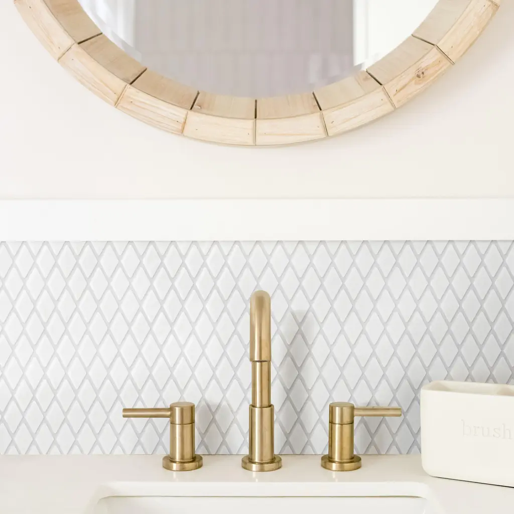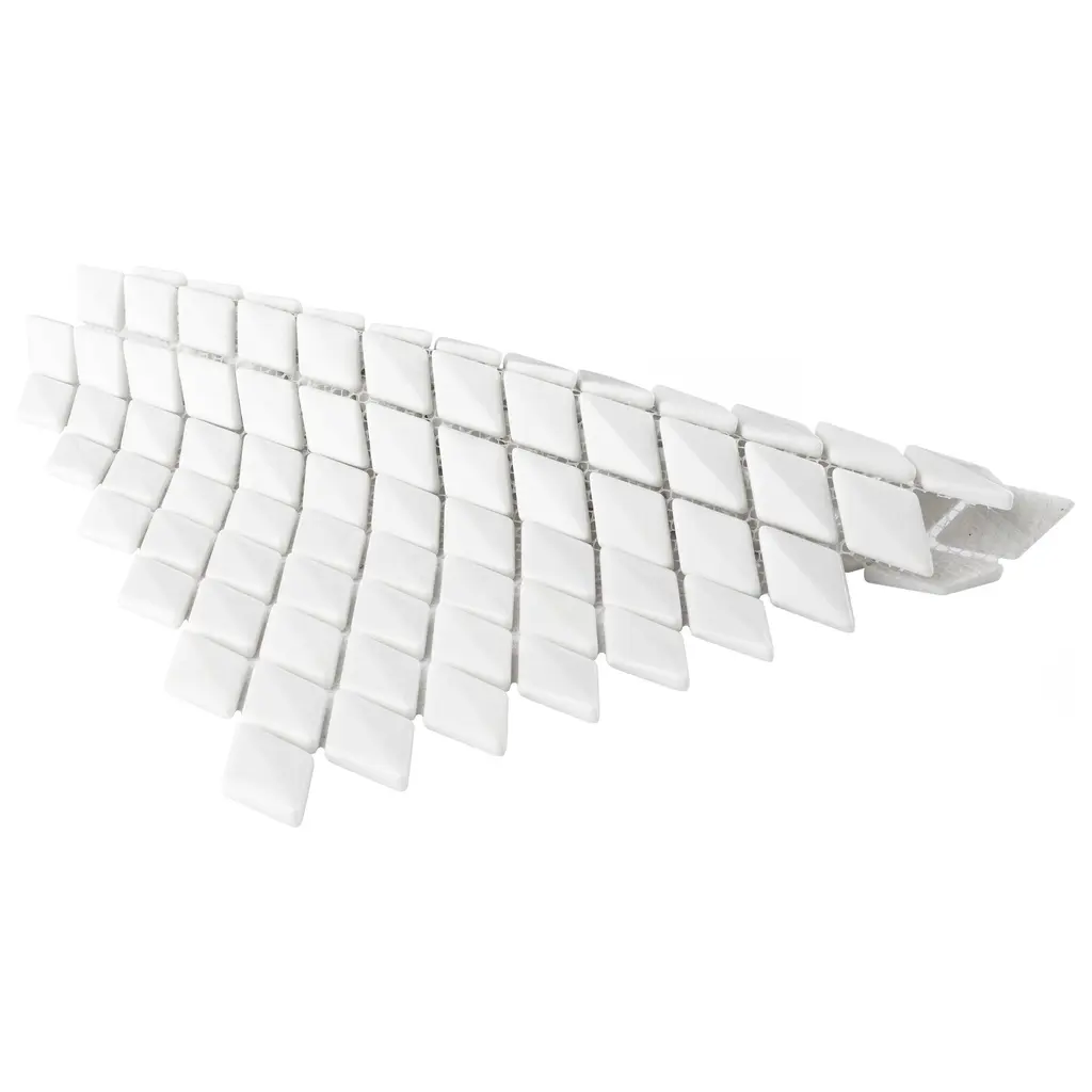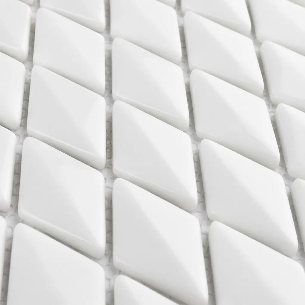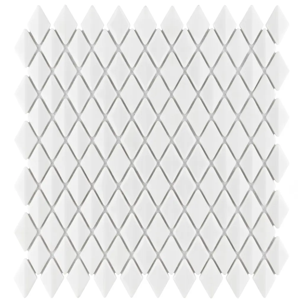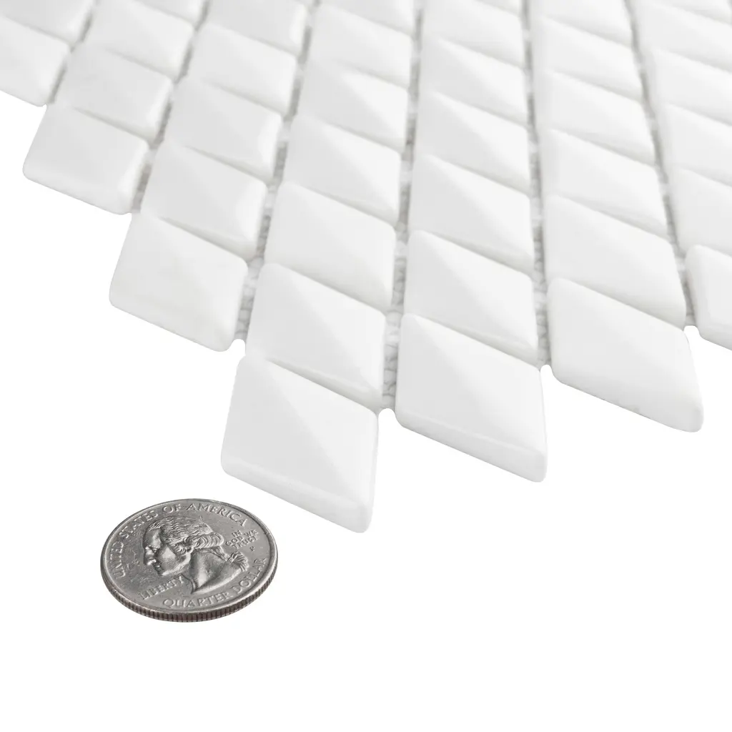 Our Expressions Beveled Diamond White Glass Mosaic Tile is made of recycled pressed glass. The small white beveled diamonds feature a stunning mixed finish for added dimension. With characteristics of unglazed porcelain tile, this mosaic is impervious and frost resistant. These mesh-mounted tiles offer a high durability rating that is great for any interior or exterior space. Tile is the better choice for your space. This tile is made from natural ingredients, making it a healthy choice as it is free from allergens, VOCs, formaldehyde and PVC. 0.99 square foot per piece, each piece sold individually. Piece weight equals 2.5 lbs. Grade 1, first-quality glass tile for floor and wall use 11.63 in. width x 12 in. length x 0.26 in. thick mesh-mounted mosaic Unglazed, smooth finish with a mixed finish and uniform appearance in tone PEI Rating IV has high resistance to abrasion and is suitable for heavy-duty residential and commercial kitchens, hotels, exhibition and sales rooms with some dirt conditions Impervious tiles have a water absorption of less than 0.5% for indoor and outdoor use and are frost resistant This tile has a COF wet rating less than or equal to 0.50 and is considered to have a marginally low skid resistance. This tile is not ADA approved for slip resistance. Completely frost resistant for indoor or outdoor applications; use a latex-modified thinset for acceptable bond strength ImportedPlease note: A sample of this product may be a partial piece cut from the full size tile in order to provide an affordable and convenient way for customers to judge the quality and finish of this item. Samples are not returnable.