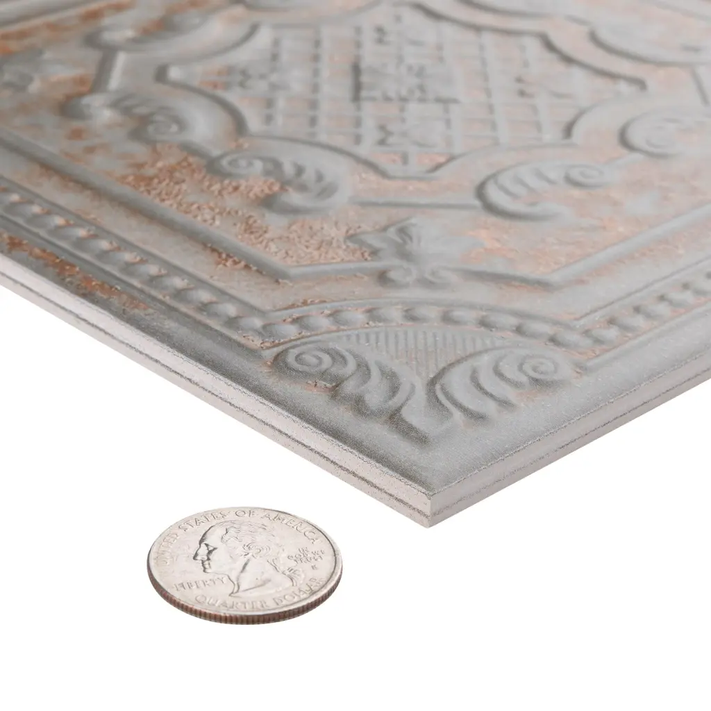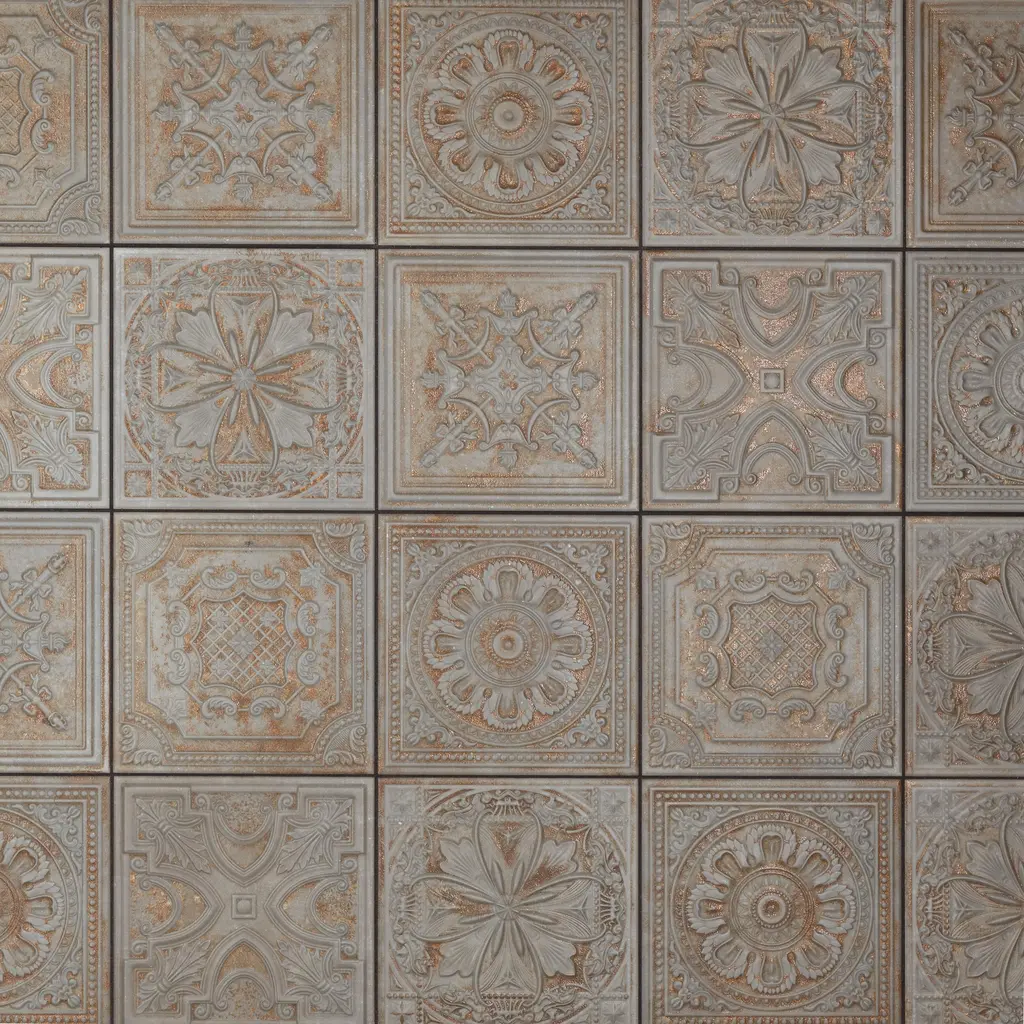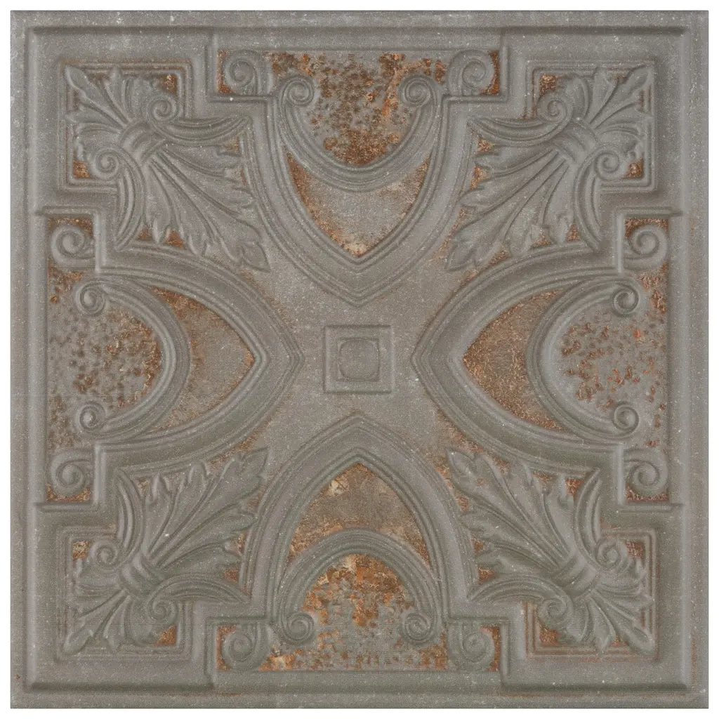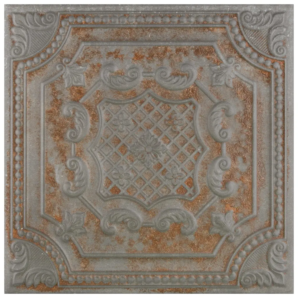 Reminiscent of antique tin ceiling tiles, our Fitz Charcoal Ceramic Wall Tile offers authentic vintage appeal. This decorative square tile features embossed old-world motifs in dark grey and rust color tones with splashes of glossy glazing. With a textured, mixed finish surface, this ceramic tile can blend into virtually any design theme, ranging from contemporary projects to traditional installation. Available in 40 print variations that are randomly scattered throughout each case, the variation throughout each tile mimics an authentic aged appearance. Its glazed feature makes it an ideal choice for indoor wall installations including kitchen backsplashes, bathroom showers, and fireplace facades. Tile is the better choice for your space. This tile is made from natural ingredients, making it a healthy choice as it is free from allergens, VOCs, formaldehyde, and PVC. 9.9 square feet, 22 pieces per case. Case weight is 23.1 lbs. Grade 1, first-quality ceramic tile for wall use 8 in. width x 8 in. length x 0.27 in. thick Unglazed, medium textured finish with a mixed finish and moderate variation in tone PEI Rating 0 is suitable for wall use only Non-Vitreous tiles have water absorption of more than 7% for indoor use DCOF value is not available for this product. Please reference the PEI and MOHS rating for installation. Not frost resistant Please note: A sample of this product may be a partial piece cut from the full size tile in order to provide an affordable and convenient way for customers to judge the quality and finish of this item. Samples are not returnable.