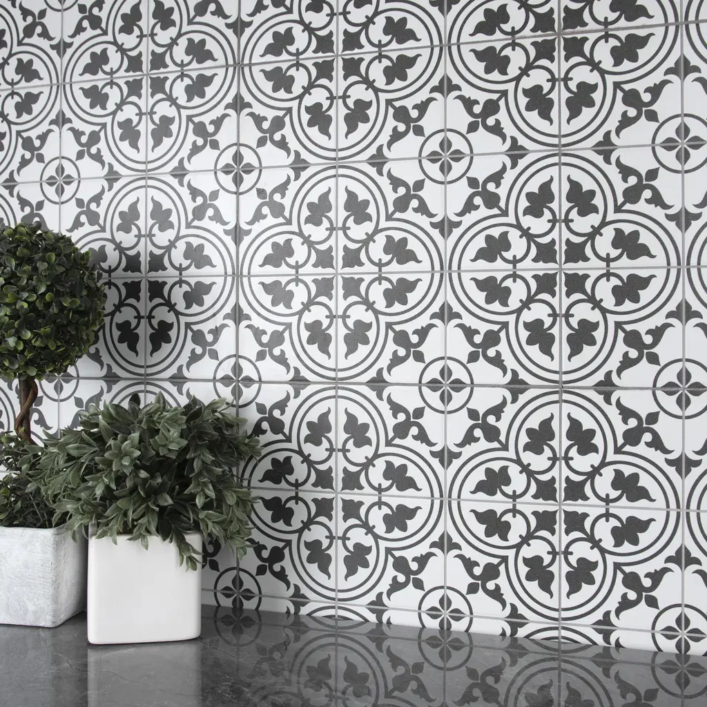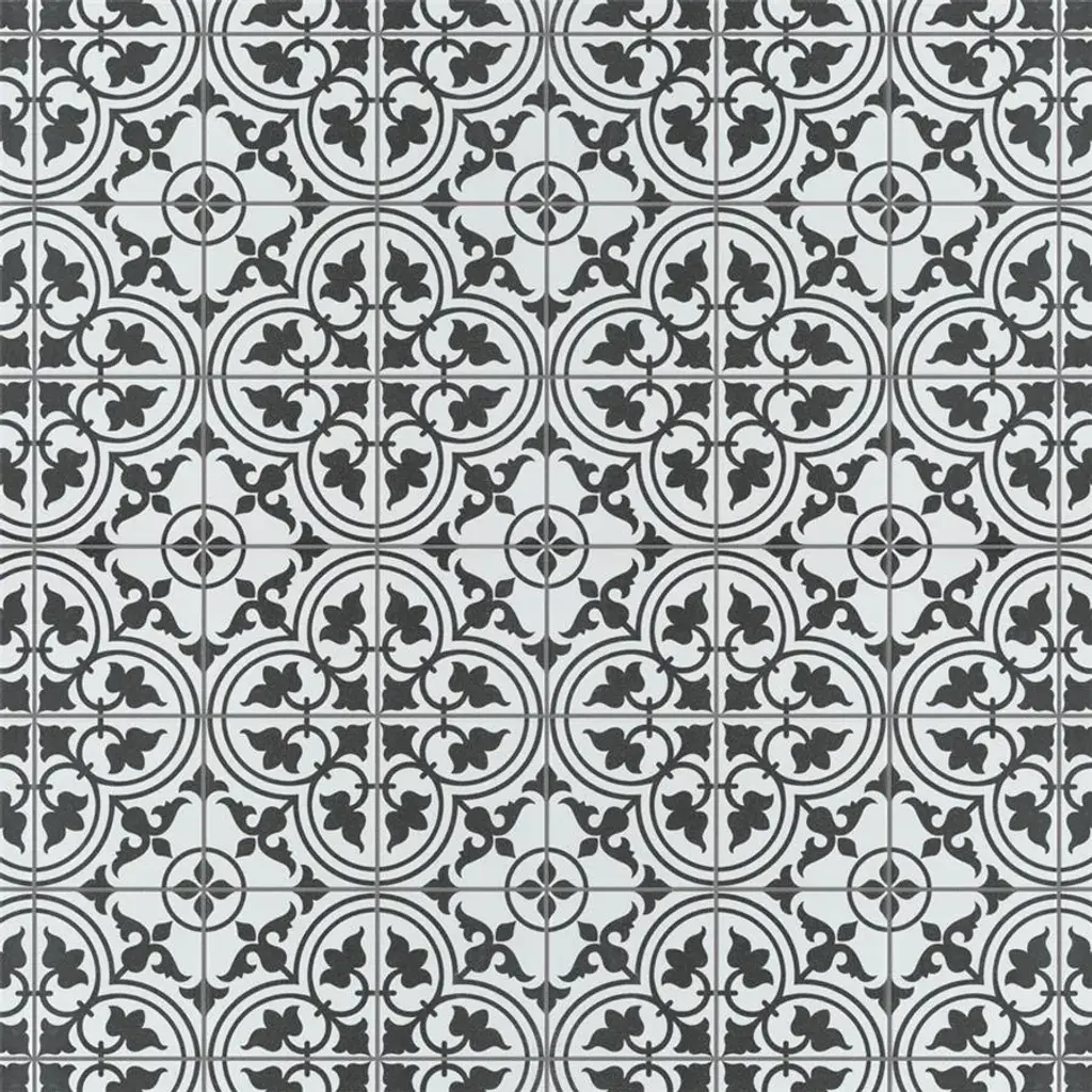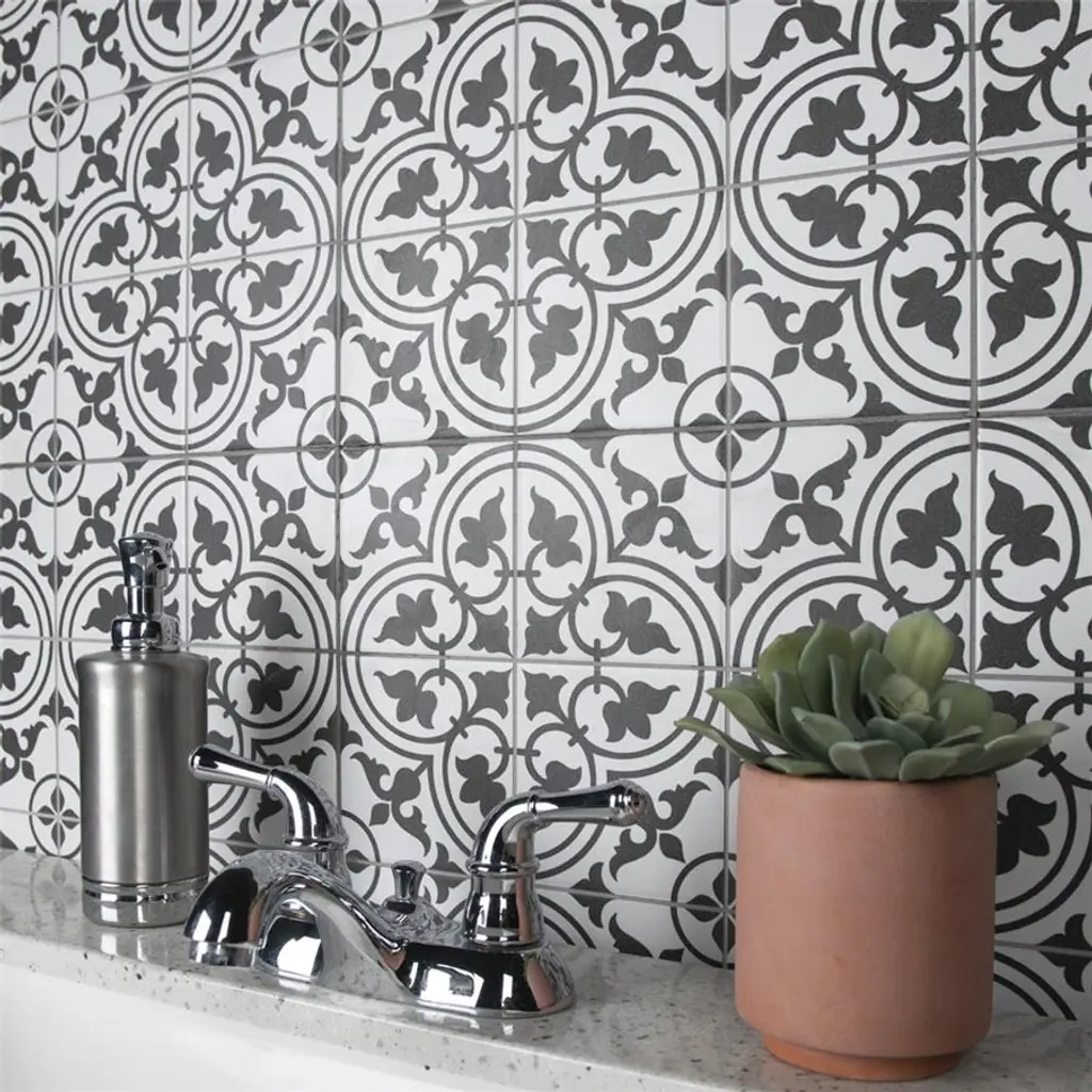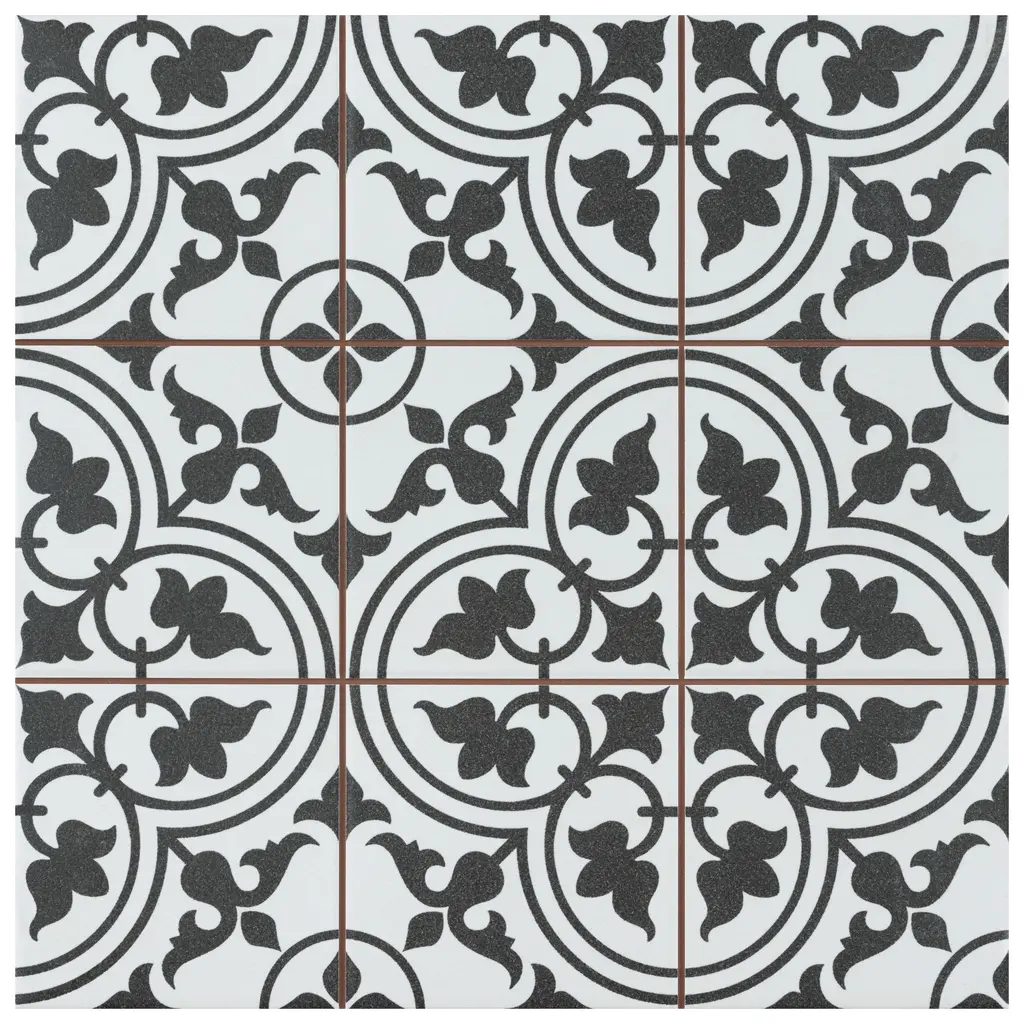 Our Harmonia Classic White Ceramic Floor and Wall Tile creates the look of a stunning leading-edge mosaic-like design with the harmonious, easy installation of a square tile. Inspired by our best-selling Arte White, this ceramic encaustic-inspired tile similarly features floral old-world patterns in rich charcoal black that frames dueling arcs in the center, offering subtle contrast and dimension to the decoration. Set on the highest-quality snow white base glaze, the contrasting design features a weathered, speckled look, replicating the beauty of its cement muse. The floral, geometric pattern blends into virtually any design theme, making this an exceptional product for modern installations and historic renovations. Save time and labor spent arranging mosaic sheets and instead install these durable ceramic slabs, which have squares separated by scored grout lines. The scored grout lines can be grouted with the color of your choice to further customize your installation. Its glazed and durable features make it an ideal choice for both commercial and residential indoor installations including kitchens, bathrooms, backsplashes, showers, and entryways. Tile is the better choice for your space. This tile is made from natural ingredients, making it a healthy choice as it is free from allergens, VOCs, formaldehyde and PVC. 12.0 square feet, 10 pieces per case. Case weight is 51.1 lbs. Grade 1, first-quality ceramic tile for floor and wall use 13 in. width x 13 in. length x 0.37 in. thick Glazed, slightly textured finish with a low sheen and uniform appearance in tone PEI Rating IV has high resistance to abrasion and is suitable for heavy-duty residential and commercial kitchens, hotels, exhibition and sales rooms with some dirt conditions Semi-Vitreous tiles have water absorption of more than 3% but less than 7% for indoor use This tile is ADA approved for slip resistance with a DCOF value of 0.42 or higher. Not frost resistant Please note: A sample of this product may be a partial piece cut from the full size tile in order to provide an affordable and convenient way for customers to judge the quality and finish of this item. Samples are not returnable.