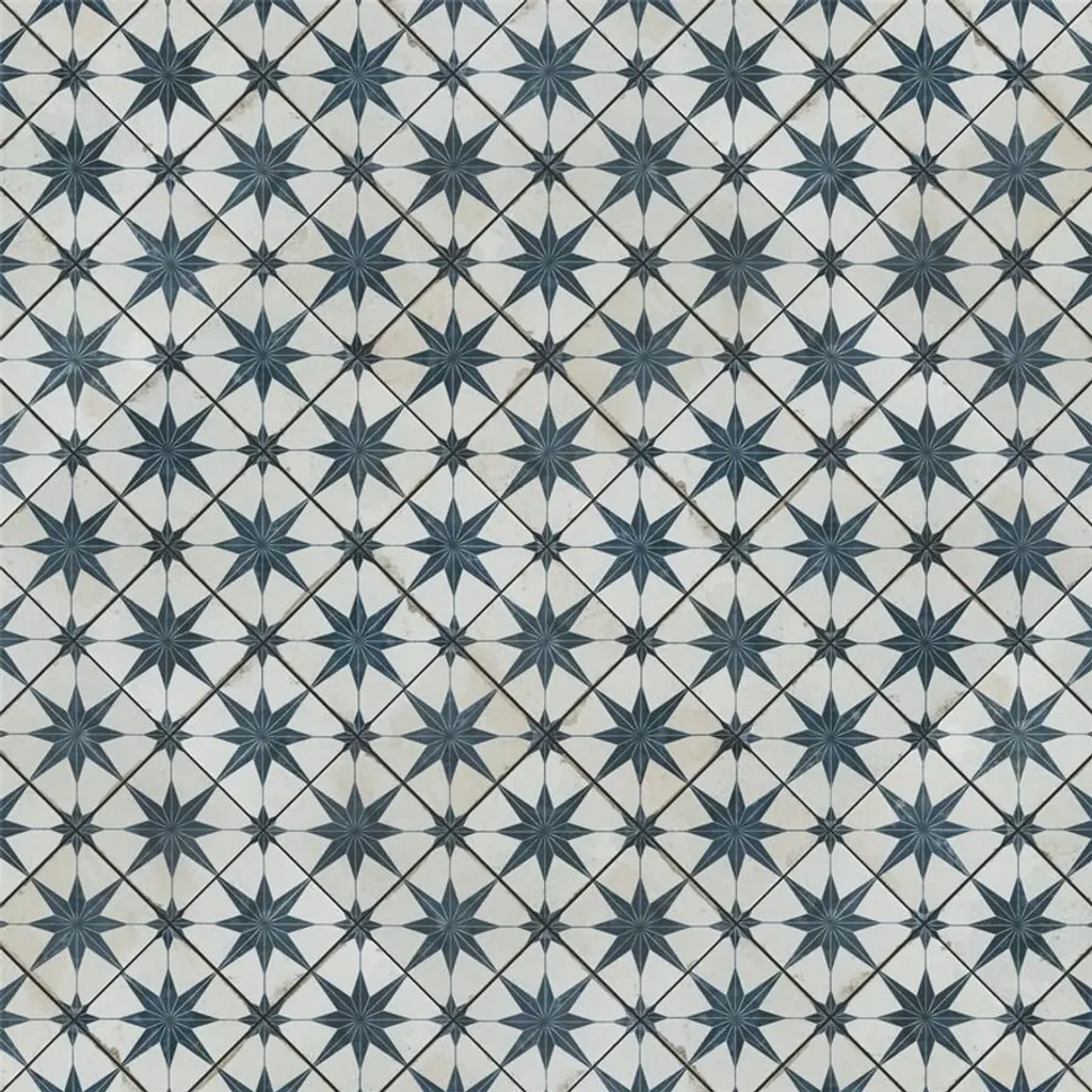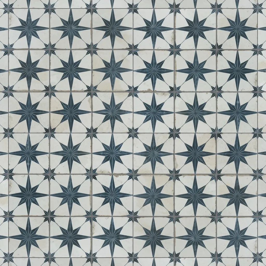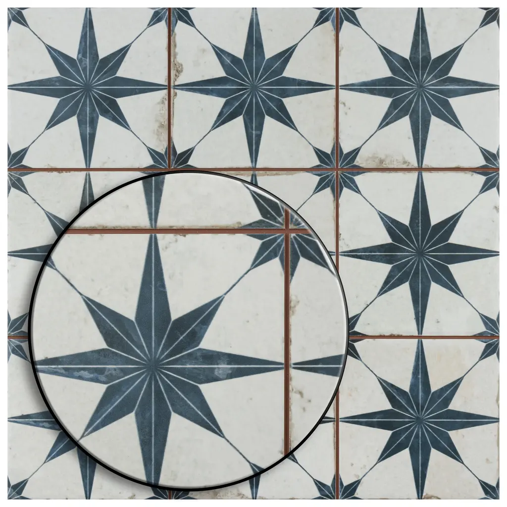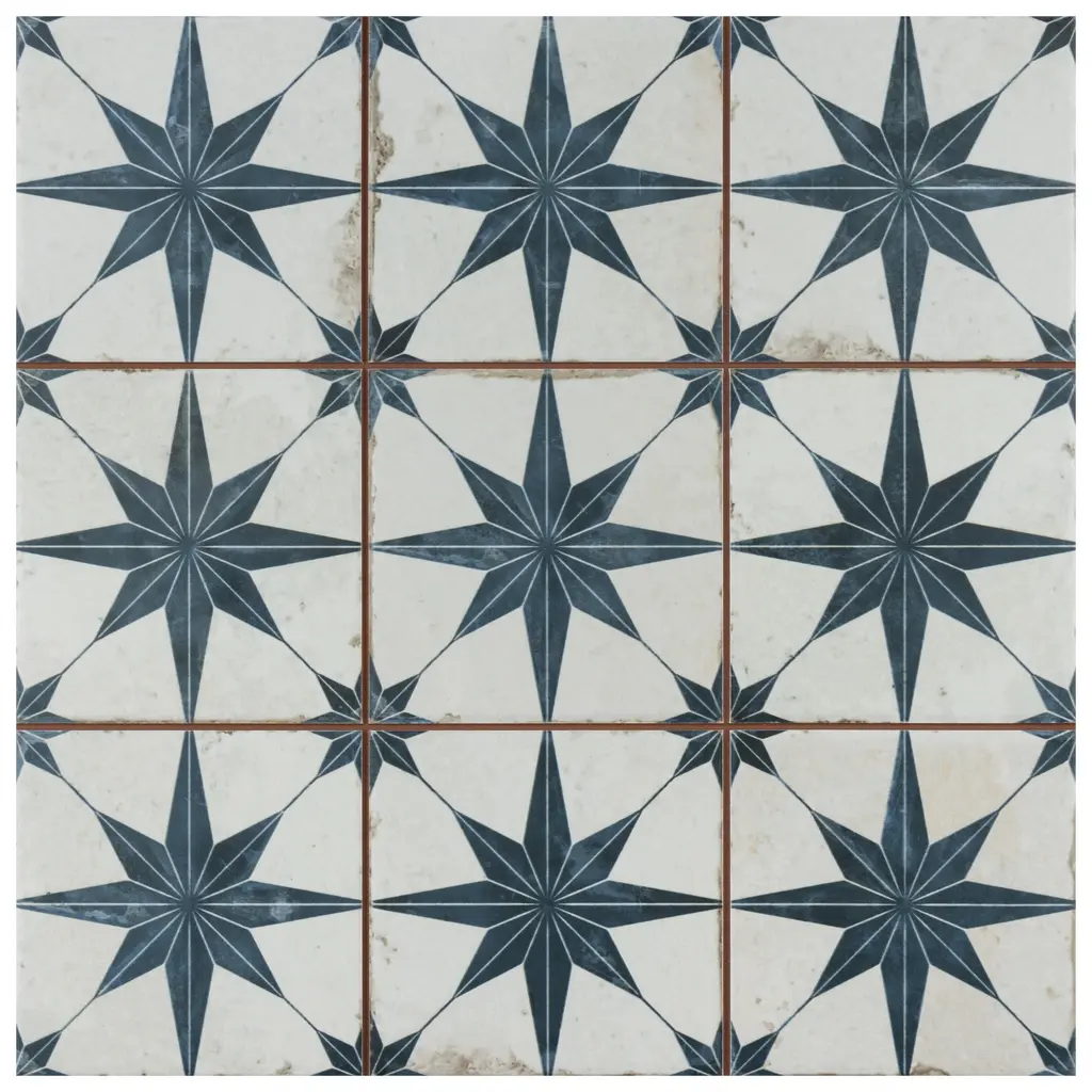 Our Harmonia Kings Star Blue Ceramic Floor and Wall Tile creates the look of a stunning leading-edge mosaic-like design with the harmonious, easy installation of a square tile. Inspired by our best-selling Kings Star Blue, this ceramic encaustic-inspired tile similarly features a unique, low-sheen glaze in faded antique white tones with centered denim blue star patterns in each square. With realistic imitations and scuffs and spots that are the marks of well-loved, worn, century-old tile, this floor and wall tile is a true reflection of vintage industrial design. These scuffs and spots convince that this tile is truly aged, bringing rustic charm to any interior setting. Save time and labor spent arranging mosaic sheets and instead install these durable ceramic slabs, which have squares separated by scored grout lines. The scored grout lines can be grouted with the color of your choice to further customize your installation. Its glazed and durable features make it an ideal choice for both commercial and residential indoor installations including kitchens, bathrooms, backsplashes, showers, and entryways. Tile is the better choice for your space. This tile is made from natural ingredients, making it a healthy choice as it is free from allergens, VOCs, formaldehyde and PVC.