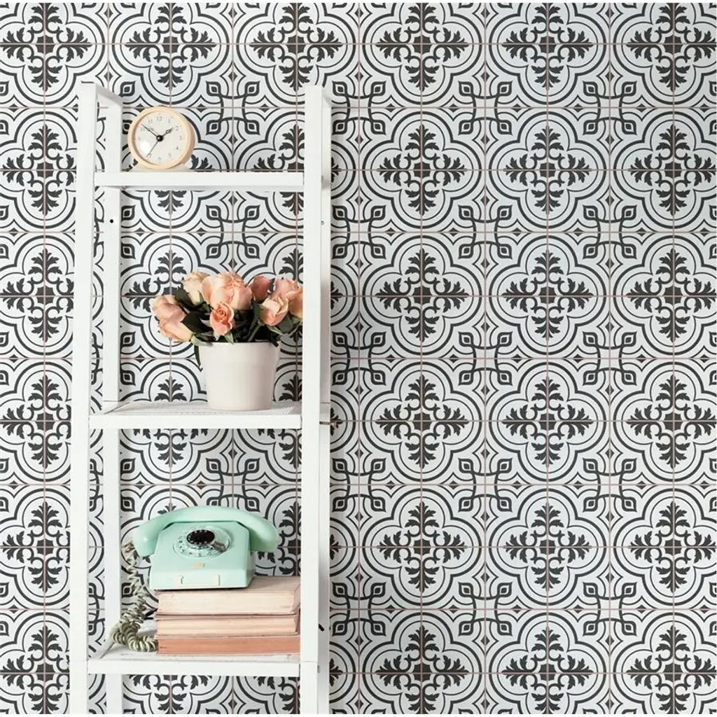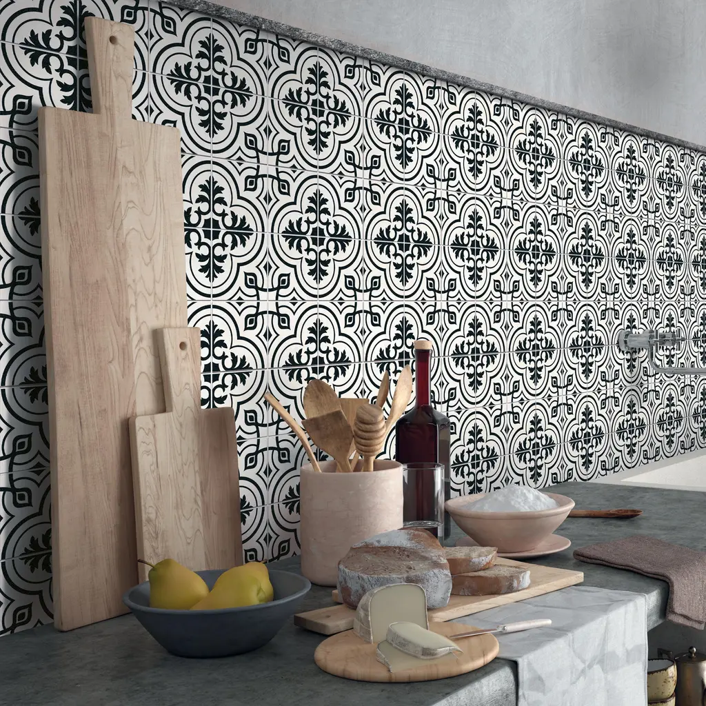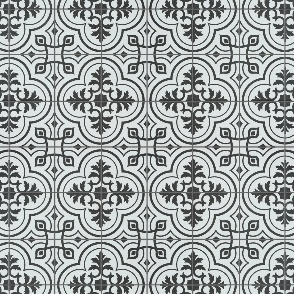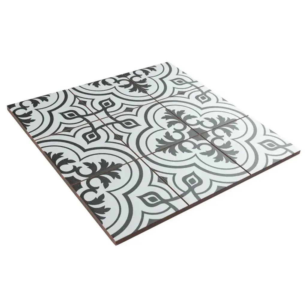 Our Harmonia Vintage White Ceramic Floor and Wall Tile creates the look of a stunning leading-edge mosaic-like design with the harmonious, easy installation of a square tile. Inspired by our best-selling Twenties Vintage, this ceramic encaustic-inspired tile similarly features floral old-world patterns in charcoal black tones that are accented by simplistic arcs. Set on a snow white base glaze, the contrasting design features a weathered, speckled look, replicating the beauty of artisan cement tiles. This visually rich product can blend into virtually any design theme, ranging from modern projects to traditional installations. Save time and labor spent arranging mosaic sheets and instead install these durable ceramic slabs, which have squares separated by scored grout lines. The scored grout lines can be grouted with the color of your choice to further customize your installation. Its glazed and durable features make it an ideal choice for both commercial and residential indoor installations including kitchens, bathrooms, backsplashes, showers, and entryways. Tile is the better choice for your space. This tile is made from natural ingredients, making it a healthy choice as it is free from allergens, VOCs, formaldehyde and PVC. 12.0 square feet, 10 pieces per case. Case weight is 51.1 lbs. Grade 1, first-quality ceramic tile for floor and wall use 13 in. width x 13 in. length x 0.37 in. thick Glazed, slightly textured finish with a low sheen and uniform appearance in tone PEI Rating IV has high resistance to abrasion and is suitable for heavy-duty residential and commercial kitchens, hotels, exhibition and sales rooms with some dirt conditions Semi-Vitreous tiles have water absorption of more than 3% but less than 7% for indoor use This tile is ADA approved for slip resistance with a DCOF value of 0.42 or higher. Not frost resistant Please note: A sample of this product may be a partial piece cut from the full size tile in order to provide an affordable and convenient way for customers to judge the quality and finish of this item. Samples are not returnable.