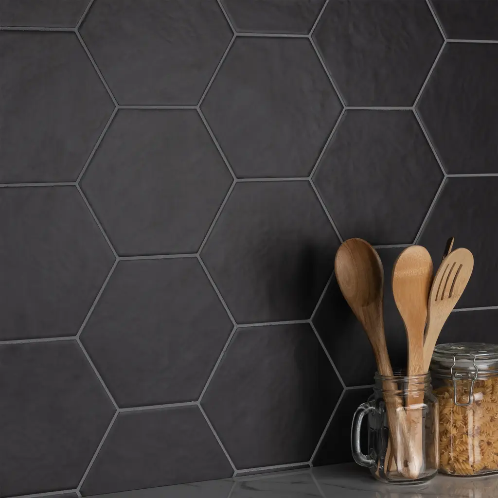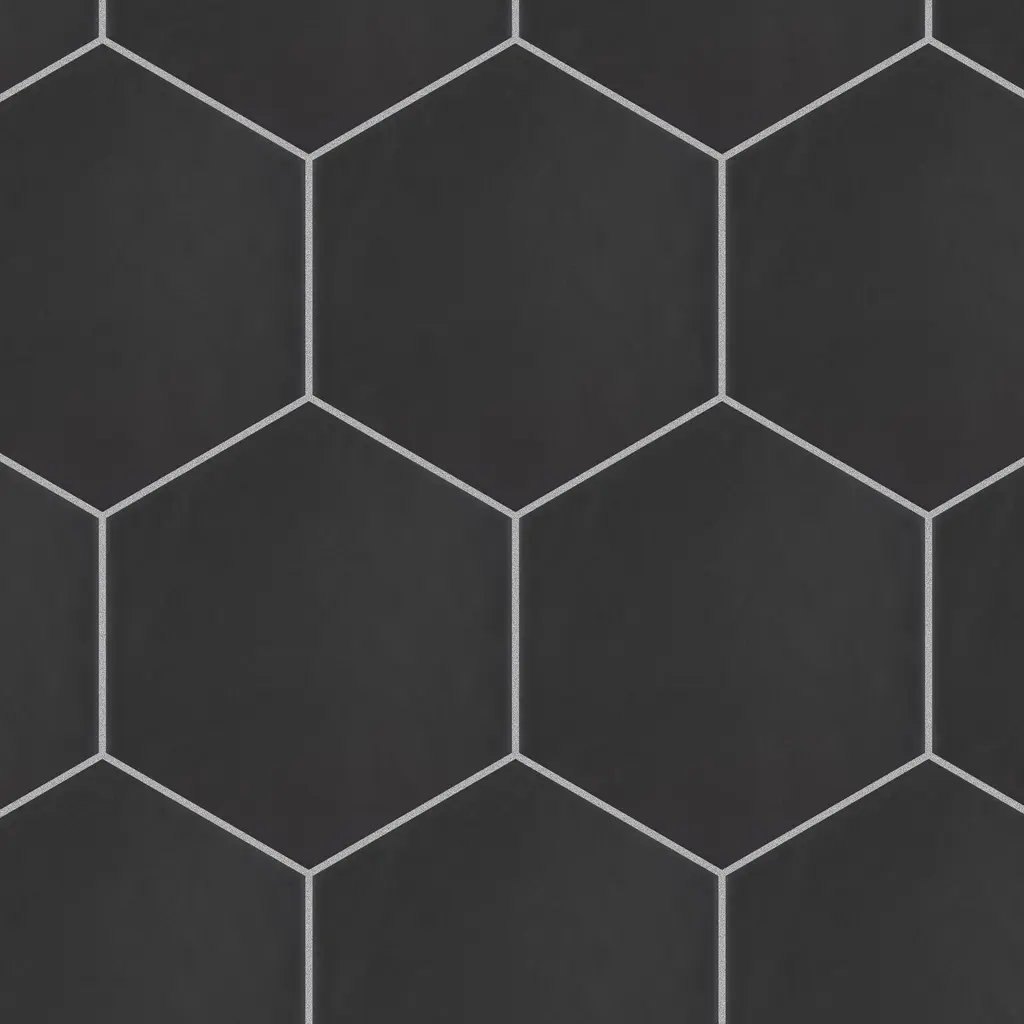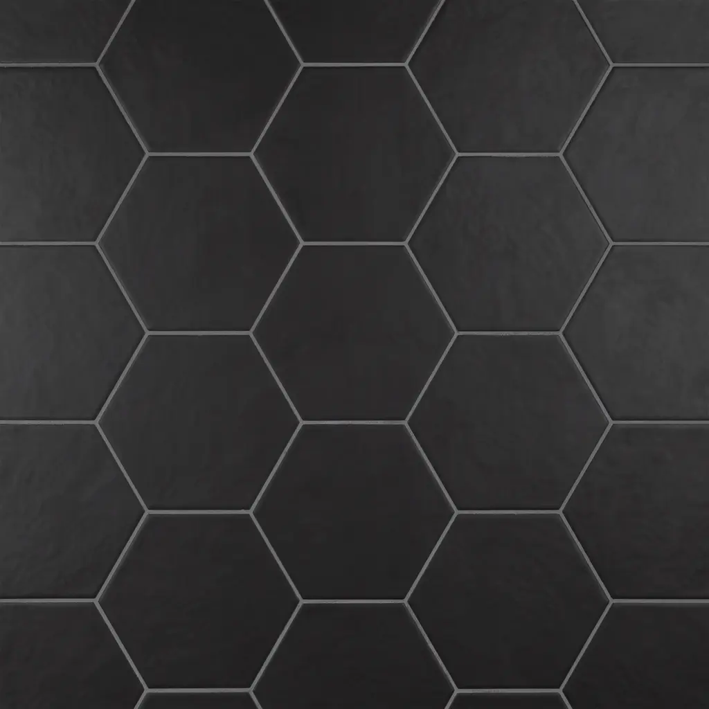 Offering a simplistic look, our Hexatile Matte Nero Porcelain Floor and Wall Tile features a slightly textured, matte finish, providing decorative appeal that adapts to a variety of stylistic contexts. With its impervious, frost-resistant features, this black hexagon tile is an ideal selection for both indoor and outdoor residential installations, including kitchens, bathrooms, backsplashes, showers, hallways and fireplace facades. This tile is a perfect choice on its own or paired with other products in the Hexatile Collection. Tile is the better choice for your space! 7.5 square feet, 25 pieces per case. Case weight is 28.99 lbs. Grade 1, first-quality porcelain tile for floor and wall use 7 in. width x 8 in. length x 0.37 in. thick Glazed, slightly textured finish with a low sheen and uniform appearance in tone PEI Rating III is suitable for medium-duty residential floors including kitchens, halls, corridors, balconies, terraces and areas used more often with normal footwear and small amounts of dirt Impervious tiles have a water absorption of less than 0.5% for indoor and outdoor use and are frost resistant This tile is ADA approved for slip resistance with a DCOF value of 0.42 or higher. Completely frost resistant for indoor or outdoor applications; use a latex-modified thinset for acceptable bond strength Please note: A sample of this product may be a partial piece cut from the full size tile in order to provide an affordable and convenient way for customers to judge the quality and finish of this item. Samples are not returnable.