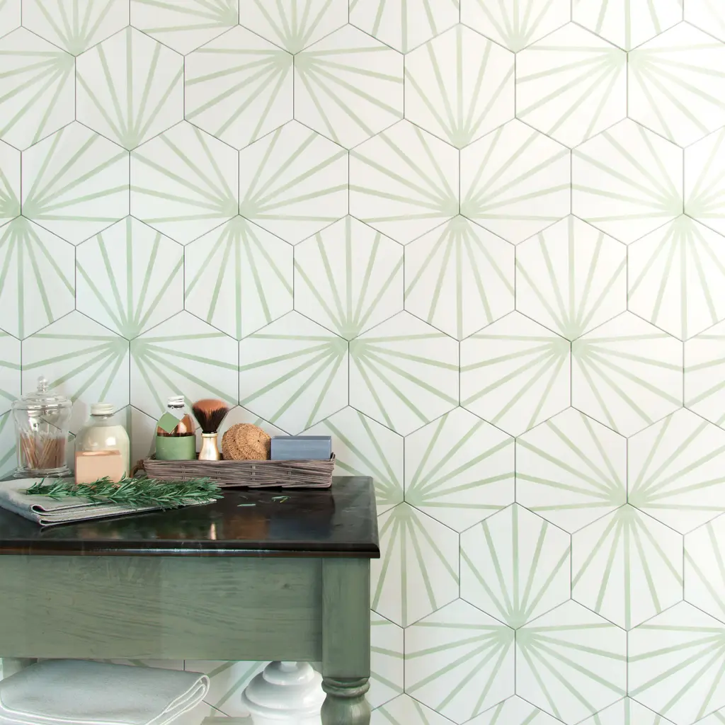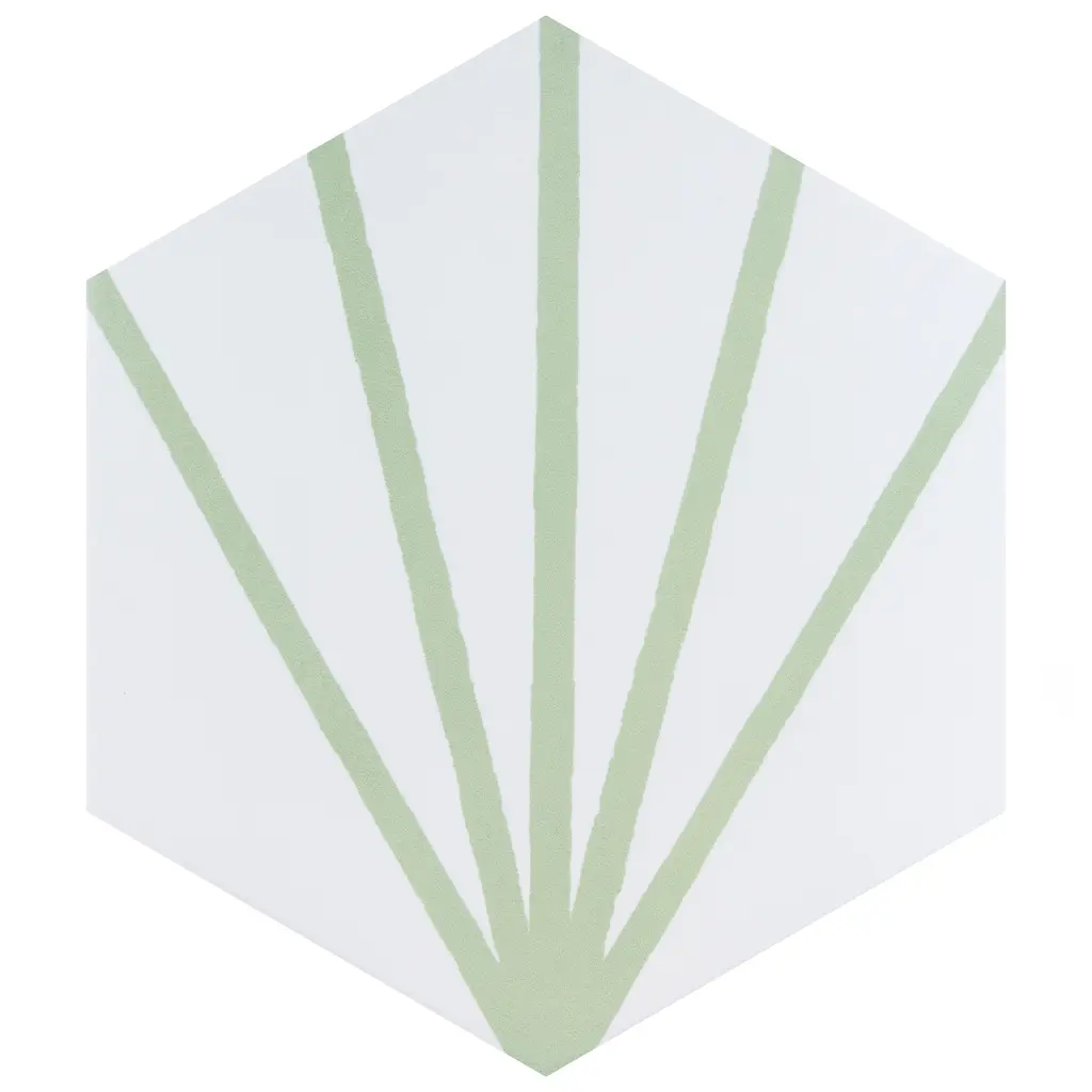 Offering a simplistic look, our Horizon Dawn Hex Verde Porcelain Floor and Wall Tile features a smooth, matte finish, providing decorative appeal that adapts to a variety of stylistic contexts. Containing 6 different print variations that are randomly distributed throughout each case, this white hexagon tile offers a one-of-a-kind look. With its impervious, frost-resistant features, this tile is an ideal selection for both indoor and outdoor residential installations, including kitchens, bathrooms, backsplashes, showers, hallways and fireplace facades. This tile is a perfect choice on its own or paired with other products in the Horizon Collection. Tile is the better choice for your space! 8.88 square feet, 24 pieces per case. Case weight is 39.68 lbs. Grade 1, first-quality porcelain tile for floor and wall use 7.75 in. width x 9 in. length x 0.38 in. thick Glazed, smooth finish with a low sheen and moderate variation in tone PEI Rating III is suitable for medium-duty residential floors including kitchens, halls, corridors, balconies, terraces and areas used more often with normal footwear and small amounts of dirt Impervious tiles have a water absorption of less than 0.5% for indoor and outdoor use and are frost resistant This tile is ADA approved for slip resistance with a DCOF value of 0.42 or higher. Completely frost resistant for indoor or outdoor applications; use a latex-modified thinset for acceptable bond strength Please note: A sample of this product may be a partial piece cut from the full size tile in order to provide an affordable and convenient way for customers to judge the quality and finish of this item. Samples are not returnable.