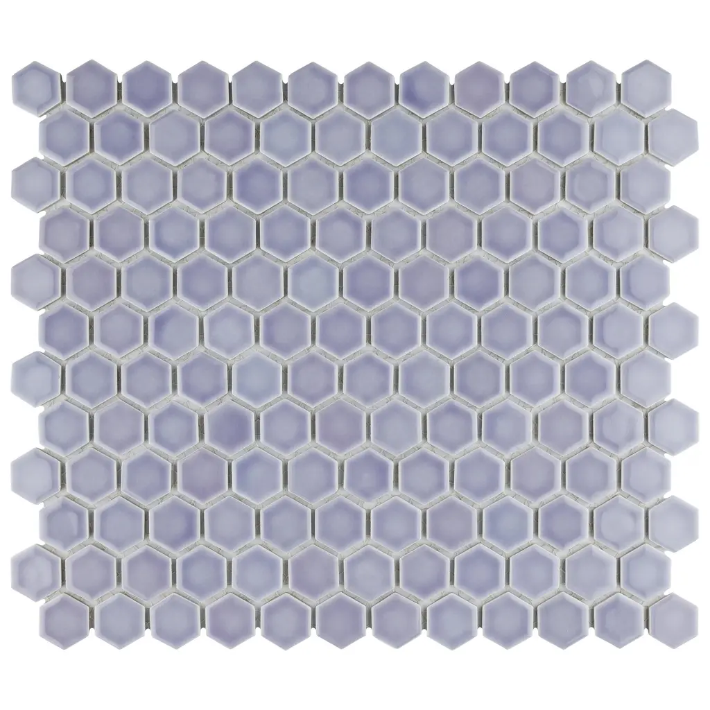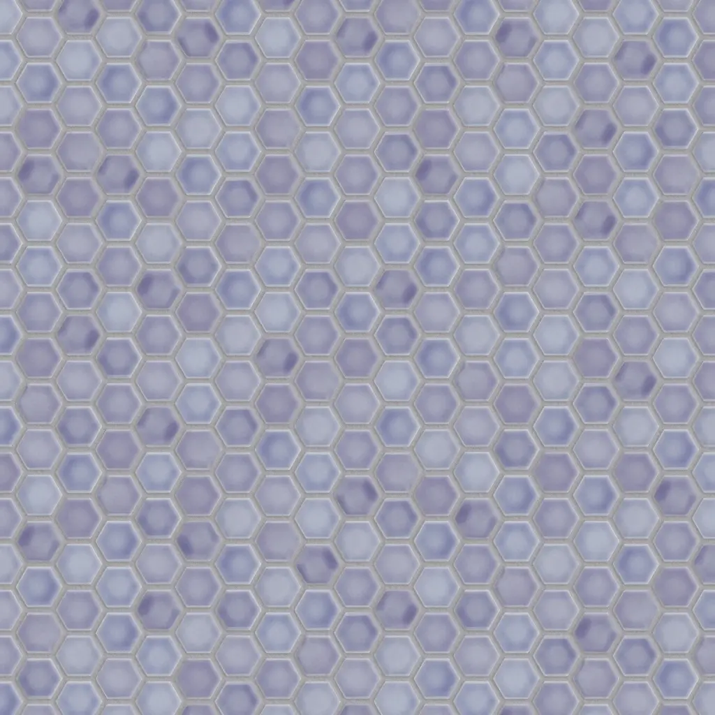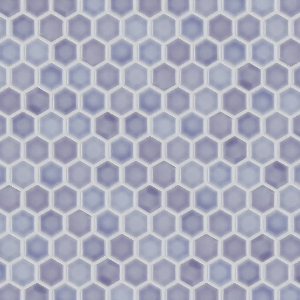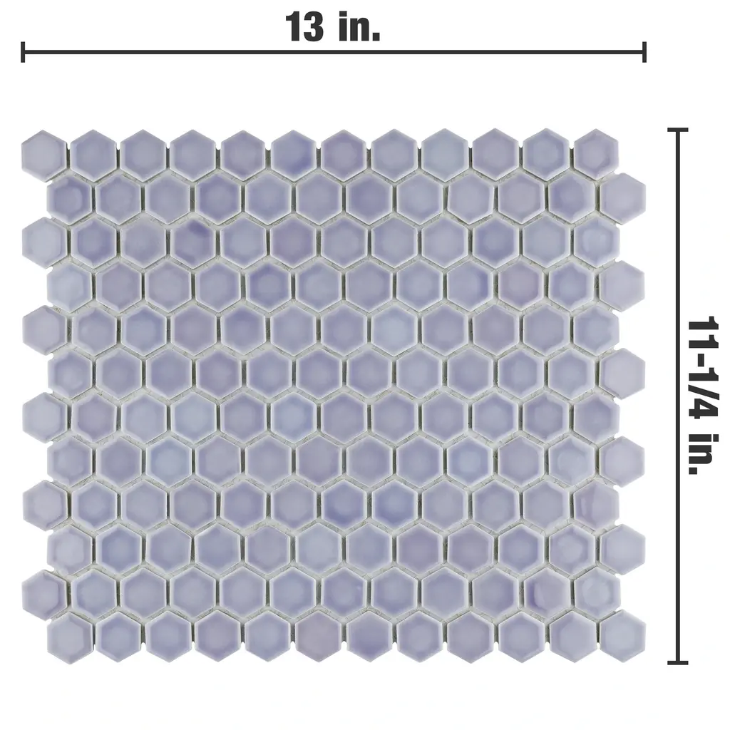 Our Hudson 1 in. Hex Lavender Porcelain Floor and Wall Mosaic Tile instantly elevates spaces through a refreshing dose of geometric design. Featuring a reactive glaze with an eye-drop effect, these tiles have soft lavender color tones that blend to white around the edges. This mosaic creates a uniquely sporadic design through a pleasing mixture of cool-toned tints with additional dimension added by the smooth, high-gloss finish. This porcelain mosaic floor and wall tile is unique yet simplistic enough to integrate into any design, ranging from traditional style renovations to modern home projects. Its impervious, frost resistant, and durable features make it an ideal choice for both commercial and residential indoor and outdoor installations including, kitchens, bathrooms, backsplashes, showers, hallways, entryways, patios, and fireplace facades. This tile is a perfect choice on its own or coordinated with other products in the Hudson Hex series. Tile is the better choice for your space. This tile is made from natural ingredients, making it a healthy choice as it is free from allergens, VOCs, formaldehyde, and PVC. 11.2 square feet, 10 pieces per case. Case weight is 19 lbs. Grade 1, first-quality porcelain tile for floor and wall use 11.88 in. width x 13.25 in. length x 0.19 in. thick mesh-mounted mosaic Glazed, smooth finish with a high sheen and slight variation in tone PEI Rating IV has high resistance to abrasion and is suitable for heavy-duty residential and commercial kitchens, hotels, exhibition and sales rooms with some dirt conditions Impervious tiles have a water absorption of less than 0.5% for indoor and outdoor use and are frost resistant This tile is not ADA approved for slip resistance with a DCOF value less than 0.42. Completely frost resistant for indoor or outdoor applications; use a latex-modified thinset for acceptable bond strength Please note: A sample of this product may be a partial piece cut from the full size tile in order to provide an affordable and convenient way for customers to judge the quality and finish of this item. Samples are not returnable.