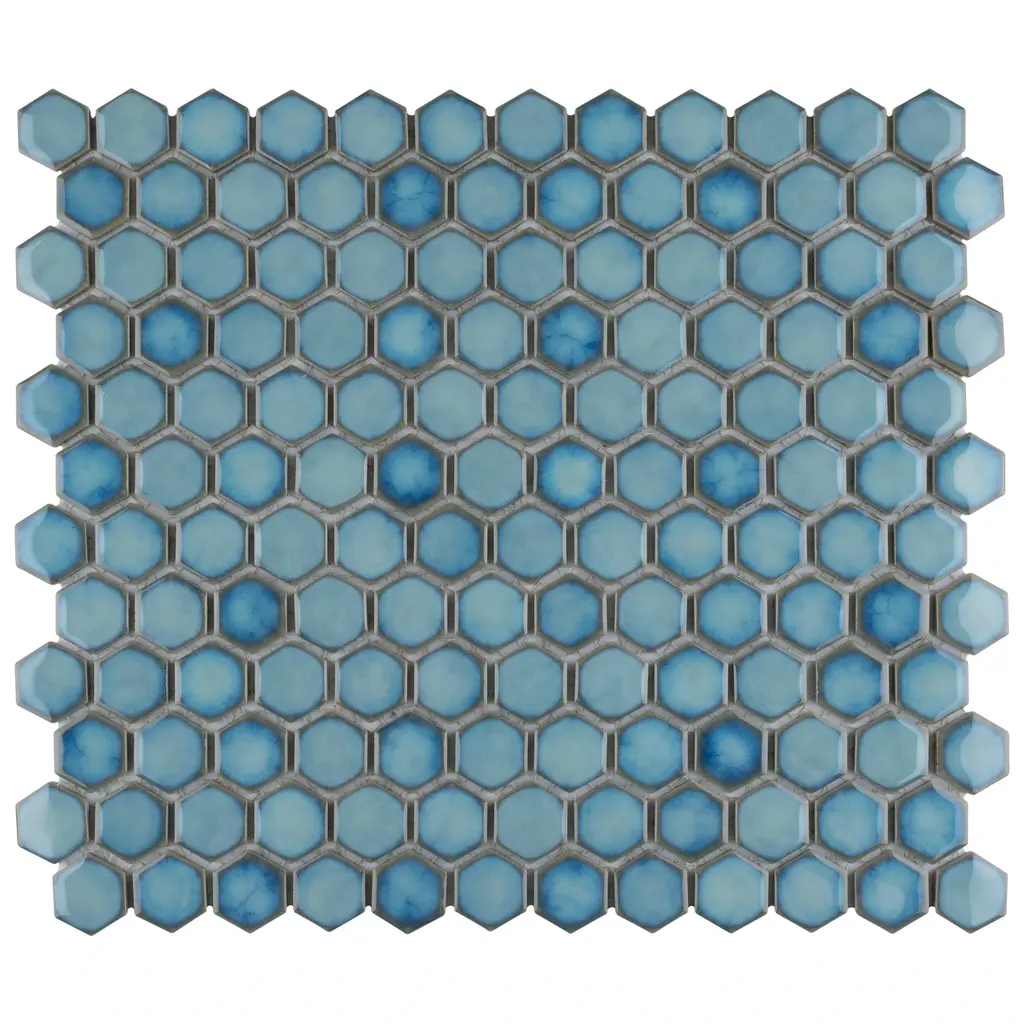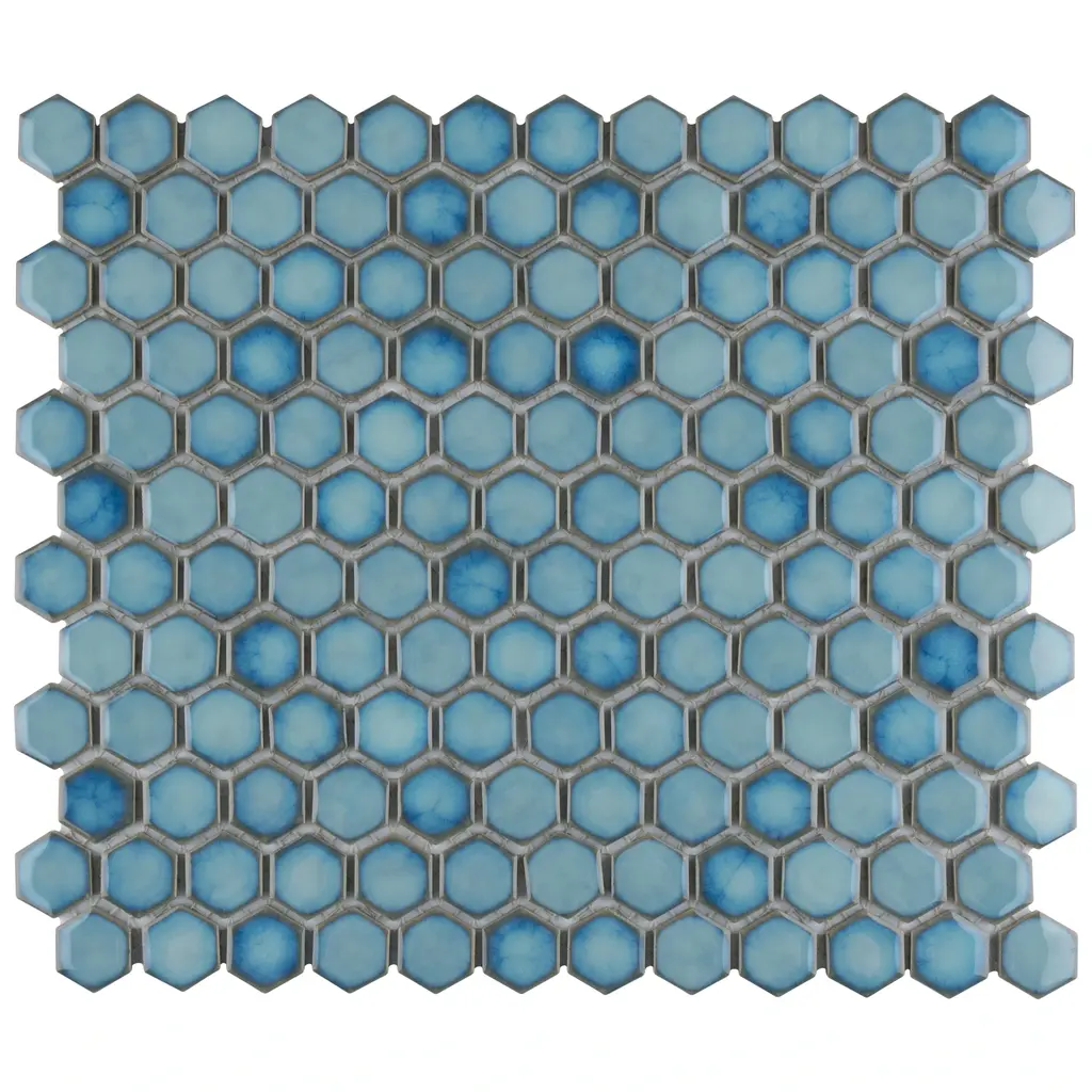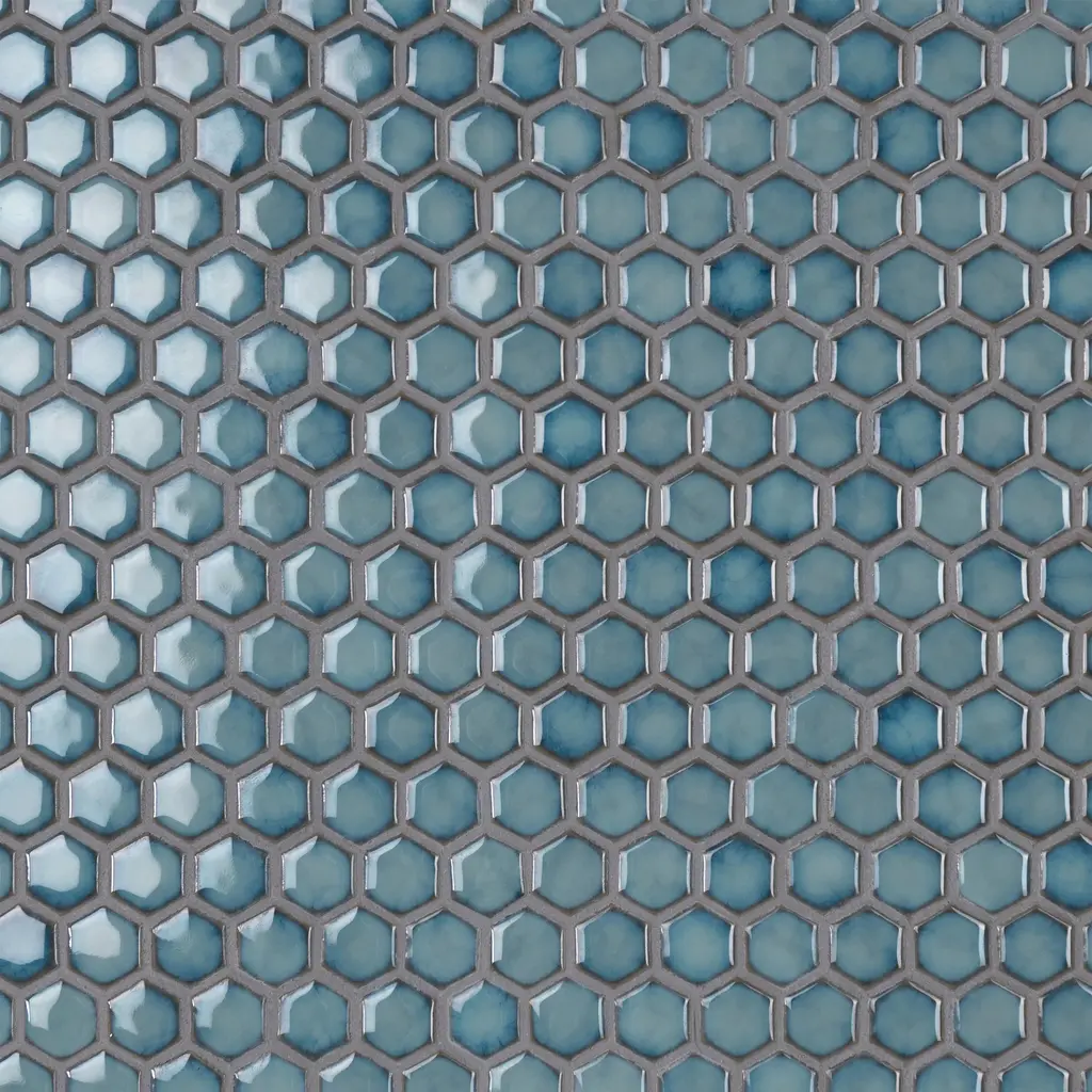 Our Hudson 1 in. Hex Marine Porcelain Mosaic Floor and Wall Tile instantly elevates spaces through a refreshing dose of geometric design. Featuring a reactive glaze with an eye-drop effect, these tiles have varying shades of light blue that blend to taupe around the edges. This mosaic is a pleasing mixture of cool-toned tints with additional dimension added by the smooth, high-gloss finish. This porcelain mosaic floor and wall tile is unique yet simplistic enough to integrate into any design, ranging from traditional style renovations to modern home projects. Its impervious and frost-resistant features make this an ideal choice for both commercial and residential indoor and outdoor floor and wall installations including, kitchen backsplashes, bathroom showers and accent walls. This hexagon mosaic can be used as a whole sheet or cut into smaller strips as an accent piece. It is a perfect choice on its own or coordinated with other colors in our Hudson Hex series. Tile is the better choice for your space. This tile is made from natural ingredients, making it a healthy choice as it is free from allergens, VOCs, formaldehyde and PVC. 11.2 square feet, 10 pieces per case. Case weight is 19 lbs. Grade 1, first-quality porcelain tile for floor and wall use 11.88 in. width x 13.25 in. length x 0.19 in. thick mesh-mounted mosaic Glazed, smooth finish with a high sheen and slight variation in tone PEI Rating IV has high resistance to abrasion and is suitable for heavy-duty residential and commercial kitchens, hotels, exhibition and sales rooms with some dirt conditions Impervious tiles have a water absorption of less than 0.5% for indoor and outdoor use and are frost resistant This tile is not ADA approved for slip resistance with a DCOF value less than 0.42. Completely frost resistant for indoor or outdoor applications; use a latex-modified thinset for acceptable bond strength Please note: A sample of this product may be a partial piece cut from the full size tile in order to provide an affordable and convenient way for customers to judge the quality and finish of this item. Samples are not returnable.