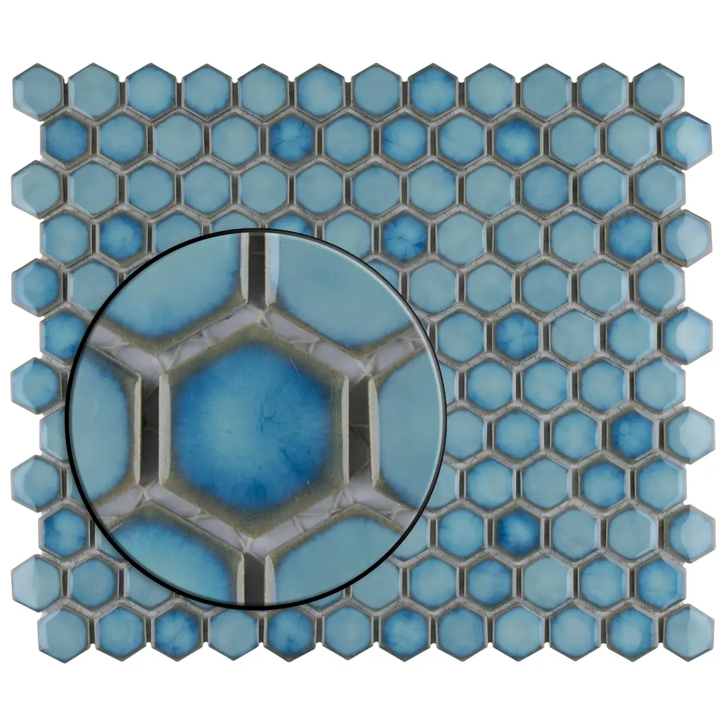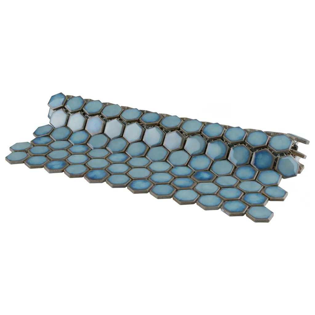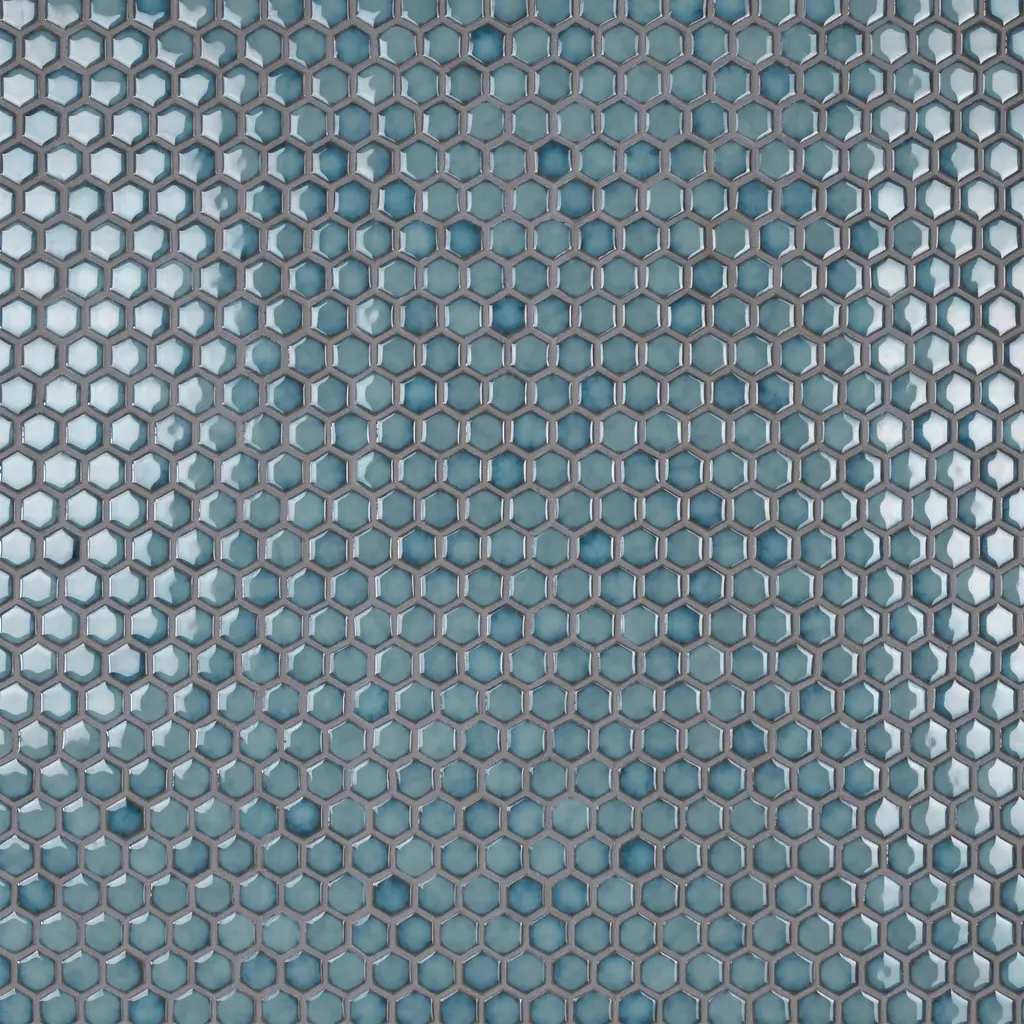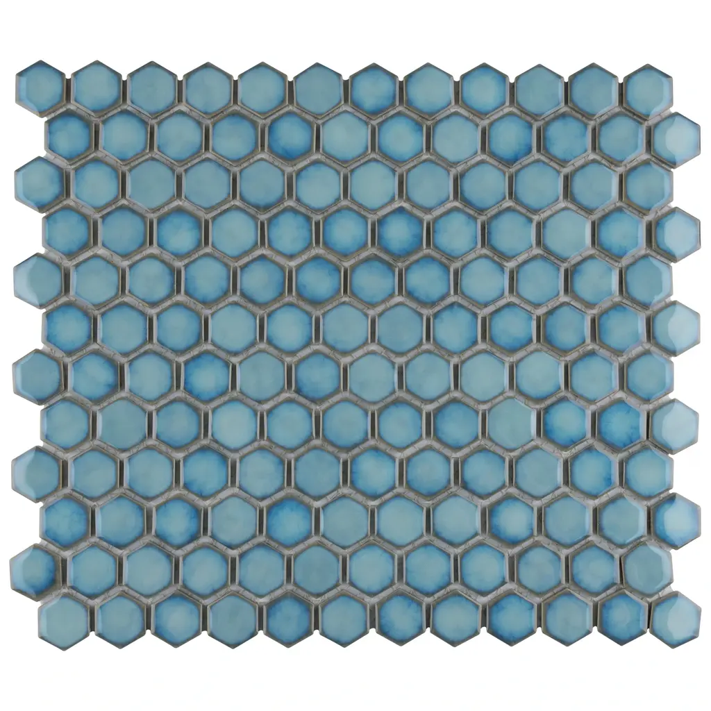Our Hudson 1 in. Hex Marine Porcelain Mosaic Floor and Wall Tile instantly elevates spaces through a refreshing dose of geometric design. Featuring a reactive glaze with an eye-drop effect, these tiles have varying shades of light blue that blend to taupe around the edges. This mosaic is a pleasing mixture of cool-toned tints with additional dimension added by the smooth, high-gloss finish. This porcelain mosaic floor and wall tile is unique yet simplistic enough to integrate into any design, ranging from traditional style renovations to modern home projects. Its impervious and frost-resistant features make this an ideal choice for both commercial and residential indoor and outdoor floor and wall installations including, kitchen backsplashes, bathroom showers and accent walls. This hexagon mosaic can be used as a whole sheet or cut into smaller strips as an accent piece. It is a perfect choice on its own or coordinated with other colors in our Hudson Hex series. Tile is the better choice for your space. This tile is made from natural ingredients, making it a healthy choice as it is free from allergens, VOCs, formaldehyde and PVC. 11.2 square feet, 10 pieces per case. Case weight is 19 lbs. Grade 1, first-quality porcelain tile for floor and wall use 11.88 in. width x 13.25 in. length x 0.19 in. thick mesh-mounted mosaic Glazed, smooth finish with a high sheen and slight variation in tone PEI Rating IV has high resistance to abrasion and is suitable for heavy-duty residential and commercial kitchens, hotels, exhibition and sales rooms with some dirt conditions Impervious tiles have a water absorption of less than 0.5% for indoor and outdoor use and are frost resistant This tile is not ADA approved for slip resistance with a DCOF value less than 0.42. Completely frost resistant for indoor or outdoor applications; use a latex-modified thinset for acceptable bond strength Please note: A sample of this product may be a partial piece cut from the full size tile in order to provide an affordable and convenient way for customers to judge the quality and finish of this item. Samples are not returnable.