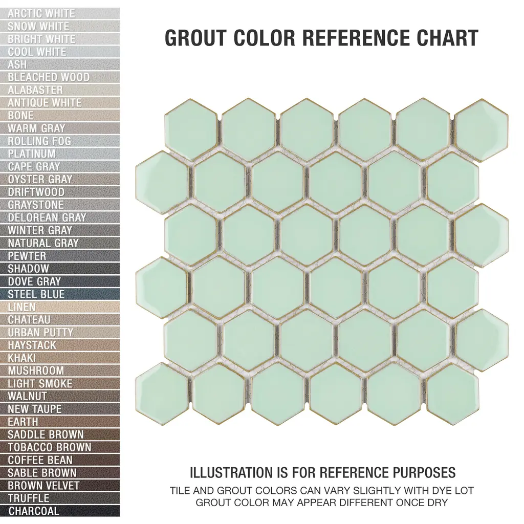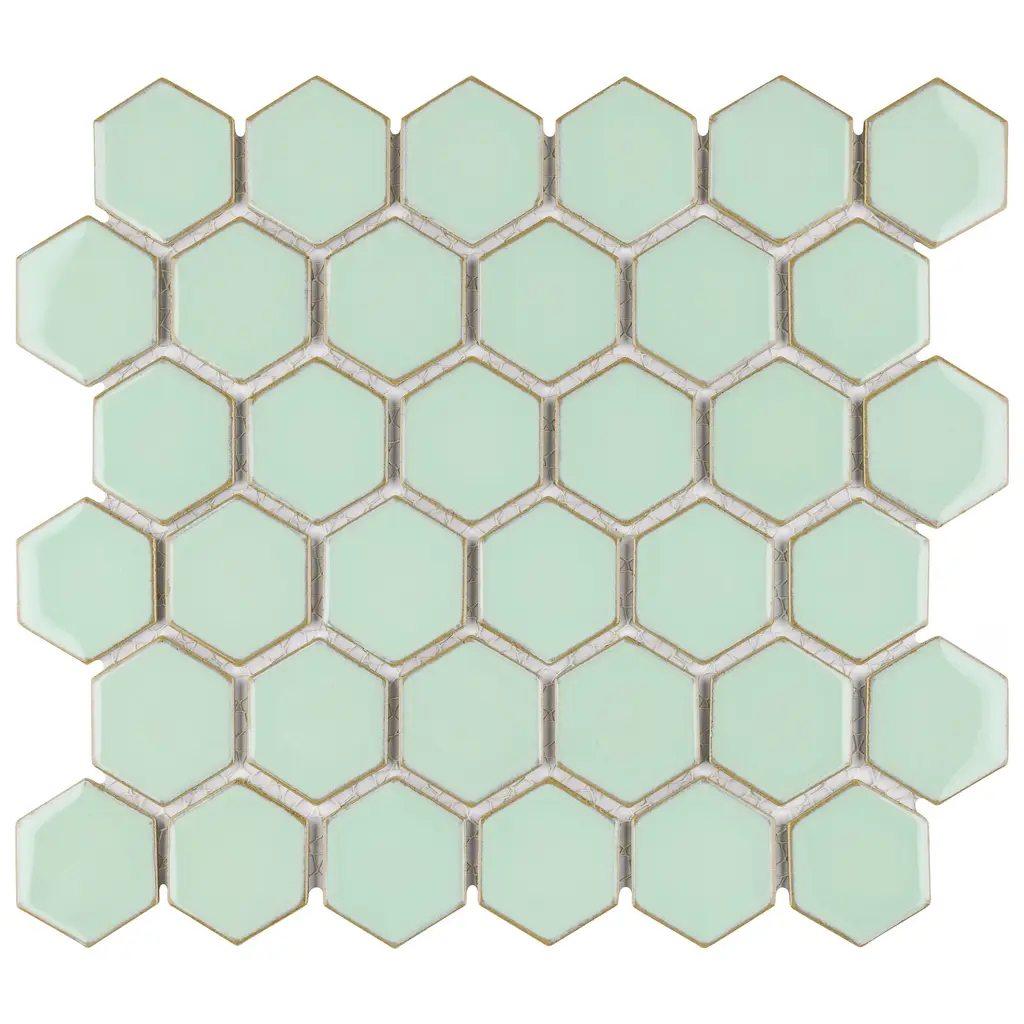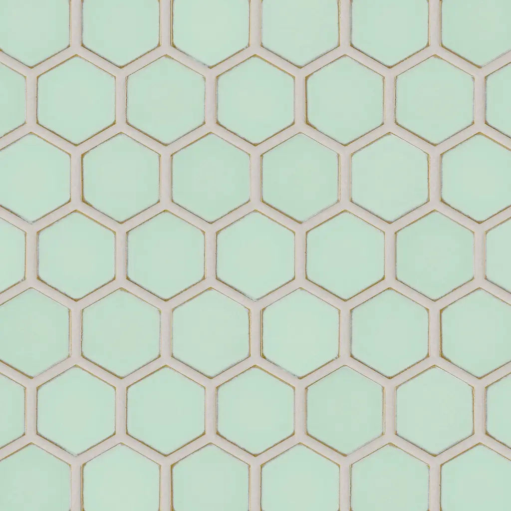 As a modern, enlarged deviation from the classic hexagon mosaic, our Hudson Due 2 in. Hex Light Green Porcelain Floor and Wall Mosaic Tile instantly elevates spaces through a refreshing dose of geometric design. This porcelain tile features a soft light green color tone that blends to taupe around the edges with a smooth glazed finish. It offers a versatile appearance that is unique yet simplistic enough to integrate into any design, ranging from traditional style renovations to modern home projects. Its impervious, frost resistant, and durable features make it an ideal choice for both commercial and residential indoor and outdoor installations including, kitchens, bathrooms, backsplashes, showers, hallways, entryways, patios, and fireplace facades. This tile is a perfect choice on its own or coordinated with other products in the Hudson Due Hex series. Tile is the better choice for your space. This tile is made from natural ingredients, making it a healthy choice as it is free from allergens, VOCs, formaldehyde, and PVC. 9.7 square feet, 10 pieces per case. Case weight is 20.78 lbs. Grade 1, first-quality porcelain tile for floor and wall use 10.88 in. width x 12.63 in. length x 0.19 in. thick mesh-mounted mosaic Glazed, smooth finish with a high sheen and slight variation in tone PEI Rating IV has high resistance to abrasion and is suitable for heavy-duty residential and commercial kitchens, hotels, exhibition and sales rooms with some dirt conditions Impervious tiles have a water absorption of less than 0.5% for indoor and outdoor use and are frost resistant This tile is not ADA approved for slip resistance with a DCOF value less than 0.42. Completely frost resistant for indoor or outdoor applications; use a latex-modified thinset for acceptable bond strength Please note: A sample of this product may be a partial piece cut from the full size tile in order to provide an affordable and convenient way for customers to judge the quality and finish of this item. Samples are not returnable.