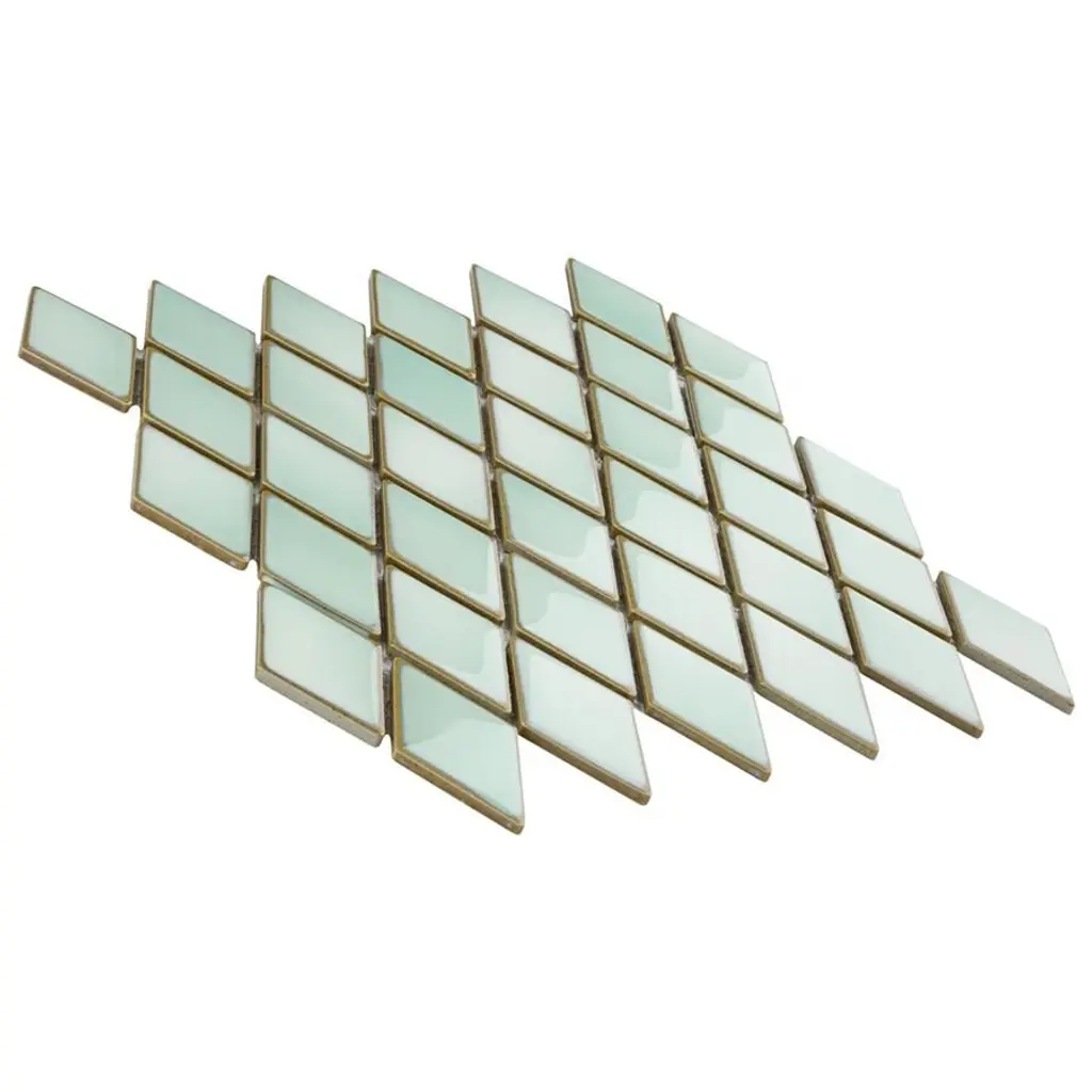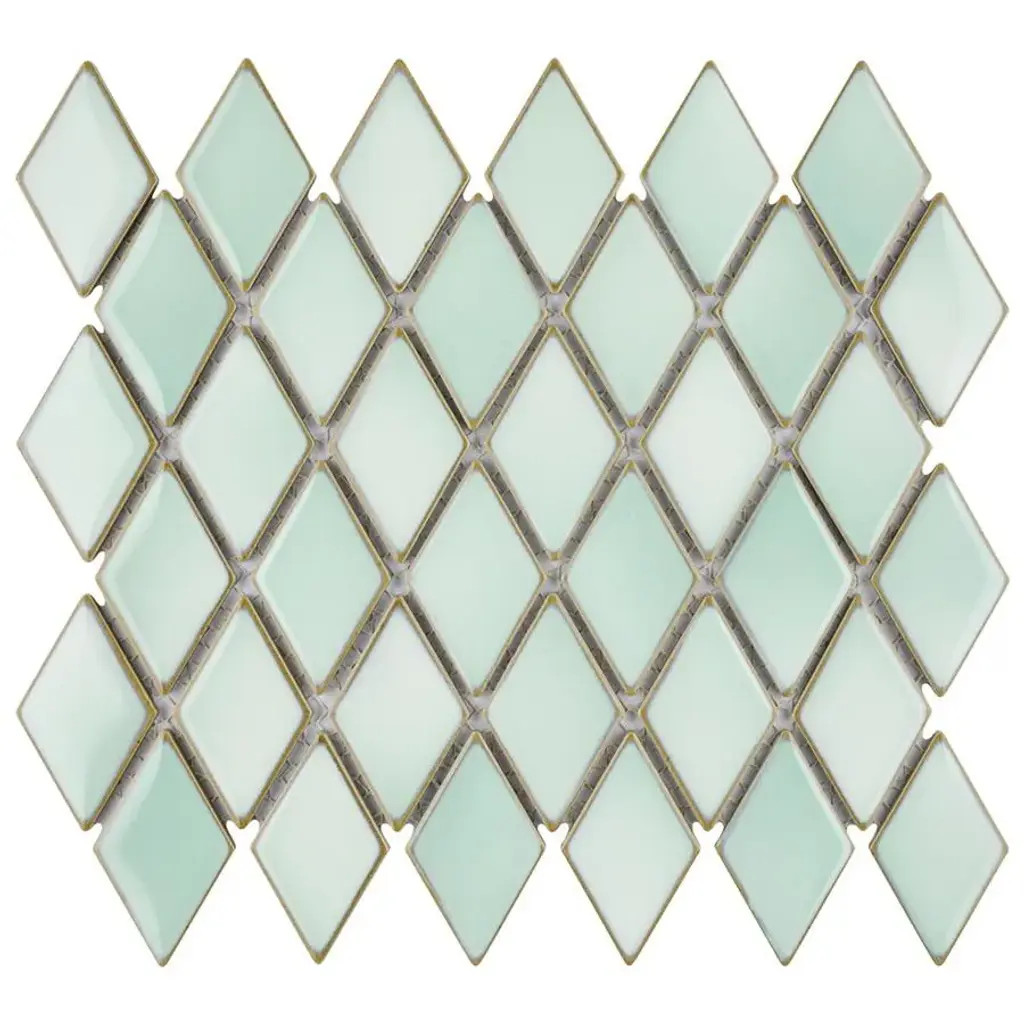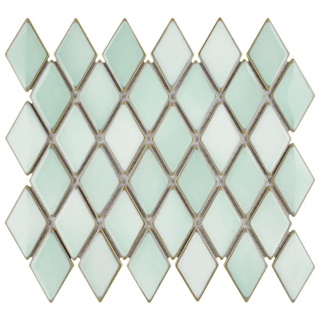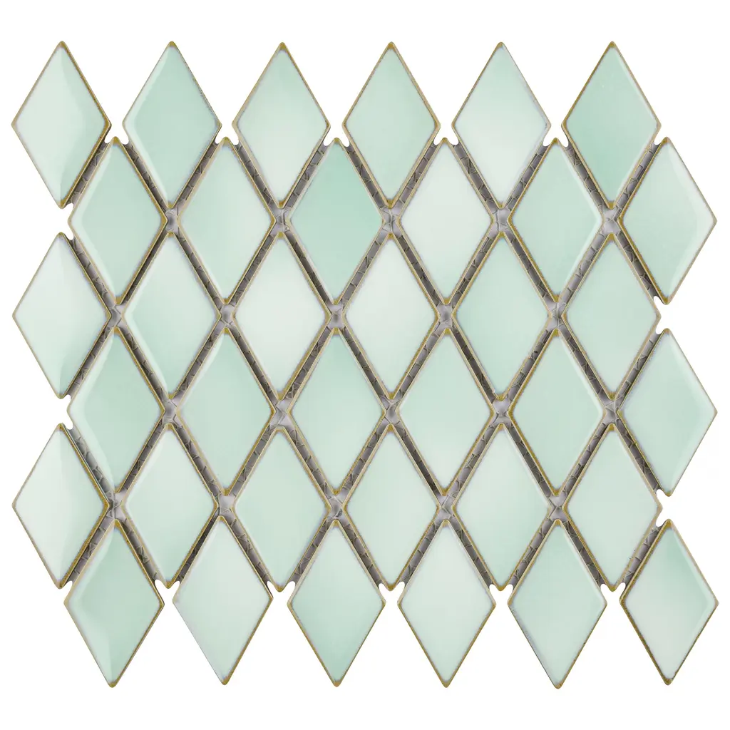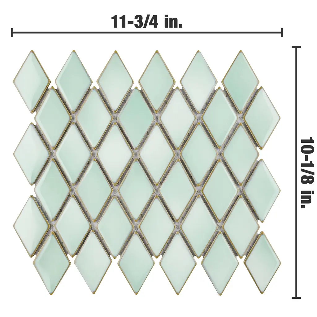 Offering a mosaic look, our Hudson Kite Pistachio Porcelain Floor and Wall Tile features a smooth, glossy finish, providing decorative appeal that adapts to a variety of stylistic contexts. With its impervious, frost-resistant features, this green rhombus mosaic is an ideal selection for both indoor and outdoor commercial and residential installations, including kitchens, bathrooms, backsplashes, showers, hallways, entryways, patios and fireplace facades. This tile is a perfect choice on its own or paired with other products in the Hudson Collection. Tile is the better choice for your space! 8.56 square feet, 10 pieces per case. Case weight is 22.79 lbs. Grade 1, first-quality porcelain tile for floor and wall use 10.13 in. width x 11.75 in. length x 0.23 in. thick mesh-mounted mosaic Glazed, smooth finish with a high sheen and slight variation in tone PEI Rating IV has high resistance to abrasion and is suitable for heavy-duty residential and commercial kitchens, hotels, exhibition and sales rooms with some dirt conditions Impervious tiles have a water absorption of less than 0.5% for indoor and outdoor use and are frost resistant This tile is not ADA approved for slip resistance with a DCOF value less than 0.42. Completely frost resistant for indoor or outdoor applications; use a latex-modified thinset for acceptable bond strength Please note: A sample of this product may be a partial piece cut from the full size tile in order to provide an affordable and convenient way for customers to judge the quality and finish of this item. Samples are not returnable.