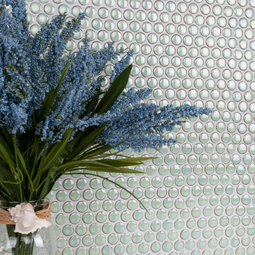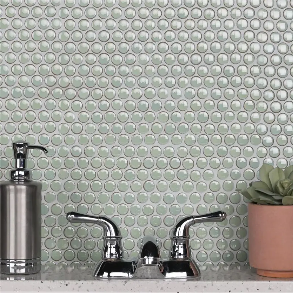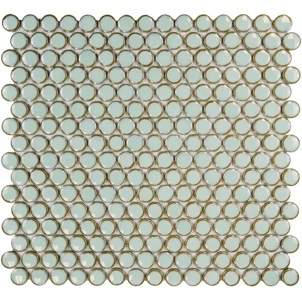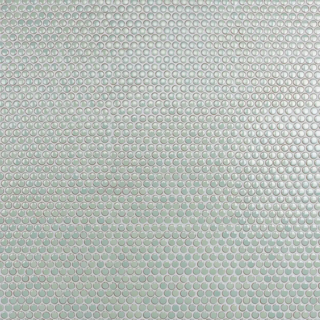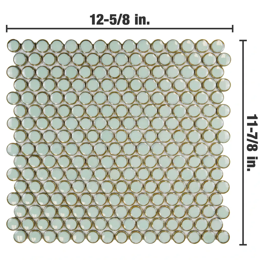 Our Hudson Penny Round Glossy Light Grey Porcelain Mosaic Tile lends a refreshing aesthetic to the classic penny round shape. With subtle variations in color tone that gradually fade to taupe around the border, each piece is truly unique. Its rich reactive glaze echoes a soothing pale green color tone with a high glossy finish that is unique yet simplistic enough to integrate into any design, ranging from traditional style renovations to modern home projects. Its impervious and frost-resistant features make this penny tile an ideal choice for indoor and outdoor floor and wall installations including, kitchen backsplashes, bathroom showers and accent walls. This penny round tile can be used as a whole sheet or cut into smaller strips as an accent piece. It is a perfect choice on its own or coordinated with other colors in our Hudson Penny Round series. 10.5 square feet, 10 pieces per case. Case weight is 18.02 lbs. Grade 1, first-quality porcelain tile for floor and wall use 11.88 in. width x 12.63 in. length x 0.21 in. thick mesh-mounted mosaic Glazed, smooth finish with a high sheen and uniform appearance in tone PEI Rating IV has high resistance to abrasion and is suitable for heavy-duty residential and commercial kitchens, hotels, exhibition and sales rooms with some dirt conditions Impervious tiles have a water absorption of less than 0.5% for indoor and outdoor use and are frost resistant This tile is not ADA approved for slip resistance with a DCOF value less than 0.42. Completely frost resistant for indoor or outdoor applications; use a latex-modified thinset for acceptable bond strength Please note: A sample of this product may be a partial piece cut from the full size tile in order to provide an affordable and convenient way for customers to judge the quality and finish of this item. Samples are not returnable.