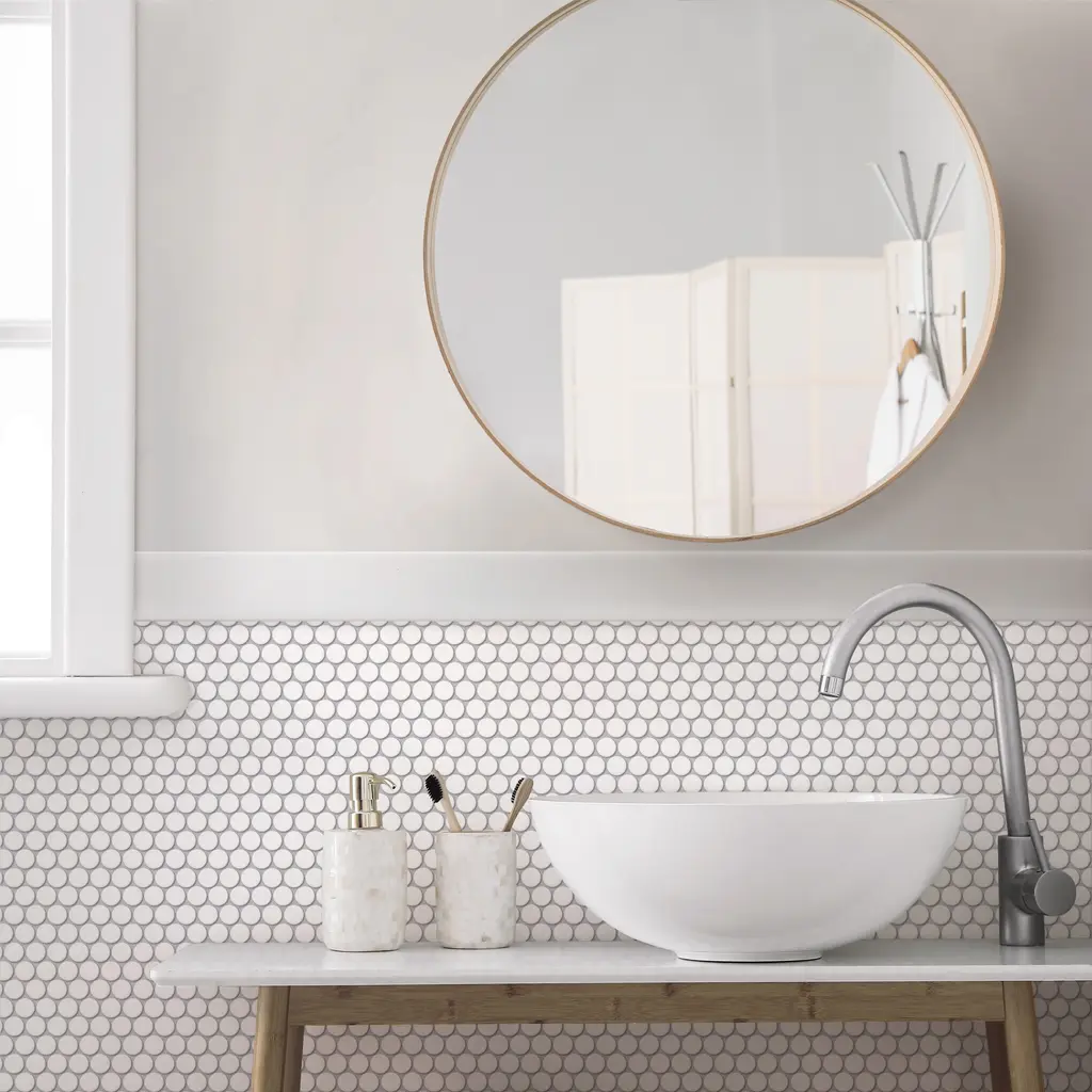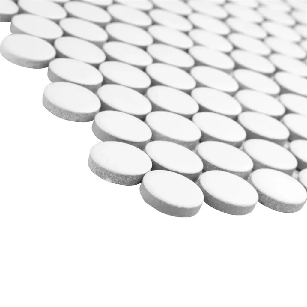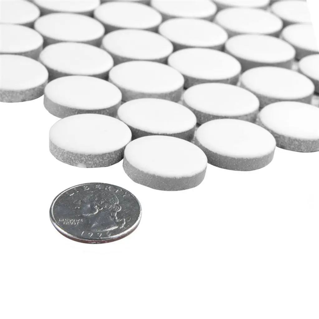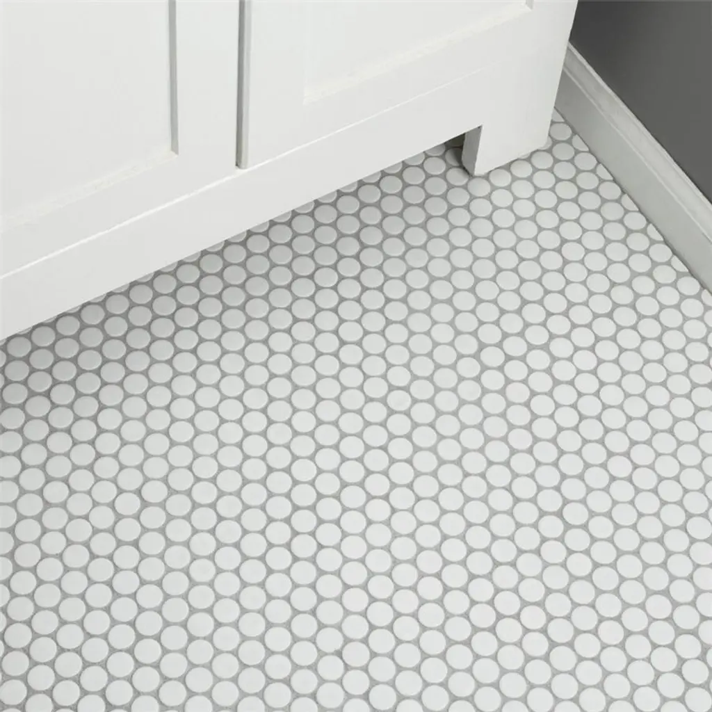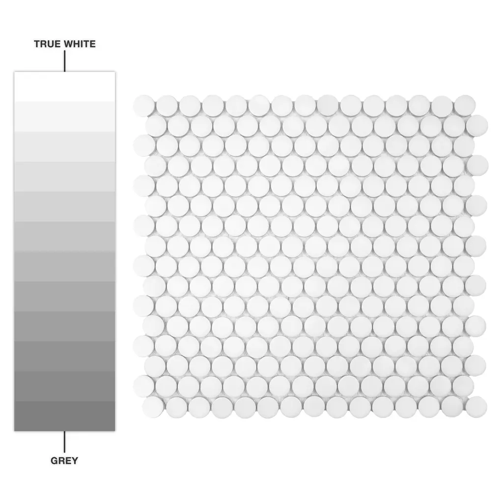 Our Hudson Penny Round Matte White Porcelain Mosaic Tile is a reinvented version of Victorian-era beauty. As a modern deviation from the classic mosaic, this fresh option is a throwback to traditional retro design with a contemporary feel. Smooth matte white penny rounds are precisely arranged on an interlocking mesh to create a seamless installation. This minimalistic geometric porcelain mosaic is unique yet simplistic enough to integrate into any design, ranging from traditional style renovations to modern home projects. Its impervious, ADA-compliant and frost-resistant features make this penny tile an ideal choice for indoor and outdoor floor and wall installations including, kitchen backsplashes, bathroom showers and accent walls. This penny round tile can be used as a whole sheet or cut into smaller strips as an accent piece. It is a perfect choice on its own or coordinated with other colors in our Hudson Penny Round series. 10.5 square feet, 10 pieces per case. Case weight is 18.02 lbs. Grade 1, first-quality porcelain tile for floor and wall use 11.88 in. width x 12.63 in. length x 0.21 in. thick mesh-mounted mosaic Glazed, smooth finish with a low sheen and uniform appearance in tone PEI Rating IV has high resistance to abrasion and is suitable for heavy-duty residential and commercial kitchens, hotels, exhibition and sales rooms with some dirt conditions Impervious tiles have a water absorption of less than 0.5% for indoor and outdoor use and are frost resistant This tile is ADA approved for slip resistance with a DCOF value of 0.42 or higher. Completely frost resistant for indoor or outdoor applications; use a latex-modified thinset for acceptable bond strength Please note: A sample of this product may be a partial piece cut from the full size tile in order to provide an affordable and convenient way for customers to judge the quality and finish of this item. Samples are not returnable.