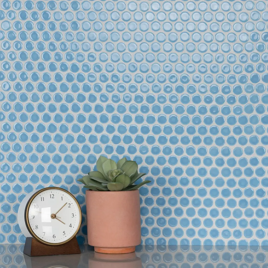 Our Hudson Penny Round Glossy Sapphire Porcelain Mosaic Tile lends a refreshing aesthetic to the classic penny round shape. With subtle variations in color tone that gradually fade to dark grey around the border, each piece is truly unique. Its rich reactive glaze echoes light to dark blue hues with a high glossy finish that is unique yet simplistic enough to integrate into any design, ranging from traditional style renovations to modern home projects. Its impervious and frost-resistant features make this penny tile an ideal choice for indoor and outdoor floor and wall installations including, kitchen backsplashes, bathroom showers and accent walls. This penny round tile can be used as a whole sheet or cut into smaller strips as an accent piece. It is a perfect choice on its own or coordinated with other colors in our Hudson Penny Round series. 10.5 square feet, 10 pieces per case. Case weight is 17.5 lbs. Grade 1, first-quality porcelain tile for floor and wall use 11.88 in. width x 12.63 in. length x 0.21 in. thick mesh-mounted mosaic Glazed, smooth finish with a high sheen and slight variation in tone PEI Rating II is suitable for all interior walls and light foot traffic such as powder rooms Impervious tiles have a water absorption of less than 0.5% for indoor and outdoor use and are frost resistant This tile is not ADA approved for slip resistance with a DCOF value less than 0.42. Completely frost resistant for indoor or outdoor applications; use a latex-modified thinset for acceptable bond strength Please note: A sample of this product may be a partial piece cut from the full size tile in order to provide an affordable and convenient way for customers to judge the quality and finish of this item. Samples are not returnable.