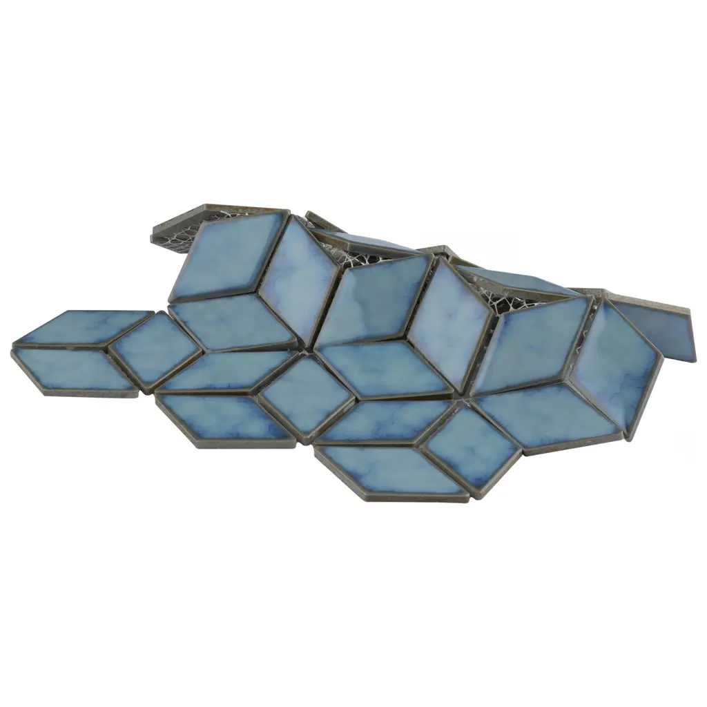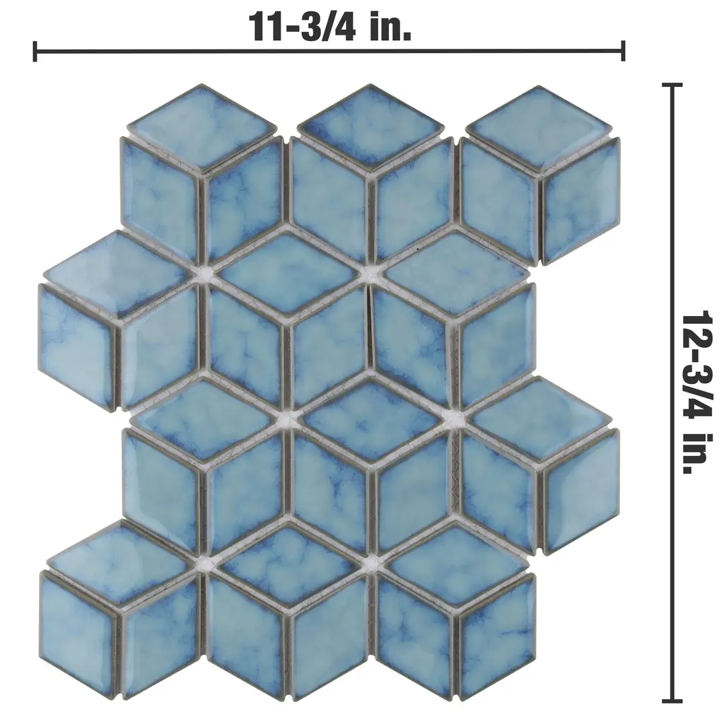Our Hudson Rhombus Marine Porcelain Floor and Wall Mosaic Tile instantly elevates spaces through a refreshing dose of geometric design. Featuring a reactive glaze, these tiles have varying shades of light and dark sky blue that blend to taupe around the edges. This floor and wall mosaic creates a uniquely sporadic design through a pleasing mixture of cool-toned tints with additional dimension added by the smooth, high-gloss finish. Its impervious and frost-resistant features make this porcelain mosaic tile an ideal choice for both commercial and residential indoor and outdoor floor and wall installations including, kitchens, backsplashes, bathrooms, showers, entryways, fireplace facades and patios. Please note, the unique reactive glazing technique creates a stunning one-of-a-kind effect and may cause high variation between dye lots. Tile is the better choice for your space. This tile is made from natural ingredients, making it a healthy choice as it is free from allergens, VOCs, formaldehyde, and PVC. 8.56 square feet, 10 pieces per case. Case weight is 20.94 lbs. Grade 1, first-quality porcelain tile for floor and wall use 10.25 in. width x 11.75 in. length x 0.23 in. thick mesh-mounted mosaic Glazed, smooth finish with a high sheen and uniform appearance in tone PEI Rating IV has high resistance to abrasion and is suitable for heavy-duty residential and commercial kitchens, hotels, exhibition and sales rooms with some dirt conditions Impervious tiles have a water absorption of less than 0.5% for indoor and outdoor use and are frost resistant This tile is not ADA approved for slip resistance with a DCOF value less than 0.42. Completely frost resistant for indoor or outdoor applications; use a latex-modified thinset for acceptable bond strength Please note: A sample of this product may be a partial piece cut from the full size tile in order to provide an affordable and convenient way for customers to judge the quality and finish of this item. Samples are not returnable.