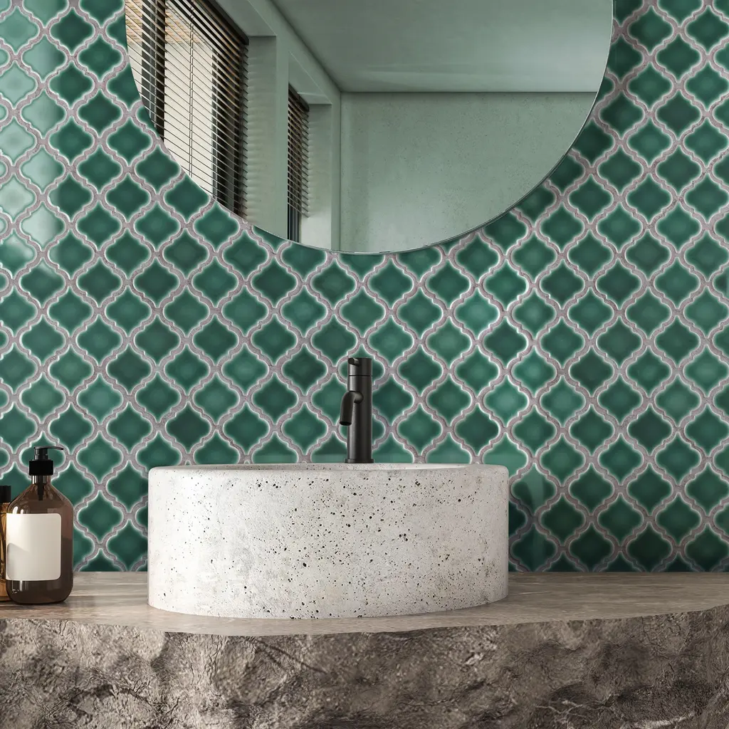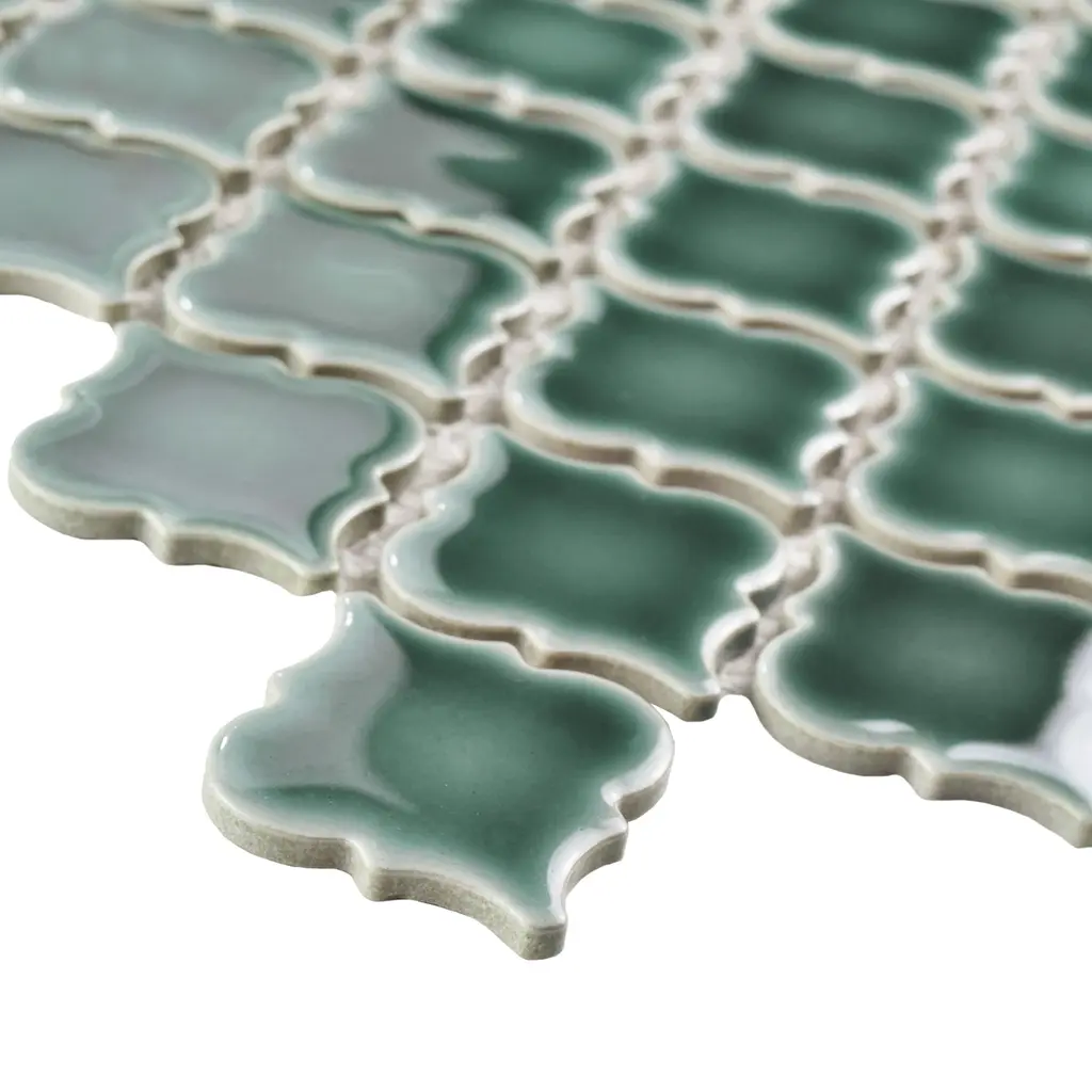 Our Hudson Tangier Emerald Porcelain Mosaic Tile features our popular lantern design with a modern update. Each piece is truly unique, with subtle variations in the blue-green color and the width of the milky border. Its rich reactive glaze echoes the hue in the deep Pacific Ocean, setting up a calming effect for your bath, shower, light-duty floor or backsplash. Impervious, frost-resistant and easy to clean, this tile is a perfect choice on its own or coordinated with other colors in our Hudson series. Tile is the better choice for your space. This tile is made from natural ingredients, making it a healthy choice as it is free from allergens, VOCs, formaldehyde and PVC. 11.0 square feet, 10 pieces per case. Case weight is 21.6 lbs. Grade 1, first-quality porcelain tile for floor and wall use 12.38 in. width x 12.38 in. length x 0.2 in. thick mesh-mounted mosaic Glazed, smooth finish with a high sheen and slight variation in tone PEI Rating II is suitable for all interior walls and light foot traffic such as powder rooms Impervious tiles have a water absorption of less than 0.5% for indoor and outdoor use and are frost resistant This tile is not ADA approved for slip resistance with a DCOF value less than 0.42. Completely frost resistant for indoor or outdoor applications; use a latex-modified thinset for acceptable bond strength Please note: Samples are not returnable