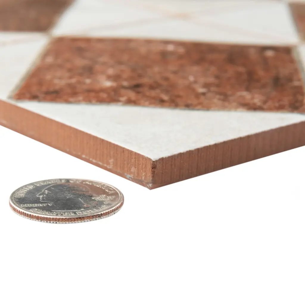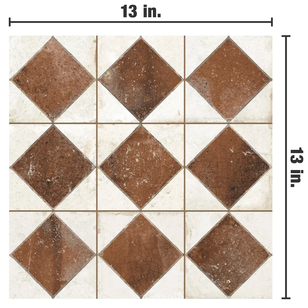 Inspired by a rustic look, our Kings Arles Brown Ceramic Floor and Wall Tile features a mixed textured finish, providing decorative appeal that adapts to a variety of stylistic contexts. Inspired by the nature, culture, and tradition of Provence, capturing the hues of the region, the Kings Arles Collection is unique for its shiny and textured diamonds, and matte and shiny white background. Containing 5 different print variations that are randomly distributed throughout each case, this brown square tile offers a one-of-a-kind look. With its semi-vitreous features, this tile is an ideal selection for indoor residential installations, including kitchens, bathrooms, backsplashes, showers, hallways and fireplace facades. This tile is a perfect choice on its own or paired with other products in the Kings Collection. Tile is the better choice for your space! 12.0 square feet, 10 pieces per case. Case weight is 47.16 lbs. Grade 1, first-quality ceramic tile for floor and wall use 13 in. width x 13 in. length x 0.37 in. thick Glazed, mixed texture with a mixed finish and slight variation in tone PEI Rating III is suitable for medium-duty residential floors including kitchens, halls, corridors, balconies, terraces and areas used more often with normal footwear and small amounts of dirt Semi-Vitreous tiles have water absorption of more than 3% but less than 7% for indoor use This tile has no available COF wet rating. This tile is not ADA approved for slip resistance. Not frost resistant Please note: A sample of this product may be a partial piece cut from the full size tile in order to provide an affordable and convenient way for customers to judge the quality and finish of this item. Samples are not returnable.