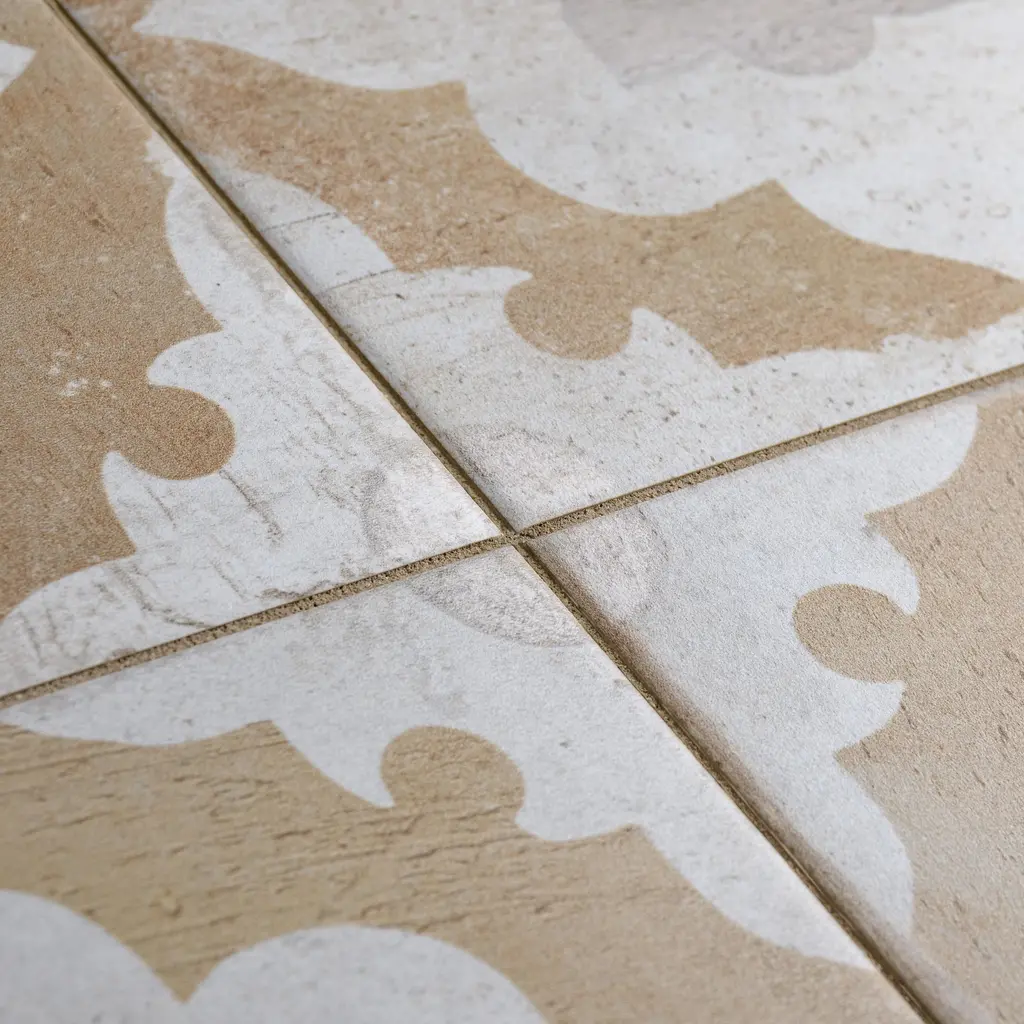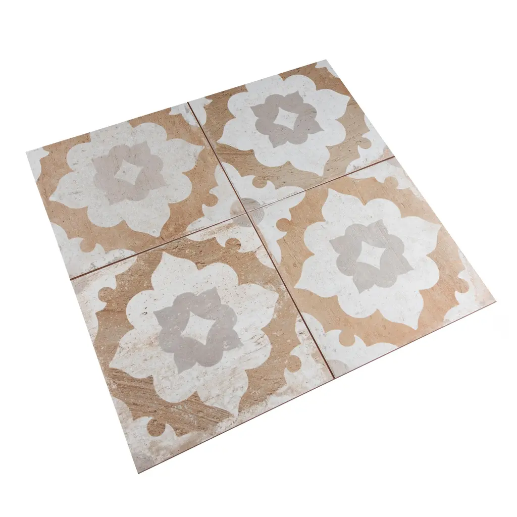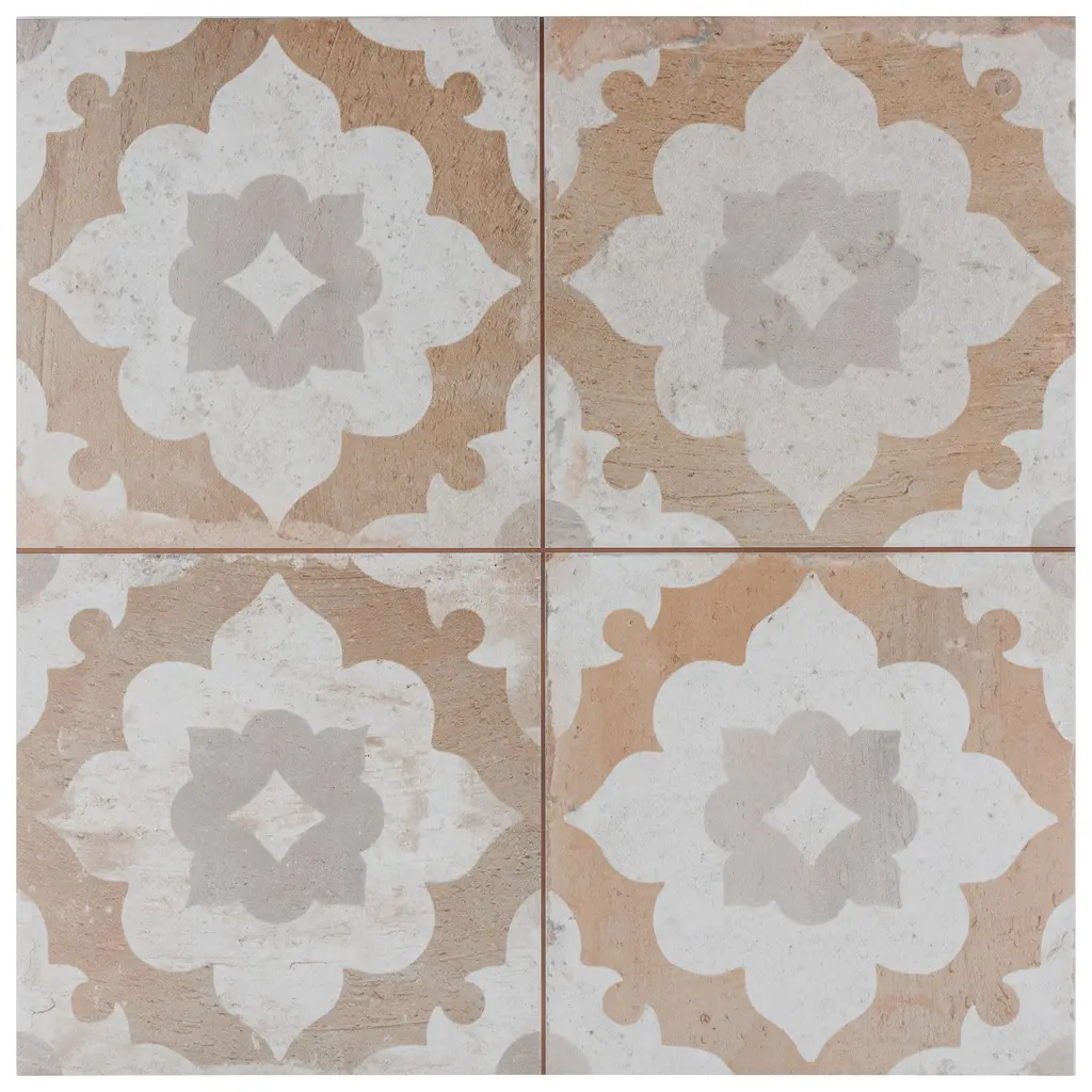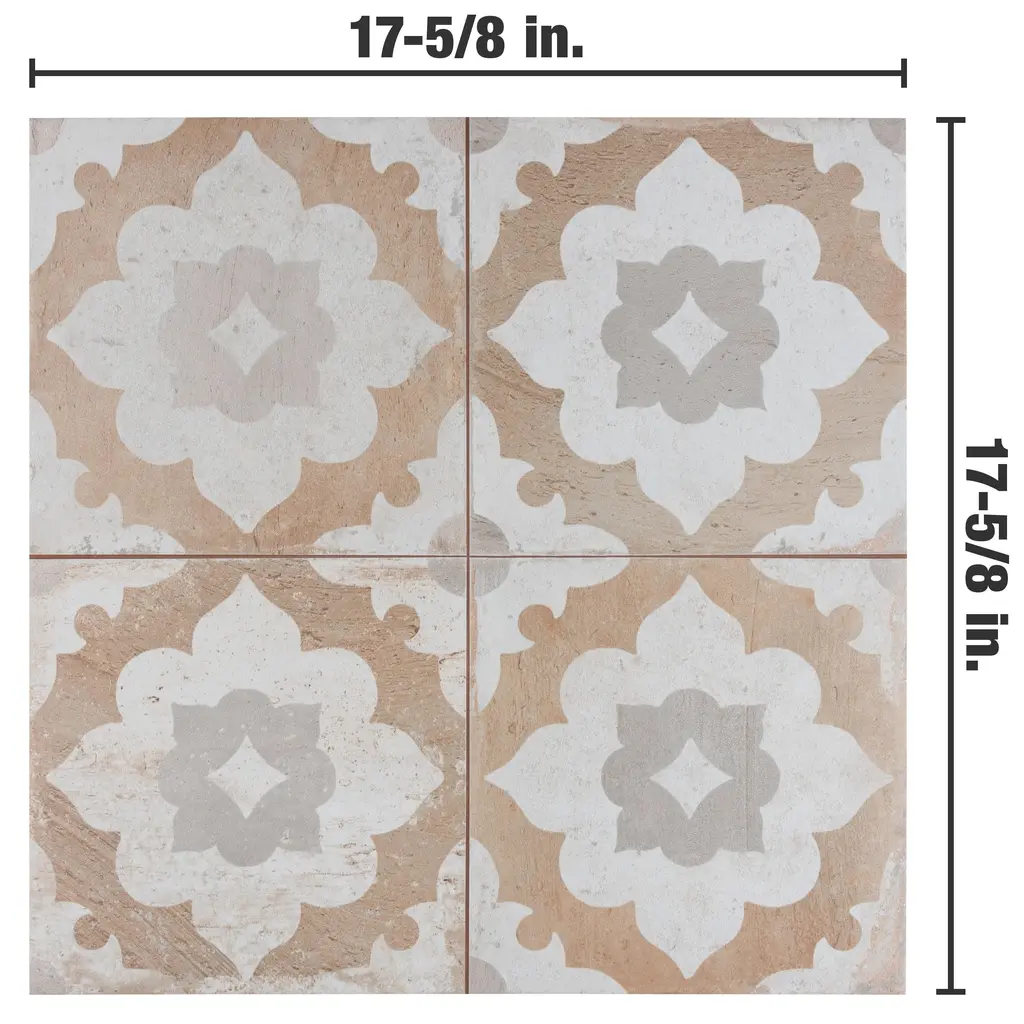 Imported from Spain, our Kings Clay Blossom 17-5/8" x 17-5/8" Ceramic Floor and Wall Tile emulates vintage cement tiles. This hydraulic style floor and wall tile features floral motifs in natural, earth toned shades. Inspired by Vietnamese ceramics and the wabi-sabi philosophy, interior architect and furniture designer, Francisco Segarra, designed this collection to explore the possibilities of clay as a creative and decorative element. Using earth tones, natural textures and a more relaxed vintage aesthetic, this collection generates warm and comfortable interiors, which further reflect the essence of wabi-sabi. Available in 10 print variations that are randomly distributed throughout each case, the variation throughout each tile mimics an authentic aged appearance. Save time and labor spent arranging smaller square tiles and instead install these durable ceramic slabs, which have squares separated by scored grout lines. Its durable and glazed features make this tile an ideal choice for indoor installations including kitchens, bathrooms, backsplashes, showers and entryways. Tile is the better choice for your space. This tile is made from natural ingredients, making it a healthy choice as it is free from allergens, VOCs, formaldehyde and PVC. 11.02 square feet, 5 pieces per case. Case weight is 50.45 lbs. Grade 1, first-quality ceramic tile for floor and wall use. 17.63 in. width x 17.63 in. length x 0.28 in. thick Sample Dimension: A sample of this product may be a partial piece cut from the full size tile in order to provide an affordable and convenient way for customers to judge the quality and finish of this item. Glazed smooth finish with a low sheen and substantial variation in tone P.E.I. Rating III is suitable for medium-duty residential floors including kitchens, halls, corridors, balconies, terraces and areas used more often with normal footwear and small amounts of dirt Semi-Vitreous tiles have water absorption of more than 3% but less than 7% for indoor use Not frost resistant Residential use only
