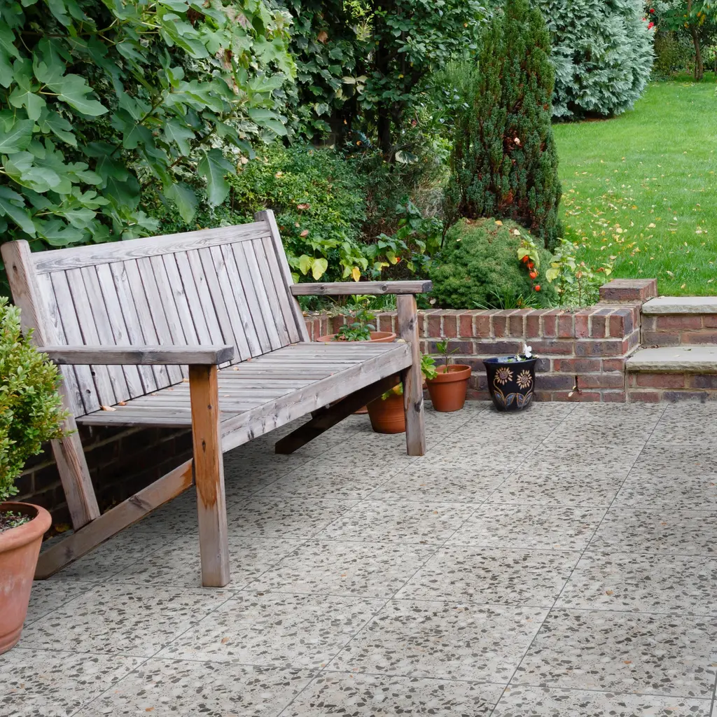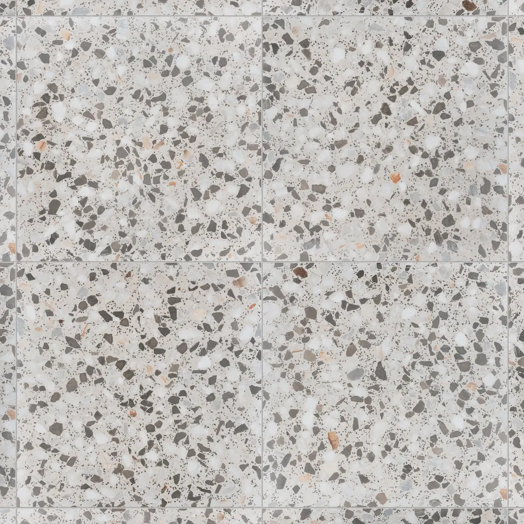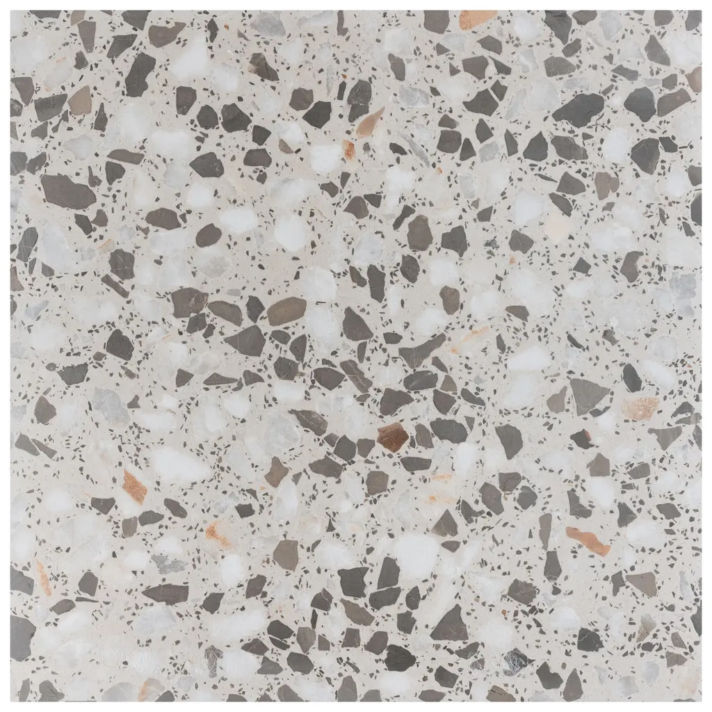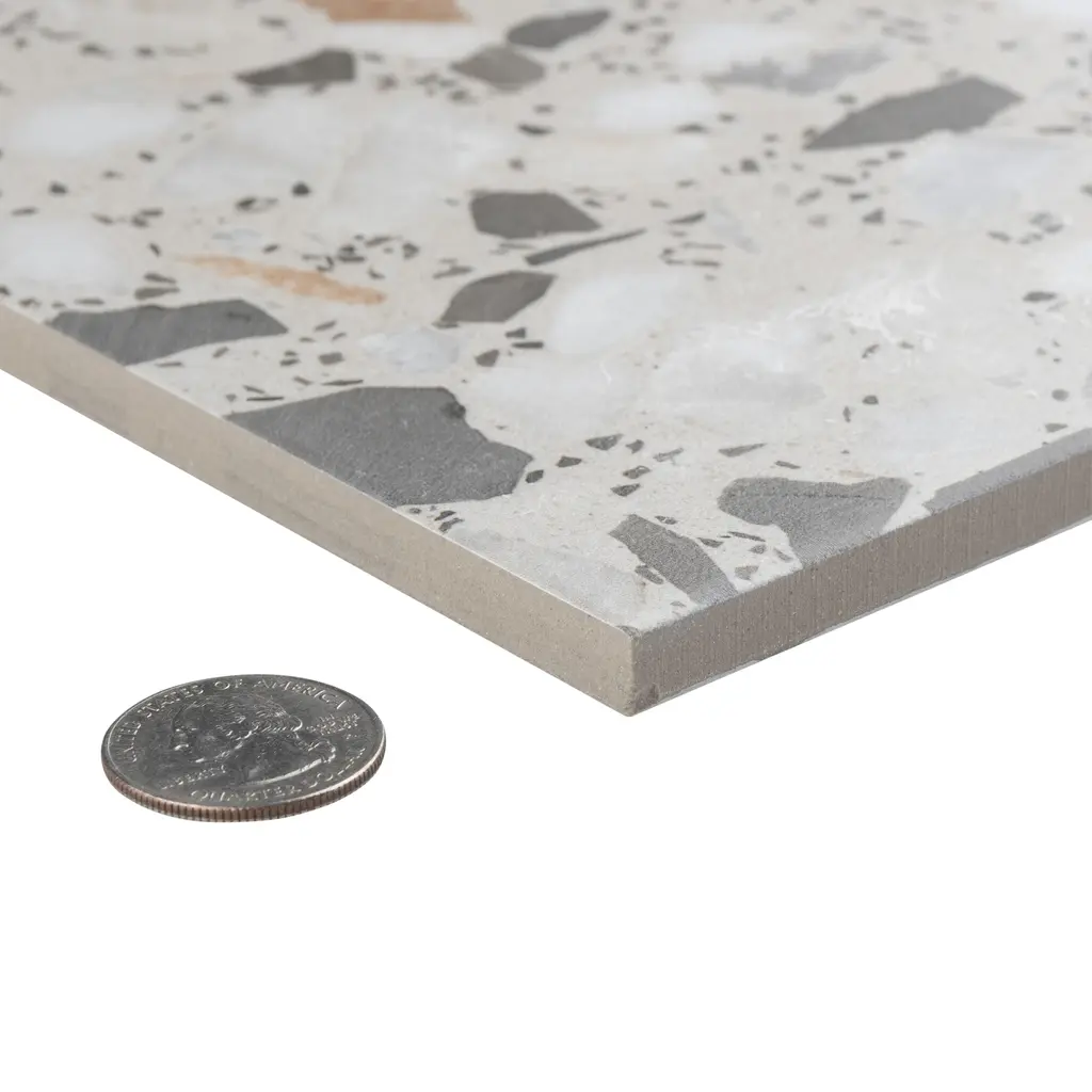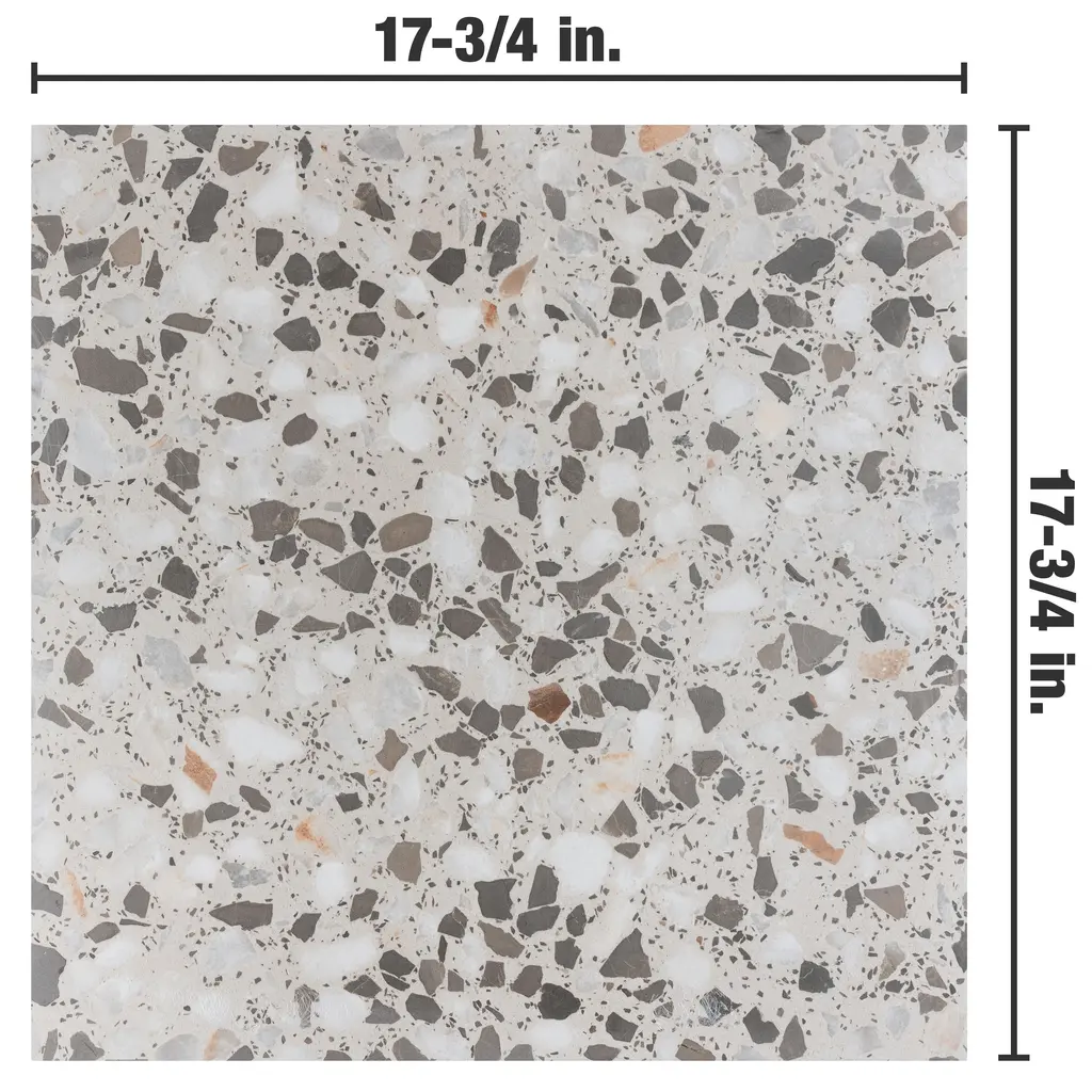 Replicating the appearance of small stone-like materials set in concrete, our Kings Ofelia Porcelain Floor and Wall Tile offers a new take on a classic style. This porcelain tile features speckled pattern variations in warm earthy tones that are set on a soft grey base glaze, offering subtle contrast and dimension to the design. The smooth, matte surface features a weathered, mottled look, replicating the beauty of aged stone-look tile. This terrazzo-look tile is visually appealing and versatile and blends particularly well with industrial, 1950s and vintage design styles. Its impervious, frost-resist, and durable features make it an ideal choice for both commercial and residential indoor and outdoor installations including kitchens, bathrooms, backsplashes, showers, entryways, and patios. Tile is the better choice for your space. This tile is made from natural ingredients, making it a healthy choice as it is free from allergens, VOCs, formaldehyde, and PVC. 11.1 square feet, 5 pieces per case. Case weight is 51.18 lbs. Grade 1, first-quality porcelain tile for floor and wall use 17.75 in. width x 17.75 in. length x 0.4 in. thick Glazed, smooth finish with a low sheen and uniform appearance in tone PEI Rating IV has high resistance to abrasion and is suitable for heavy-duty residential and commercial kitchens, hotels, exhibition and sales rooms with some dirt conditions Impervious tiles have a water absorption of less than 0.5% for indoor and outdoor use and are frost resistant This tile is ADA approved for slip resistance with a DCOF value of 0.42 or higher. Completely frost resistant for indoor or outdoor applications; use a latex-modified thinset for acceptable bond strength Please note: A sample of this product may be a partial piece cut from the full size tile in order to provide an affordable and convenient way for customers to judge the quality and finish of this item. Samples are not returnable.