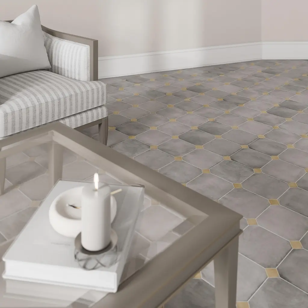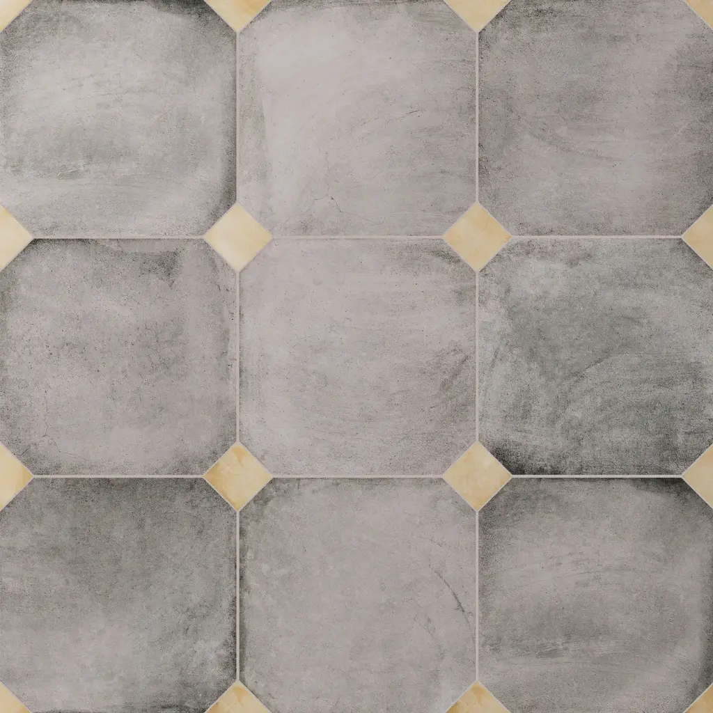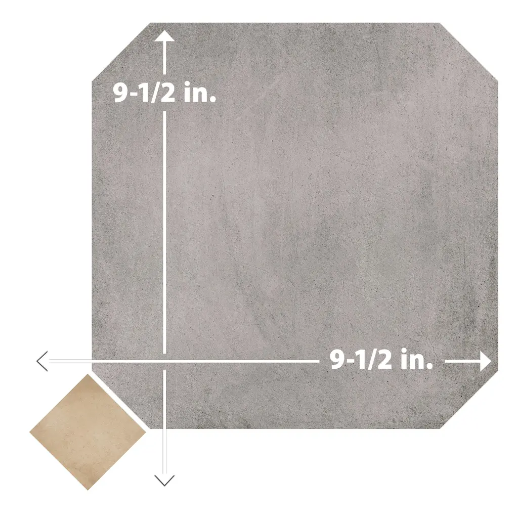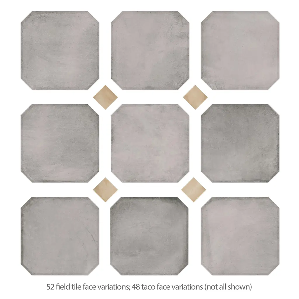 Offering a cement look, our Laverton Octagon Gris with Taco Beige Porcelain Floor and Wall Tile features a smooth, matte finish, providing decorative appeal that adapts to a variety of stylistic contexts. Inspired by Laverton's quaint stone cottages and picturesque hills, this collection's matte finish, slight undulation, and versatile colors create a unique blend of rustic charm and timeless elegance, transforming your space into a cozy haven reminiscent of the English countryside. Containing 52 different print variations that are randomly distributed throughout each case, this gray specialty tile offers a one-of-a-kind look. With its impervious, frost-resistant features, this tile is an ideal selection for a variety of spaces including indoor and outdoor residential installations, kitchens, bathrooms, backsplashes, showers, hallways, pools and fireplace facades. Discover more products from the Merola Tile Laverton Collection to complete your design. To ensure optimal results, please consult with your installer and review the product specifications to confirm that this tile meets the specific needs of your project. 11.25 square feet, 50 pieces per case. Case weight is 41.72 lbs. Grade 1, first-quality porcelain tile for floor and wall use This kit includes a total of 50 pieces, featuring a variety of components in different sizes and shapes - refer to the images for installation inspiration and ideas Glazed, smooth finish with a low sheen and moderate variation in tone PEI Rating III is suitable for medium-duty residential floors including kitchens, halls, corridors, balconies, terraces and areas used more often with normal footwear and small amounts of dirt Impervious tiles have a water absorption of less than 0.5% for indoor and outdoor use and are frost resistant This tile is ADA approved for slip resistance with a DCOF value of 0.42 or higher. Completely frost resistant for indoor or outdoor applications; use a latex-modified thinset for acceptable bond strength Please note: A sample of this product may be a partial piece cut from the full size tile in order to provide an affordable and convenient way for customers to judge the quality and finish of this item. Samples are not returnable.
