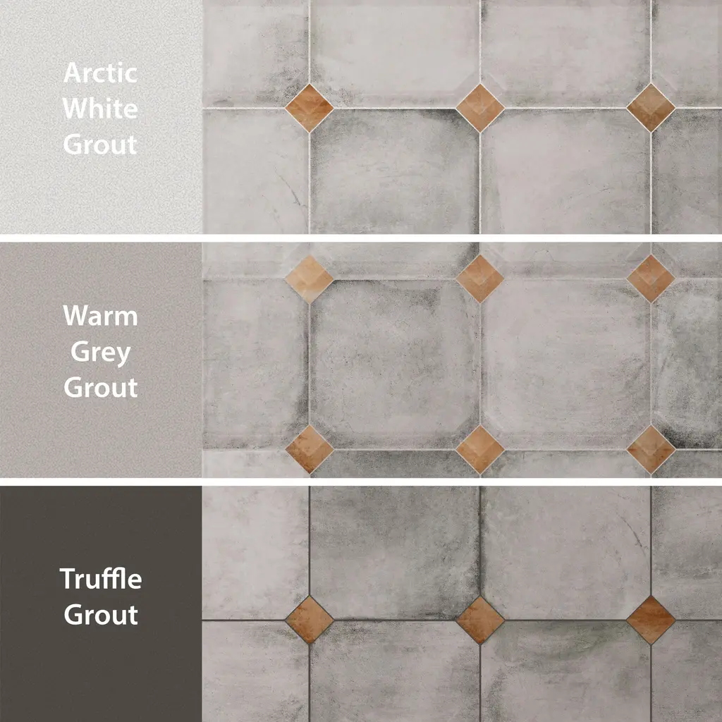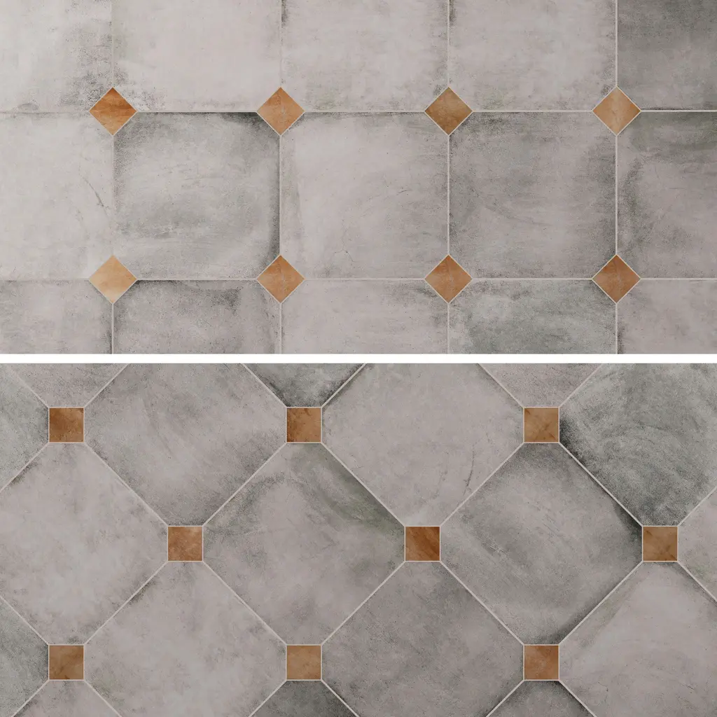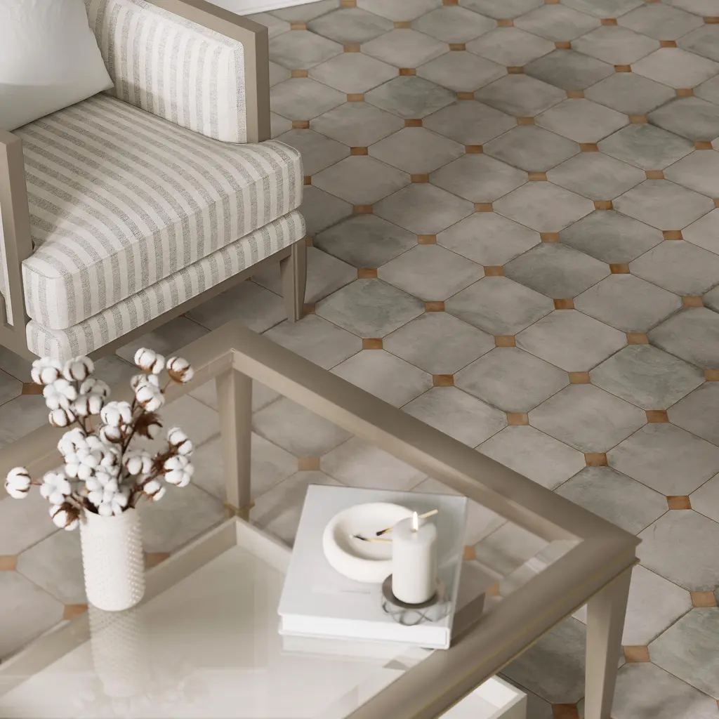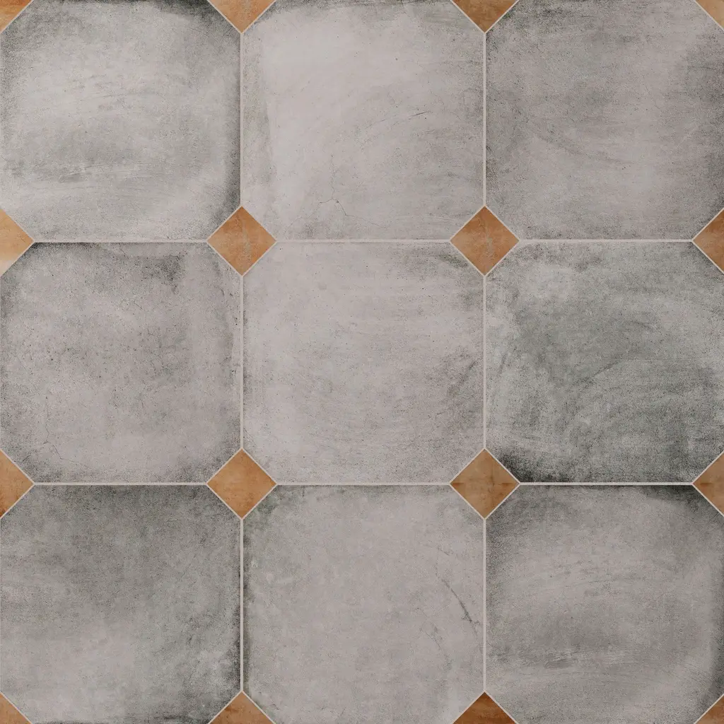 Offering a cement look, our Laverton Octagon Gris with Taco Natural Porcelain Floor and Wall Tile features a smooth, matte finish, providing decorative appeal that adapts to a variety of stylistic contexts. Inspired by Laverton's quaint stone cottages and picturesque hills, this collection's matte finish, slight undulation, and versatile colors create a unique blend of rustic charm and timeless elegance, transforming your space into a cozy haven reminiscent of the English countryside. Containing 52 different print variations that are randomly distributed throughout each case, this gray specialty tile offers a one-of-a-kind look. With its impervious, frost-resistant features, this tile is an ideal selection for a variety of spaces including indoor and outdoor residential installations, kitchens, bathrooms, backsplashes, showers, hallways, pools and fireplace facades. Discover more products from the Merola Tile Laverton Collection to complete your design. To ensure optimal results, please consult with your installer and review the product specifications to confirm that this tile meets the specific needs of your project. 11.25 square feet, 50 pieces per case. Case weight is 41.72 lbs. Grade 1, first-quality porcelain tile for floor and wall use This kit includes a total of 50 pieces, featuring a variety of components in different sizes and shapes - refer to the images for installation inspiration and ideas Glazed, smooth finish with a low sheen and moderate variation in tone PEI Rating III is suitable for medium-duty residential floors including kitchens, halls, corridors, balconies, terraces and areas used more often with normal footwear and small amounts of dirt Impervious tiles have a water absorption of less than 0.5% for indoor and outdoor use and are frost resistant This tile is ADA approved for slip resistance with a DCOF value of 0.42 or higher. Completely frost resistant for indoor or outdoor applications; use a latex-modified thinset for acceptable bond strength Please note: A sample of this product may be a partial piece cut from the full size tile in order to provide an affordable and convenient way for customers to judge the quality and finish of this item. Samples are not returnable.