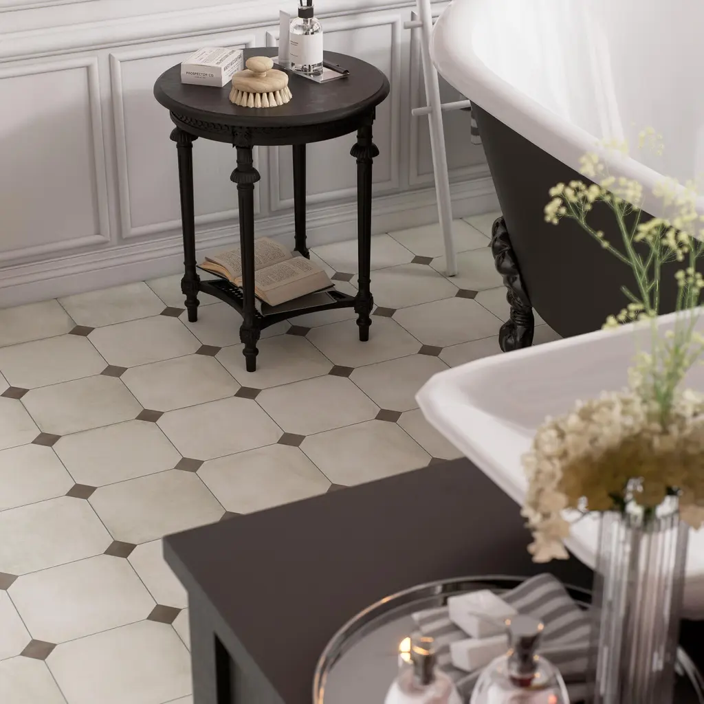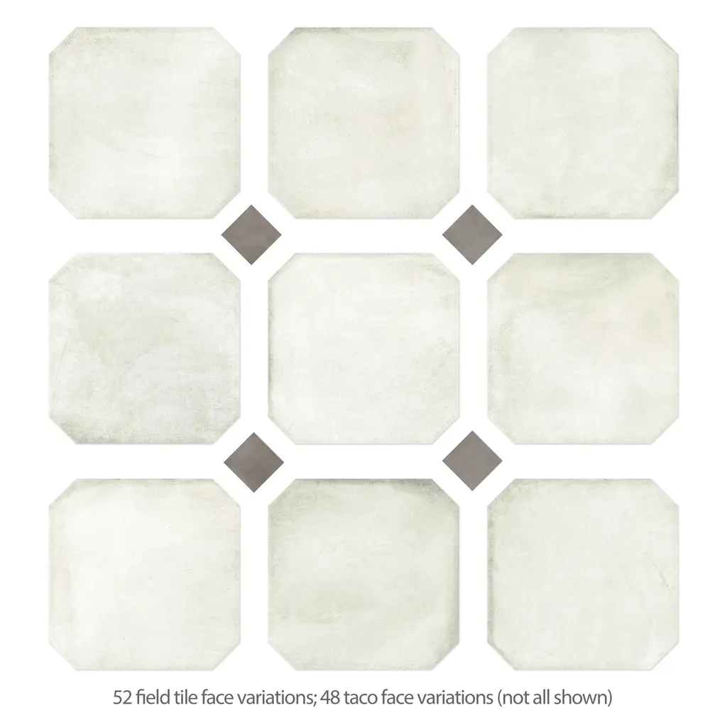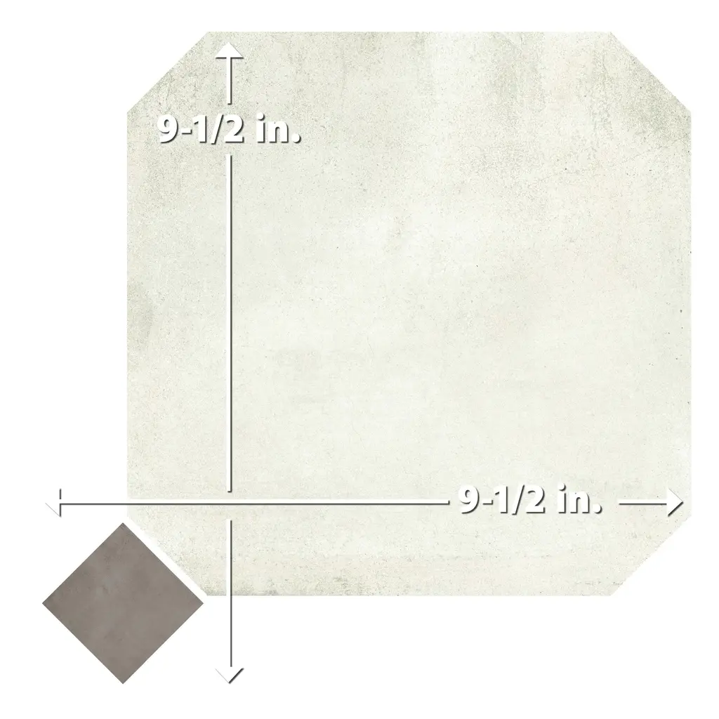 Offering a cement look, our Laverton Octagon Nieve with Taco Grafito Porcelain Floor and Wall Tile features a smooth, matte finish, providing decorative appeal that adapts to a variety of stylistic contexts. Inspired by Laverton's quaint stone cottages and picturesque hills, this collection's matte finish, slight undulation, and versatile colors create a unique blend of rustic charm and timeless elegance, transforming your space into a cozy haven reminiscent of the English countryside. Containing 52 different print variations that are randomly distributed throughout each case, this light gray specialty tile offers a one-of-a-kind look. With its impervious, frost-resistant features, this tile is an ideal selection for a variety of spaces including indoor and outdoor residential installations, bathrooms, backsplashes, showers, hallways, pools and fireplace facades. Discover more products from the Merola Tile Laverton Collection to complete your design. To ensure optimal results, please consult with your installer and review the product specifications to confirm that this tile meets the specific needs of your project. 11.25 square feet, 50 pieces per case. Case weight is 41.72 lbs. Grade 1, first-quality porcelain tile for floor and wall use This kit includes a total of 50 pieces, featuring a variety of components in different sizes and shapes - refer to the images for installation inspiration and ideas Glazed, smooth finish with a low sheen and moderate variation in tone PEI Rating II is suitable for all interior walls and light foot traffic such as powder rooms Impervious tiles have a water absorption of less than 0.5% for indoor and outdoor use and are frost resistant This tile is ADA approved for slip resistance with a DCOF value of 0.42 or higher. Completely frost resistant for indoor or outdoor applications; use a latex-modified thinset for acceptable bond strength Please note: A sample of this product may be a partial piece cut from the full size tile in order to provide an affordable and convenient way for customers to judge the quality and finish of this item. Samples are not returnable.