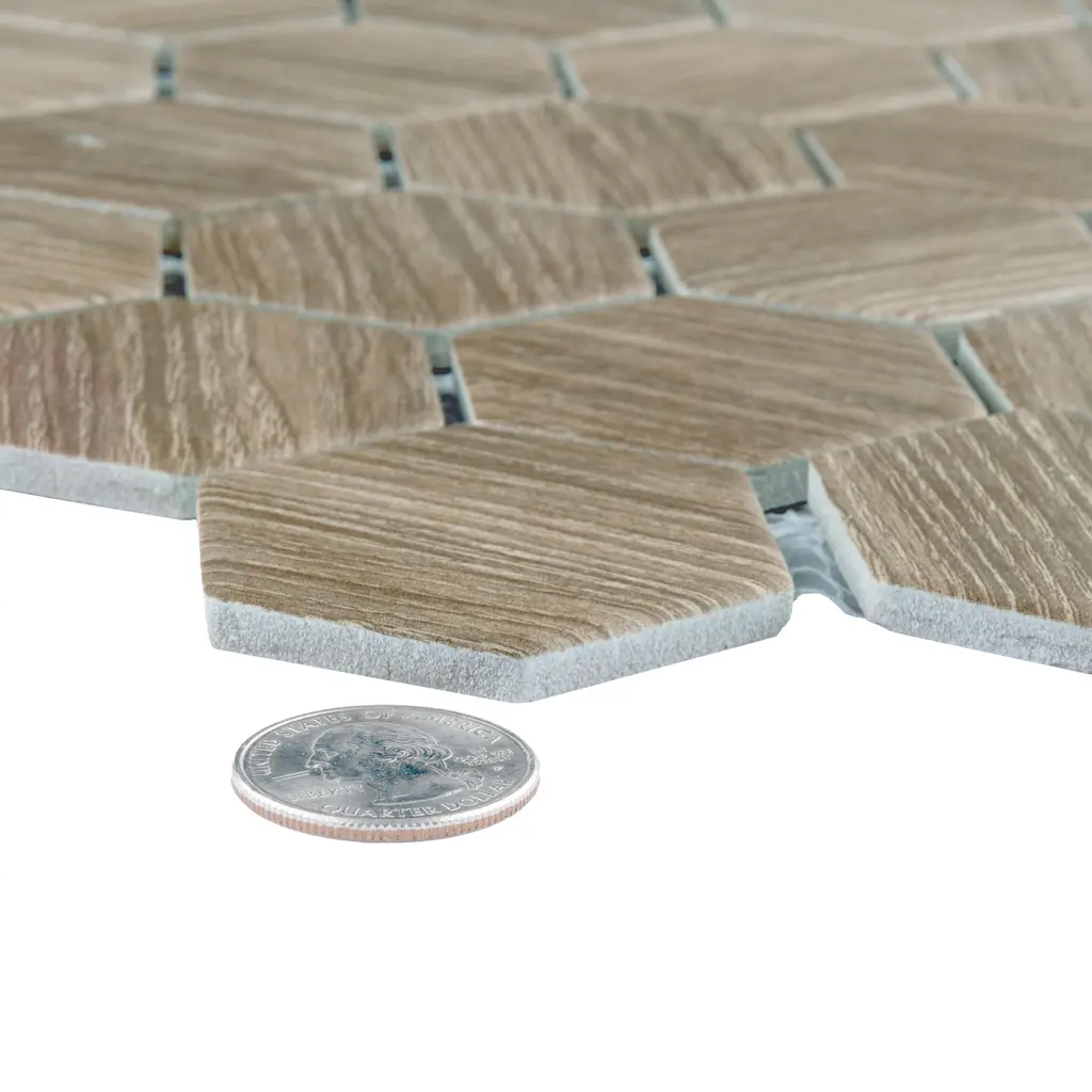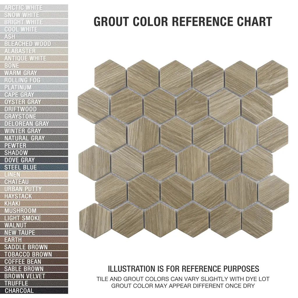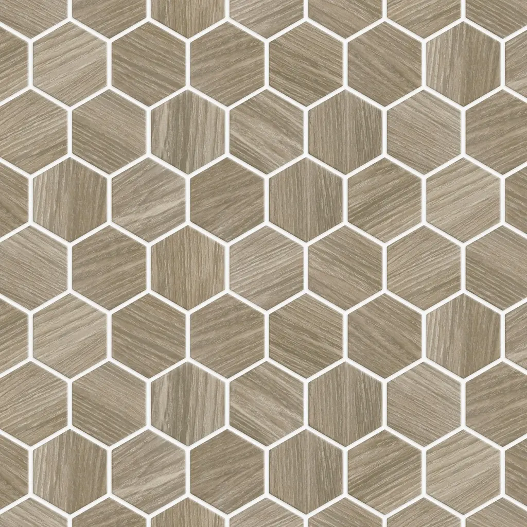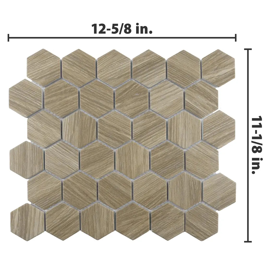 Offering a mosaic look, our Llama 2 in. Hex Matte Noce Porcelain Floor and Wall Tile features a slightly textured, matte finish, providing decorative appeal that adapts to a variety of stylistic contexts. With its impervious, frost-resistant features, this brown hexagon mosaic is an ideal selection for both indoor and outdoor residential installations, including bathrooms, backsplashes, showers, hallways and fireplace facades. This tile is a perfect choice on its own or paired with other products in the Llama Collection. Tile is the better choice for your space! 10.0 square feet, 10 pieces per case. Case weight is 23.37 lbs. Grade 1, first-quality porcelain tile for floor and wall use 11.13 in. width x 12.63 in. length x 0.22 in. thick mesh-mounted mosaic Glazed, slightly textured finish with a low sheen and uniform appearance in tone PEI Rating II is suitable for all interior walls and light foot traffic such as powder rooms Impervious tiles have a water absorption of less than 0.5% for indoor and outdoor use and are frost resistant This tile is ADA approved for slip resistance with a DCOF value of 0.42 or higher. Completely frost resistant for indoor or outdoor applications; use a latex-modified thinset for acceptable bond strength Please note: A sample of this product may be a partial piece cut from the full size tile in order to provide an affordable and convenient way for customers to judge the quality and finish of this item. Samples are not returnable.