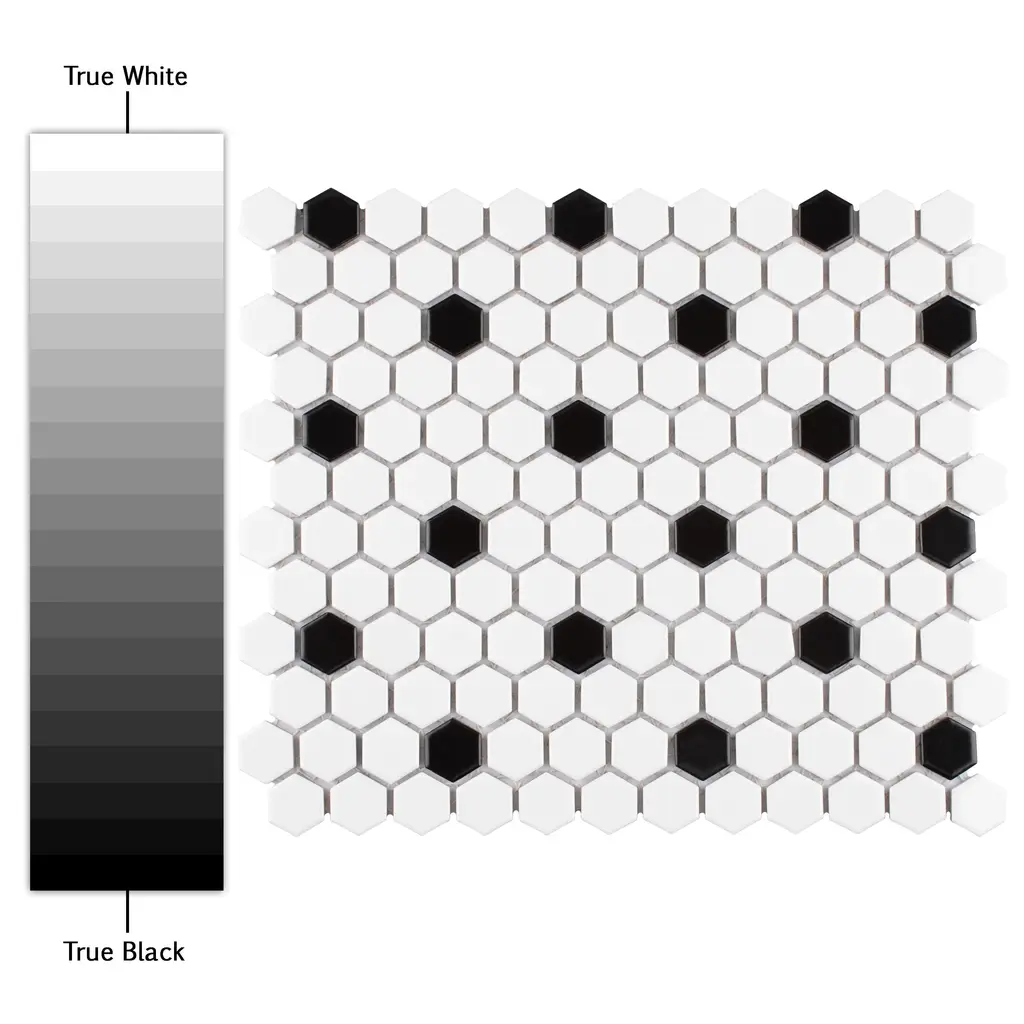 Transform your home into a tribute to retro design with the Madison Hex Matte Cool White with Black Dot 10-1/4 in. x 11-7/8 in. x 6mm Porcelain Mosaic Tile. This time-tested classic 1 in. hexagon chip mosaic is a throwback to traditional retro design. Matte cool white hexagons are accented by contrasting matte black hexagons precisely arranged on an interlocking mesh to create a seamless installation. This hardy, easy-to-clean tile is frost resistant, making it ideal for your light-traffic spaces whether they're indoors or out. 619.2 square feet, 720 pieces per pallet. Pallet weight is 1292 lbs. Grade 1, first-quality porcelain tile for floor and wall use. 10.25 in. width x 11.88 in. length x 0.25 in. thick Sample Dimension: A sample of this product may be a partial piece cut from the full size tile in order to provide an affordable and convenient way for customers to judge the quality and finish of this item. Glazed smooth finish with a medium sheen and uniform appearance in tone P.E.I. Rating II has high resistance to abrasion and is suitable for heavy-duty residential and commercial kitchens, hotels, exhibition and sales rooms with some dirt conditions all interior walls and light foot traffic such as powder rooms Impervious tiles have a water absorption of less than 0.5% for indoor and outdoor use and is frost resistant C.O.F. less than or equal to .5 is considered to have a marginally low skid resistance. Completely frost resistant for indoor or outdoor applications; use a latex-modified thinset for acceptable bond strength Residential use onlyPlease note: A sample of this product may be a partial piece cut from the full size tile in order to provide an affordable and convenient way for customers to judge the quality and finish of this item. Samples are not returnable.