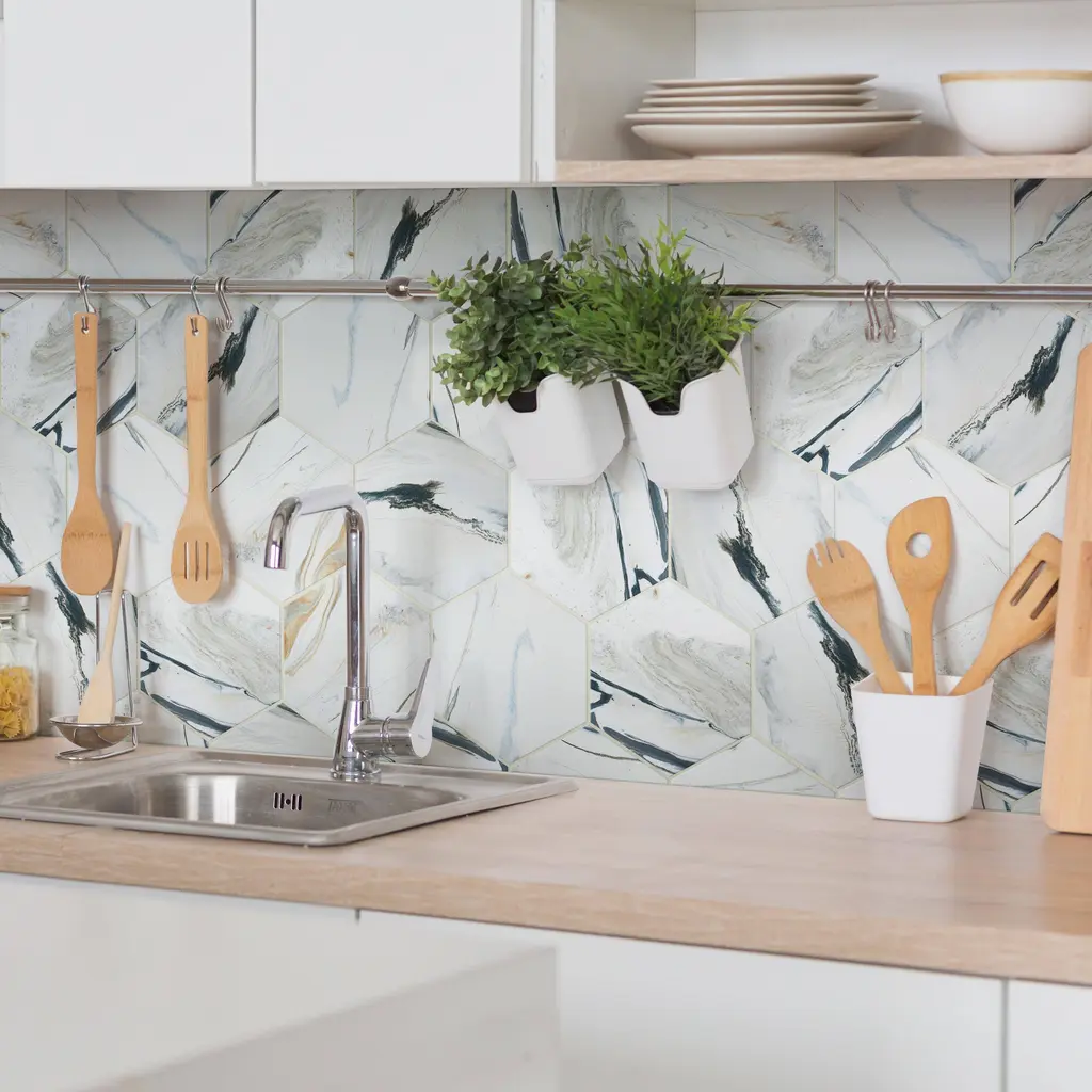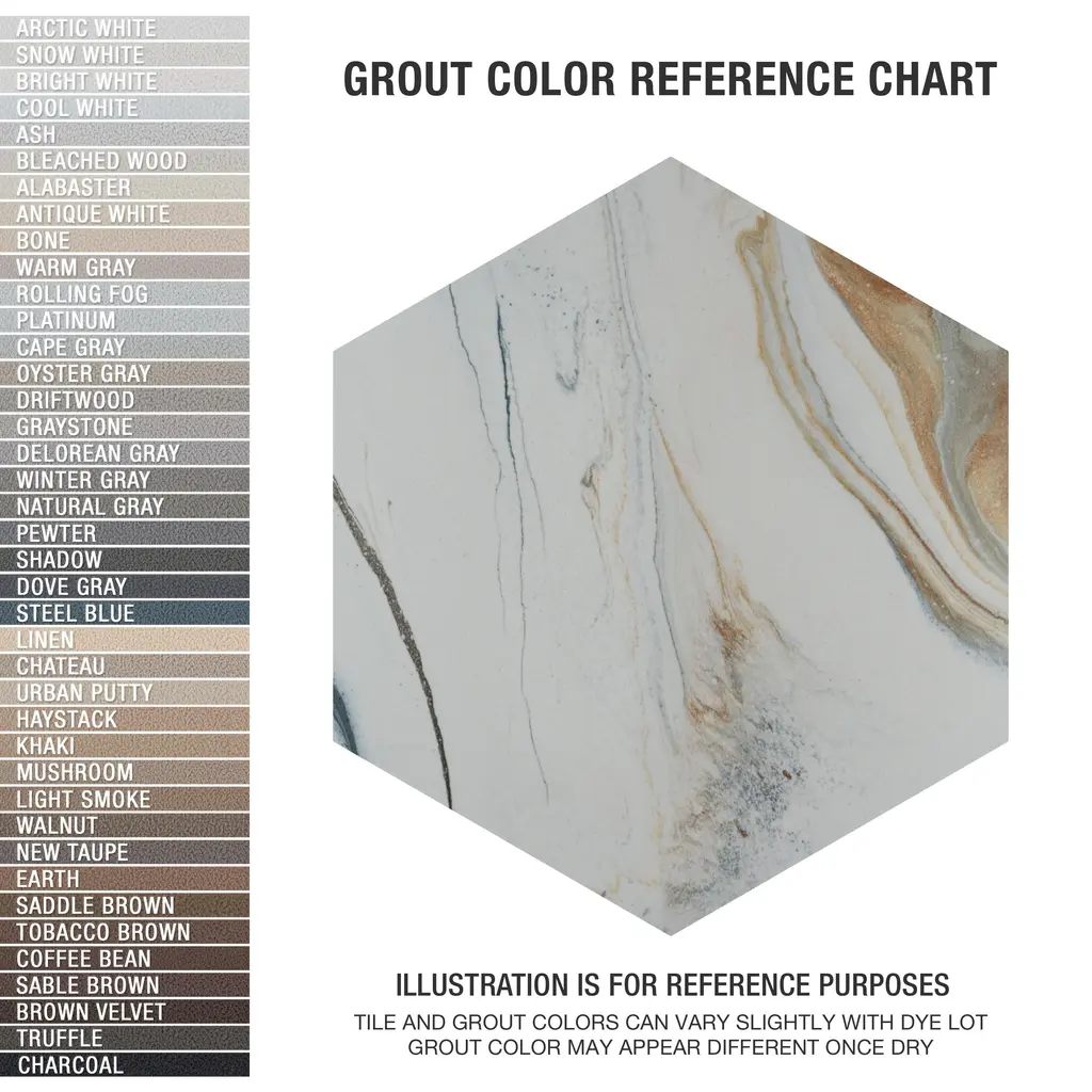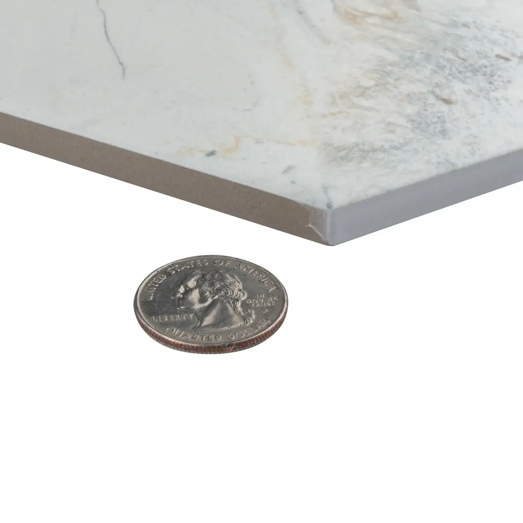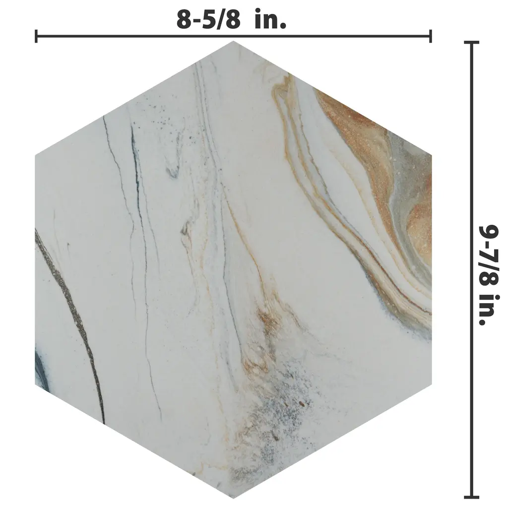 Capturing the appearance of a marble look, our Marmaris Hex Sunset Porcelain Floor and Wall Tile features a smooth, matte finish, providing decorative appeal that adapts to a variety of stylistic contexts. Containing 29 different print variations that are randomly distributed throughout each case, this white hexagon tile offers a one-of-a-kind look. With its impervious, frost-resistant features, this tile is an ideal selection for both indoor and outdoor commercial and residential installations, including kitchens, bathrooms, backsplashes, showers, hallways, entryways, patios and fireplace facades. This tile is a perfect choice on its own or paired with other products in the Marmaris Collection. Tile is the better choice for your space! 11.5 square feet, 25 pieces per case. Case weight is 50.64 lbs. Grade 1, first-quality porcelain tile for floor and wall use 8.63 in. width x 9.88 in. length x 0.39 in. thick Glazed, smooth finish with a low sheen and random variation in tone PEI Rating IV has high resistance to abrasion and is suitable for heavy-duty residential and commercial kitchens, hotels, exhibition and sales rooms with some dirt conditions Impervious tiles have a water absorption of less than 0.5% for indoor and outdoor use and are frost resistant This tile is ADA approved for slip resistance with a DCOF value of 0.42 or higher. Completely frost resistant for indoor or outdoor applications; use a latex-modified thinset for acceptable bond strength Please note: A sample of this product may be a partial piece cut from the full size tile in order to provide an affordable and convenient way for customers to judge the quality and finish of this item. Samples are not returnable.